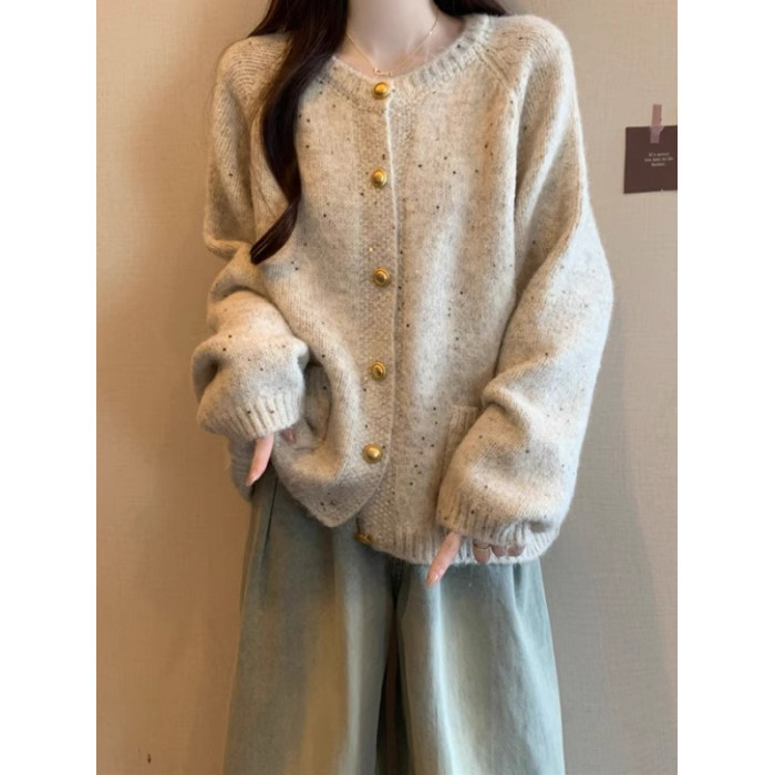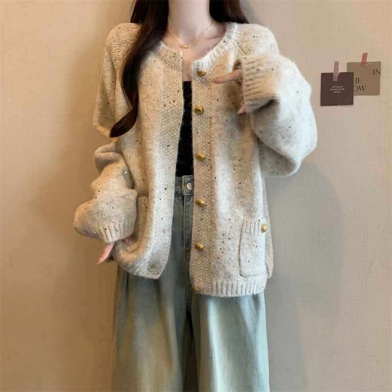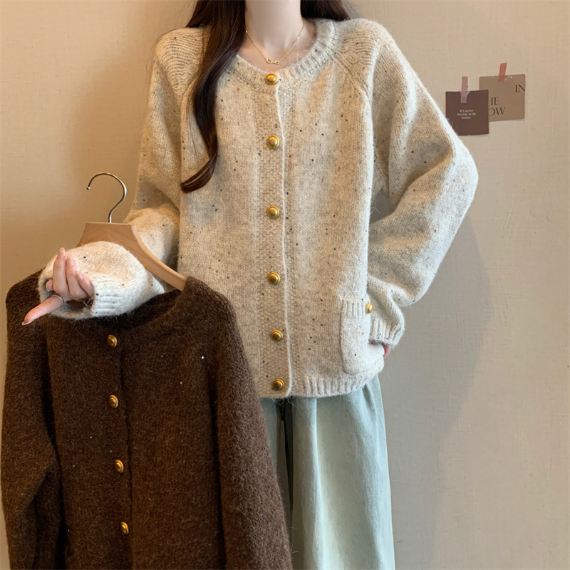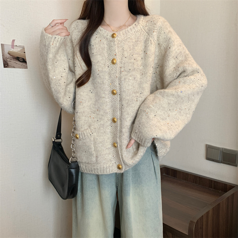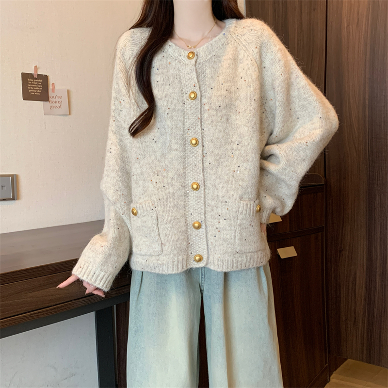 韓系慵懶風彩點毛衣外套女2024秋冬新款大碼胖mm金釦針織開衫上衣