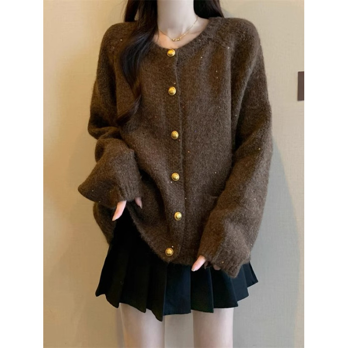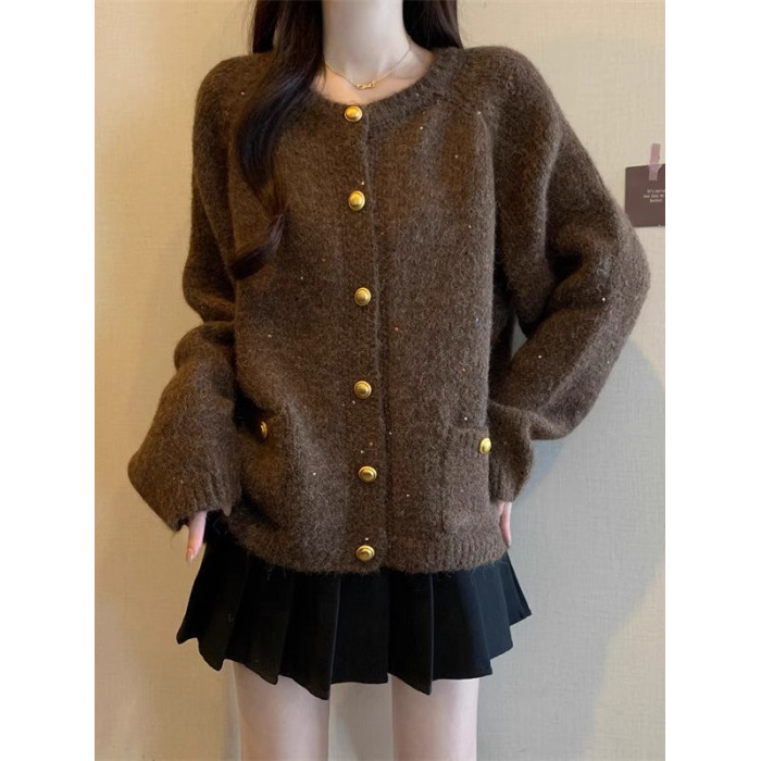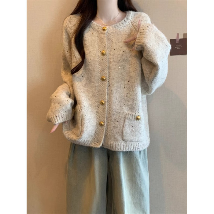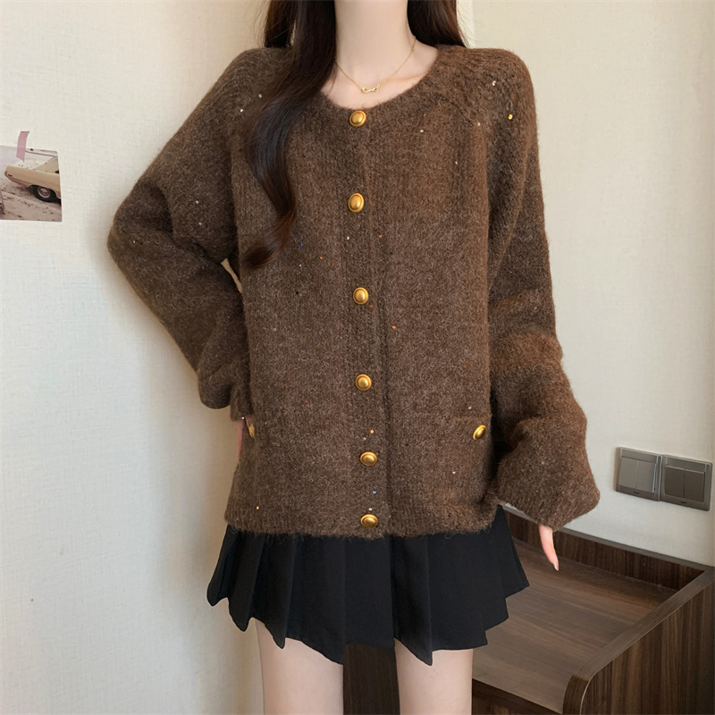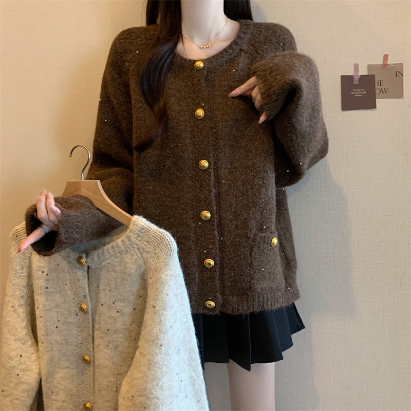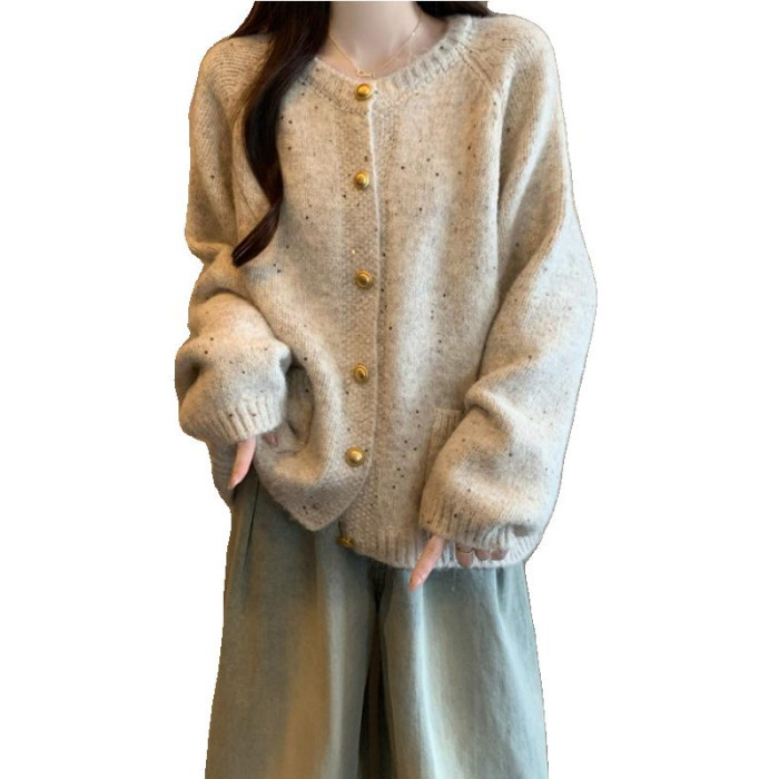 韓系慵懶風彩點毛衣外套女2024秋冬新款大碼胖mm金釦針織開衫上衣