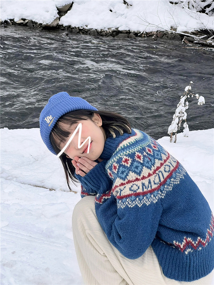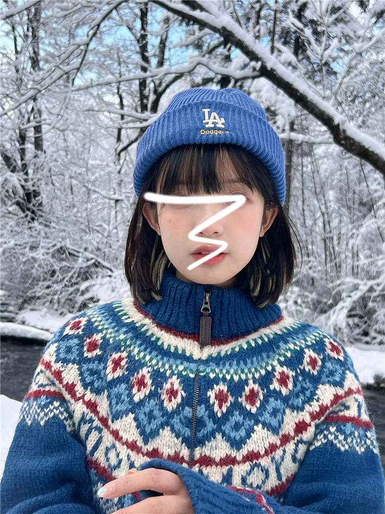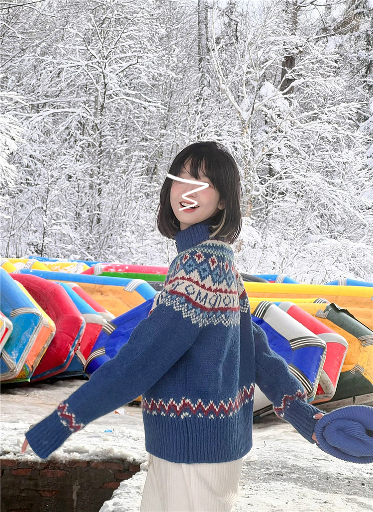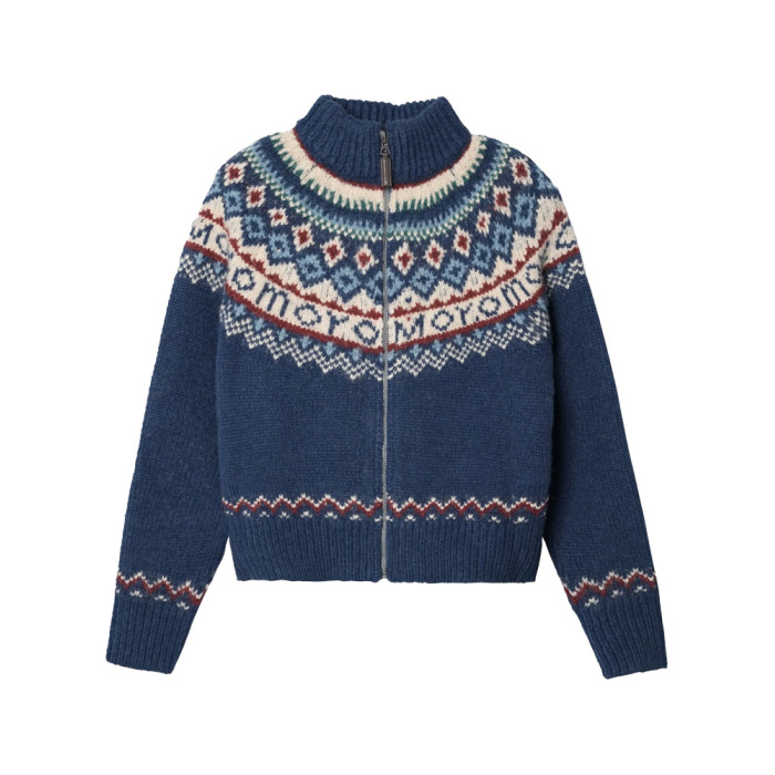 費爾島拉鍊慵懶風藍色毛衣外套女秋冬季2025新款復古針織開衫上衣