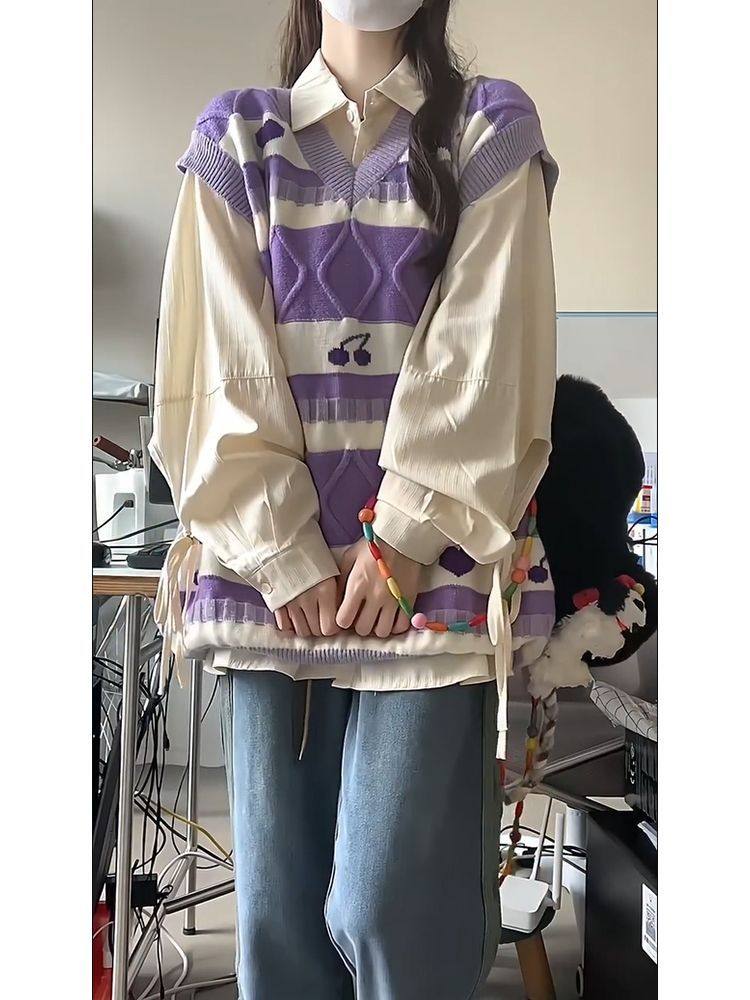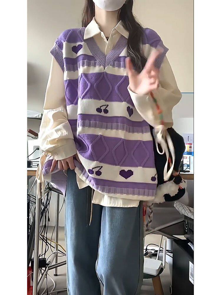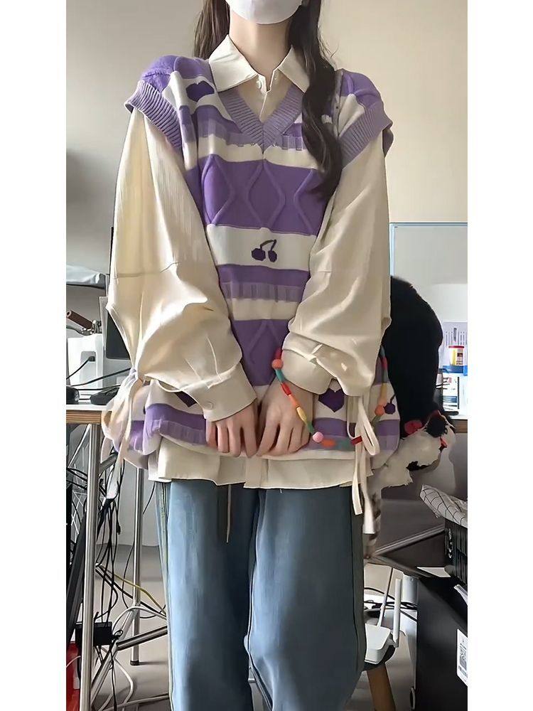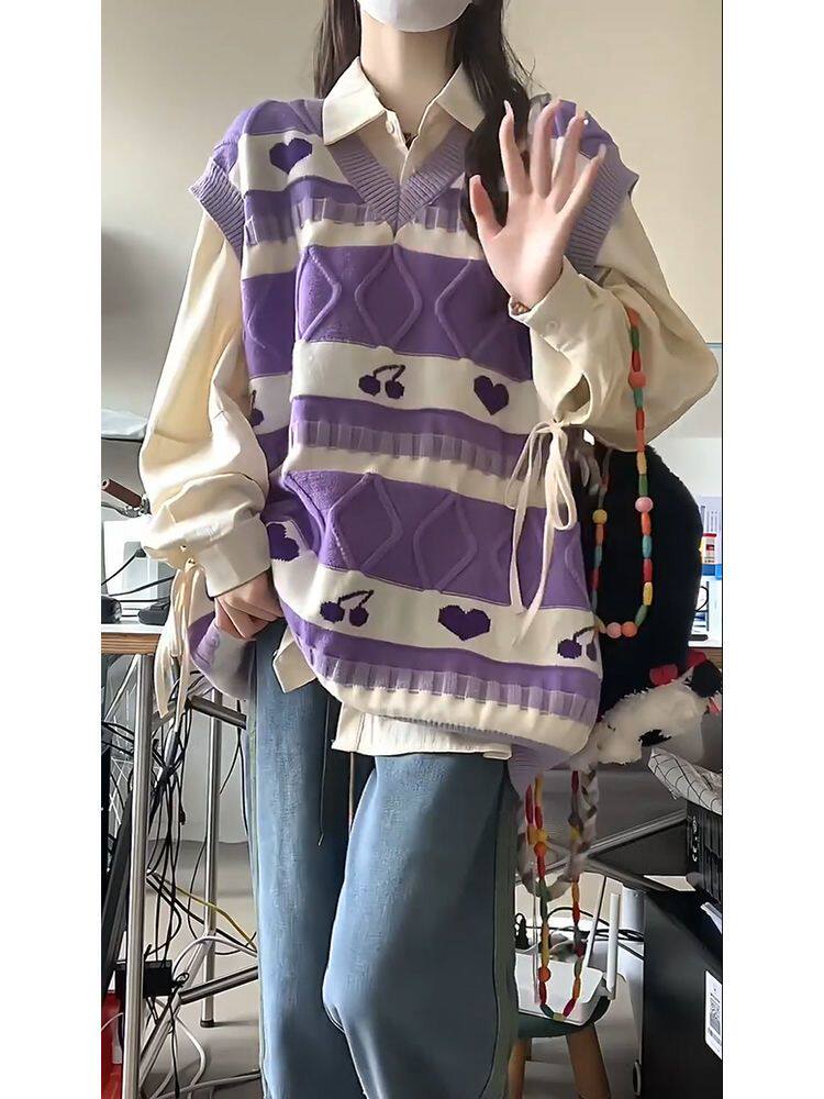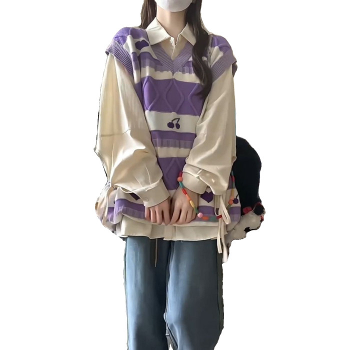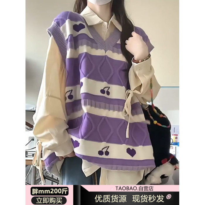 胖MM200斤特大碼日系紫色百搭針織馬甲背心ins寬松曡穿襯衫兩件套