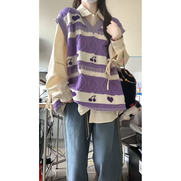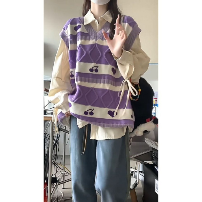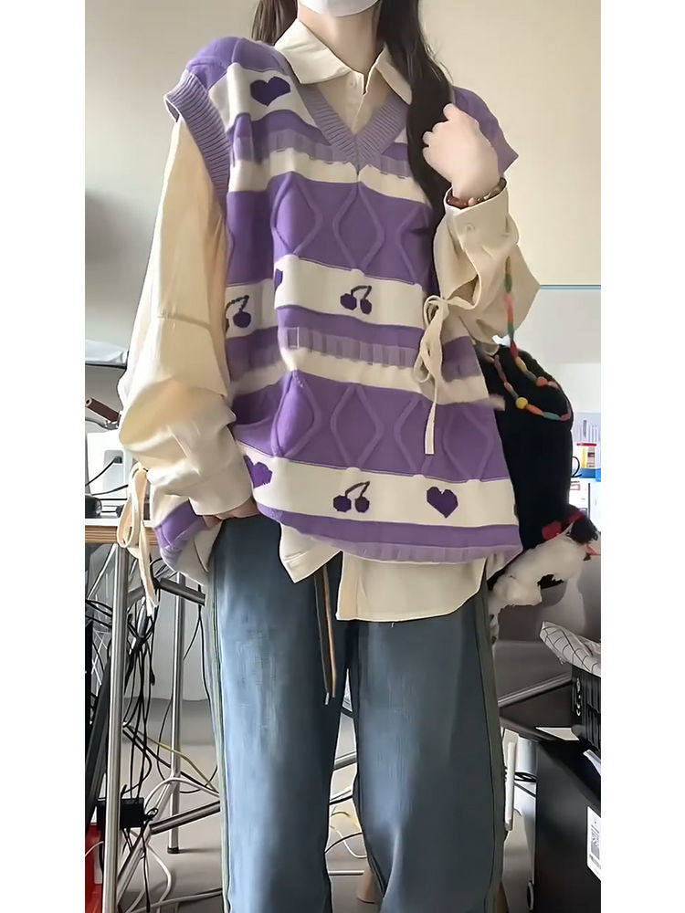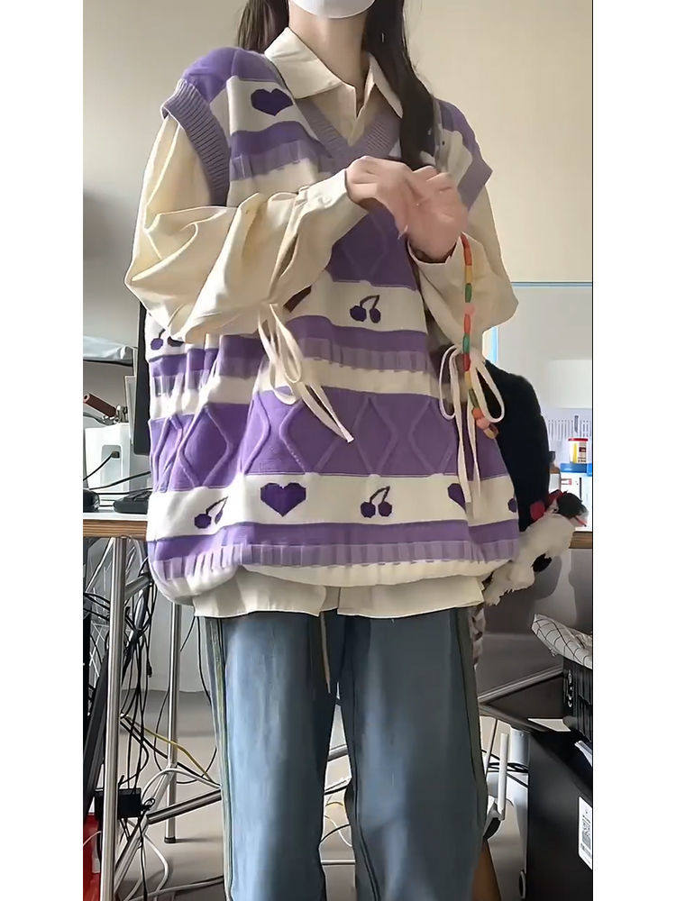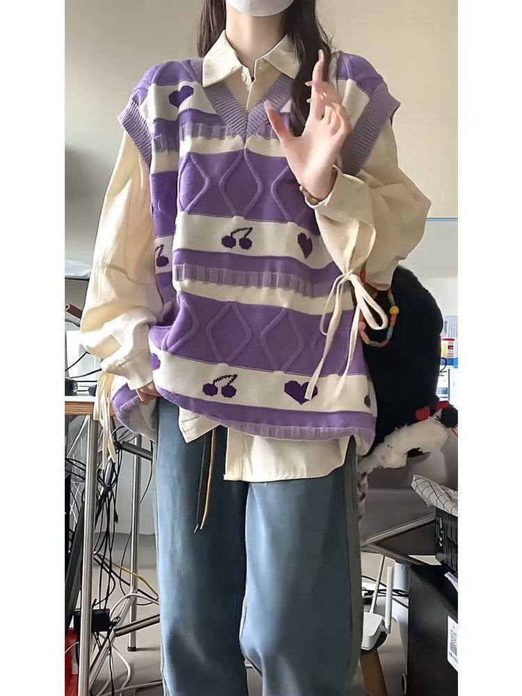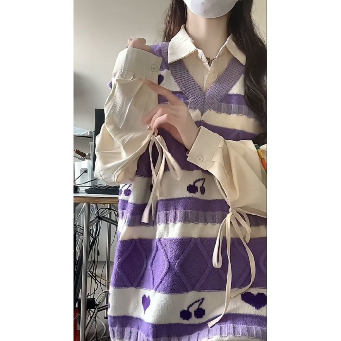 胖MM200斤特大碼日系紫色百搭針織馬甲背心ins寬松曡穿襯衫兩件套