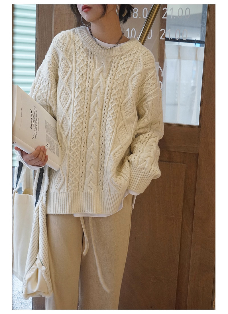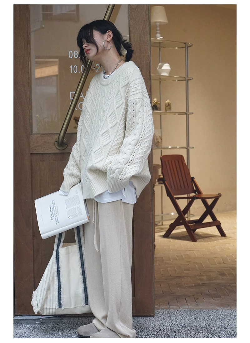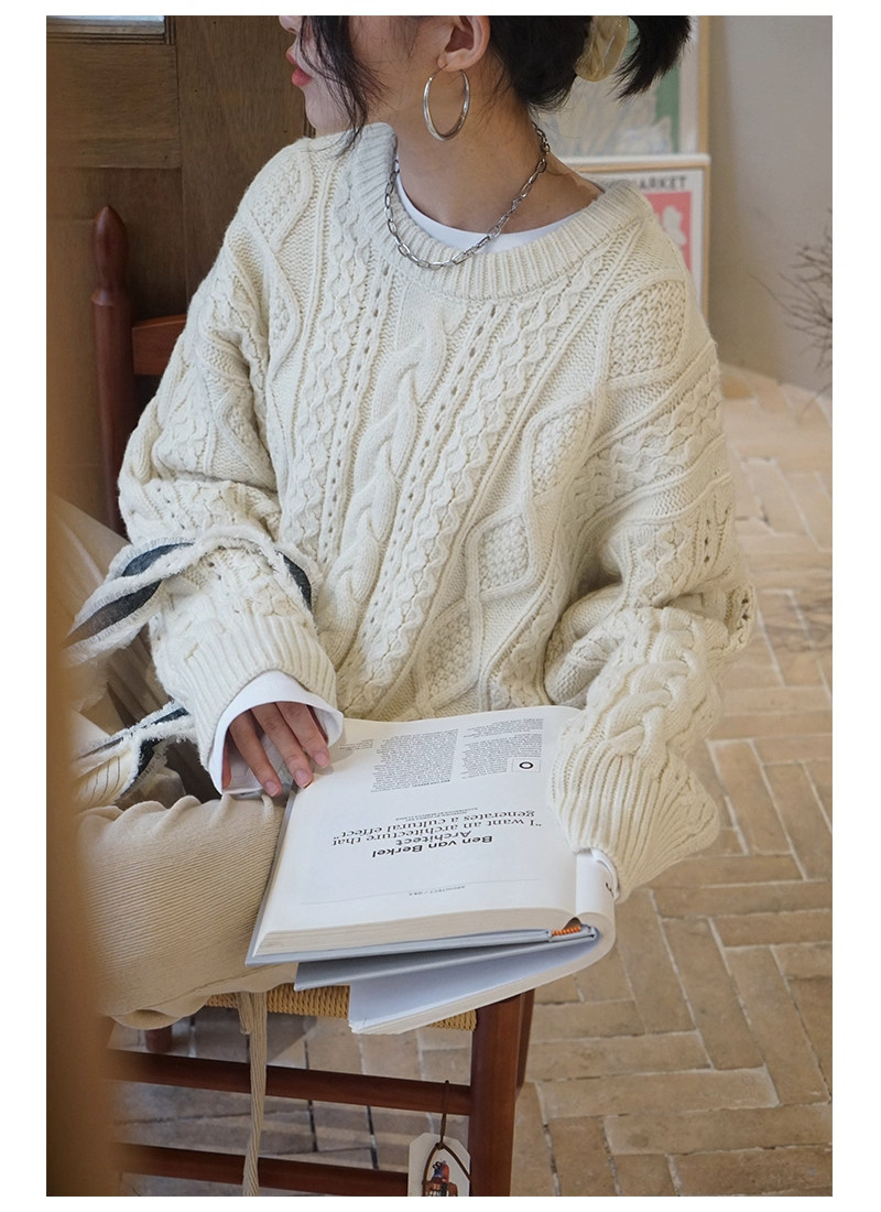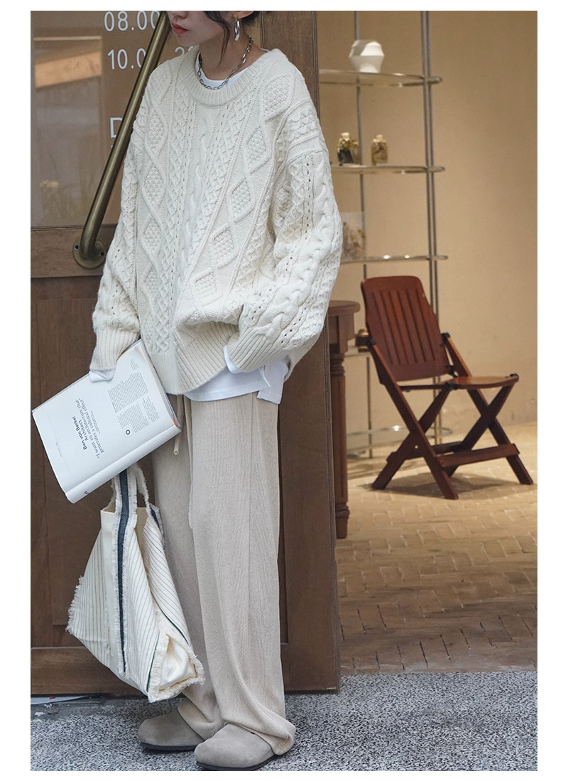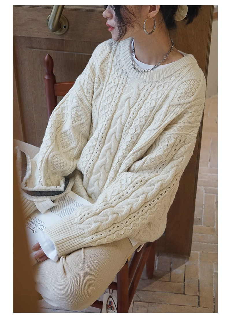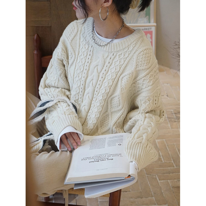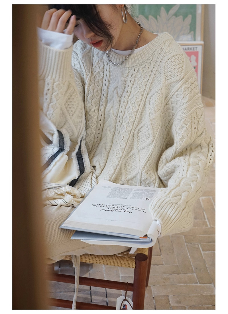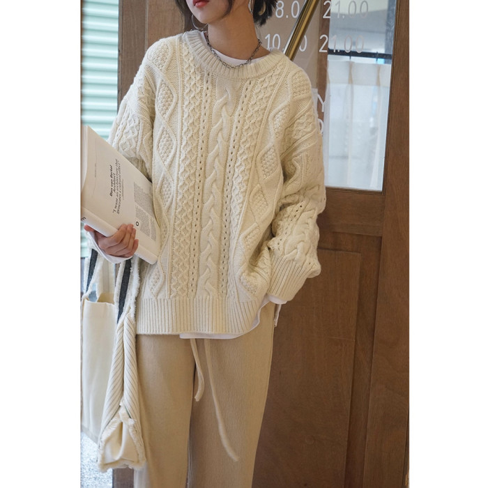 秋冬復古慵懶風寬松套頭絞麻花內搭底外穿白色加厚針織衫毛衣女