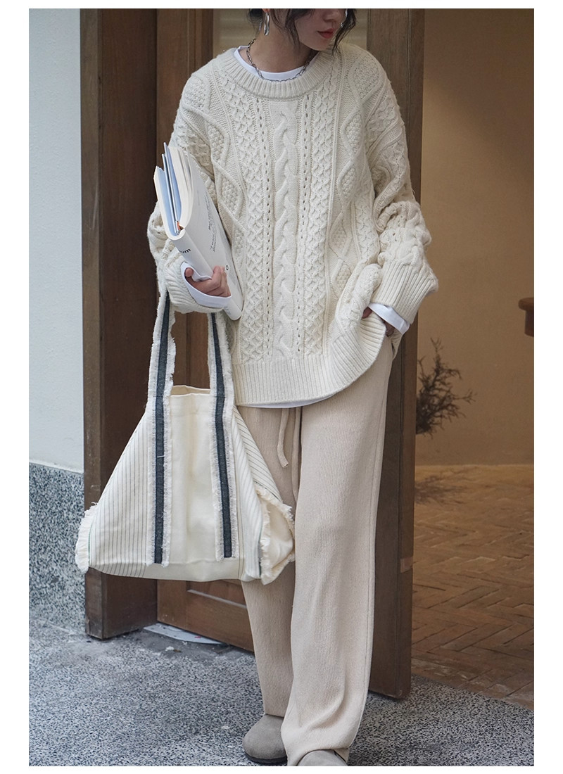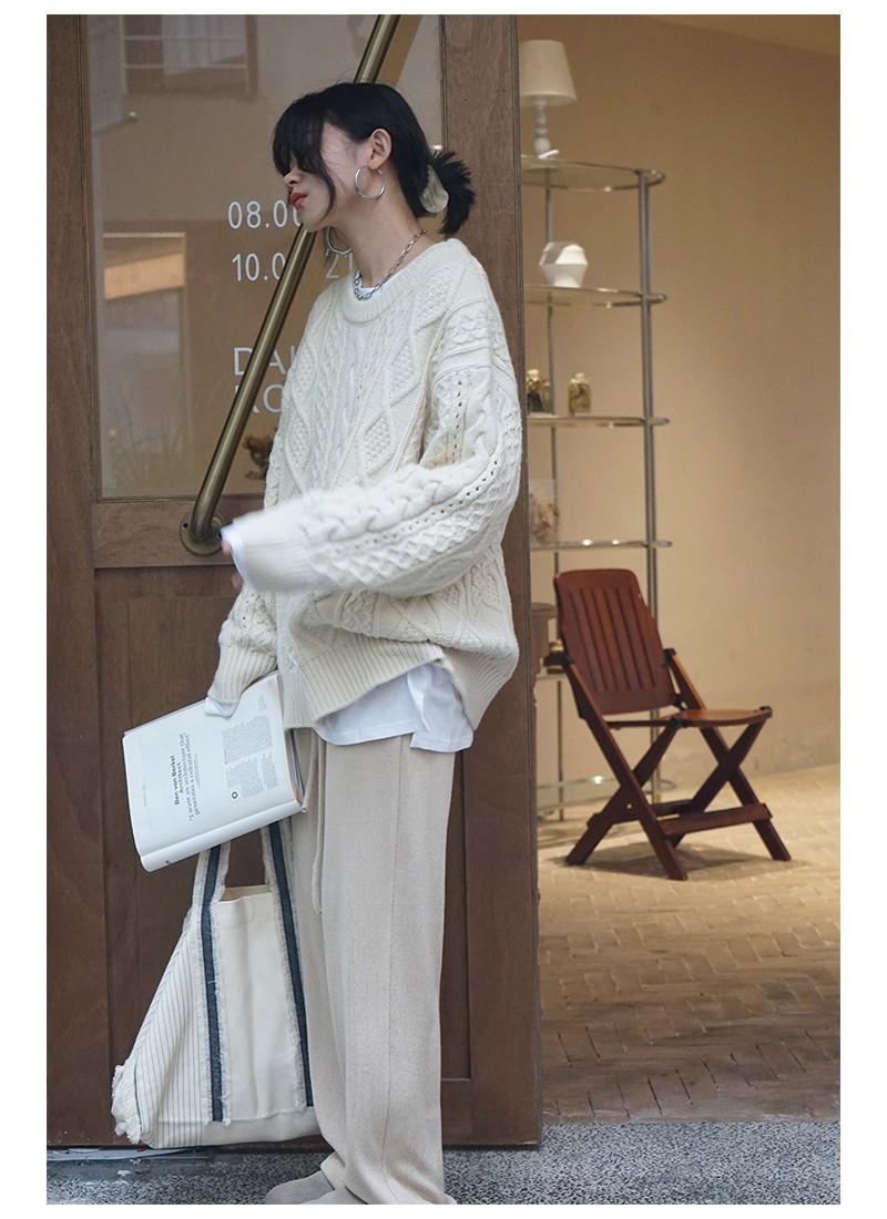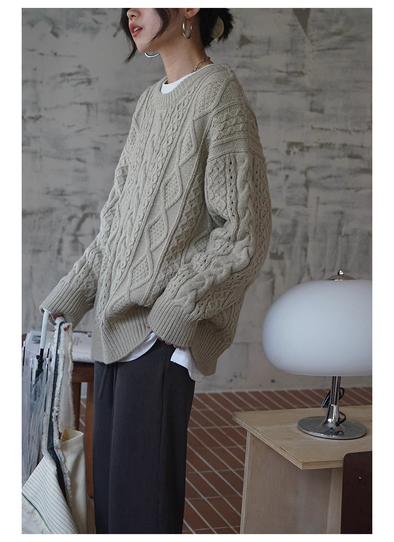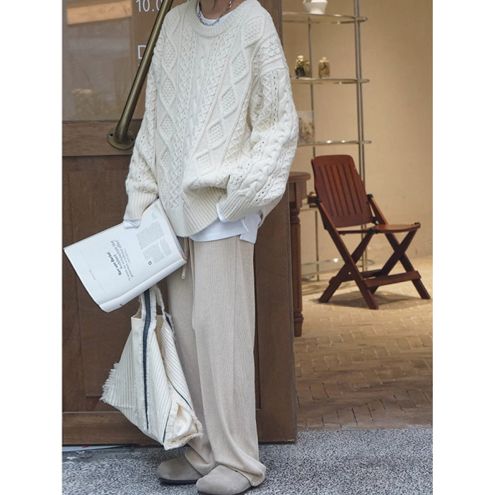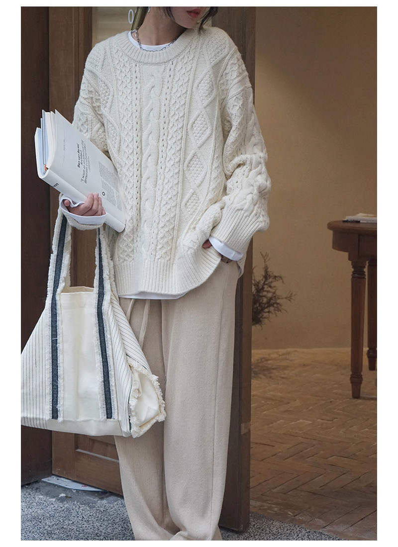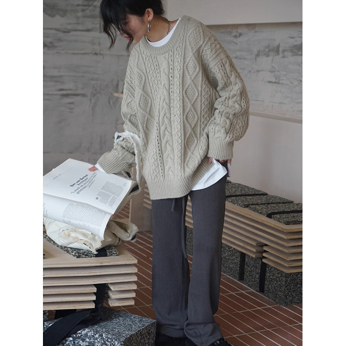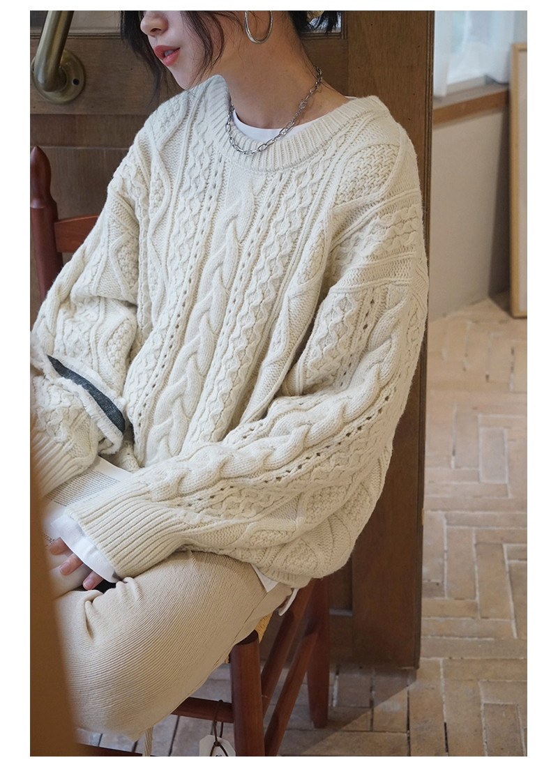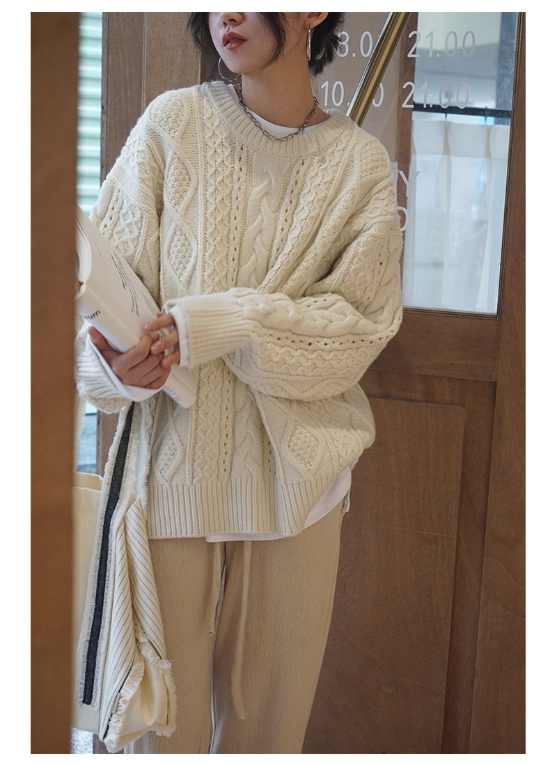 秋冬復古慵懶風寬松套頭絞麻花內搭底外穿白色加厚針織衫毛衣女