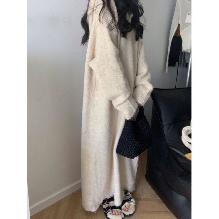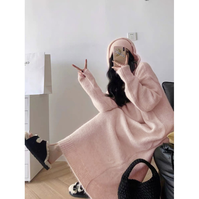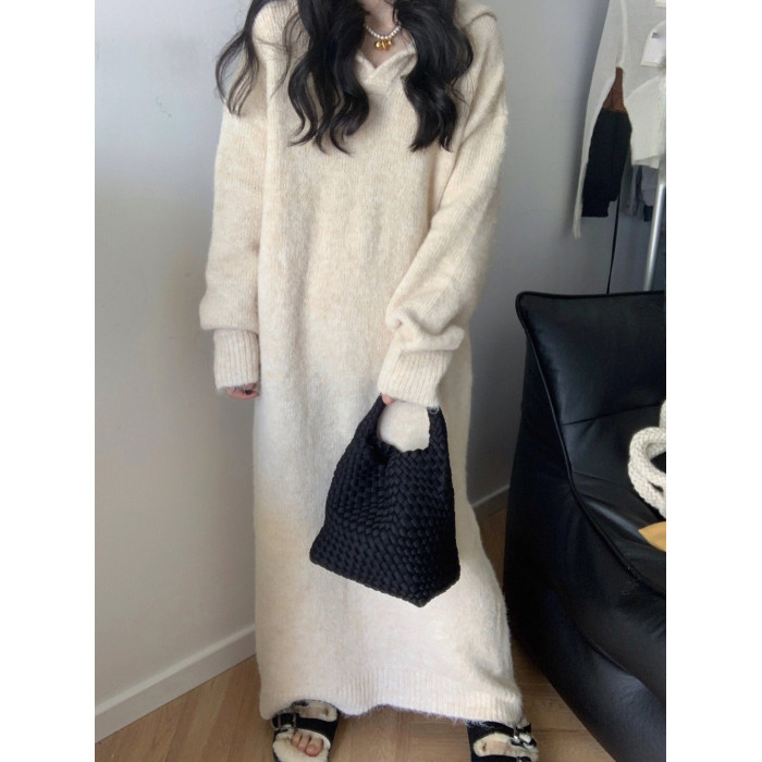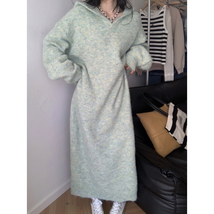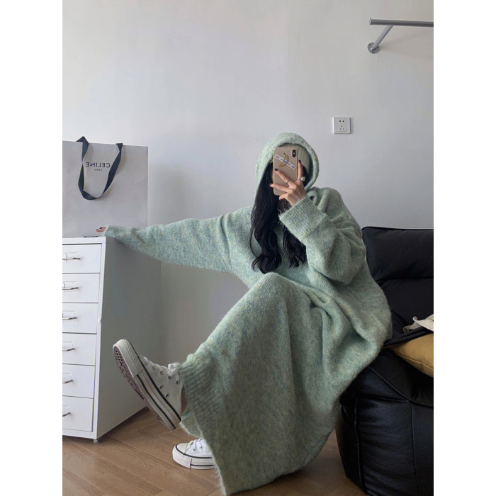 慵懶風寬松連帽連衣裙女長款秋冬韓版套頭毛線針織裙過膝長裙加厚