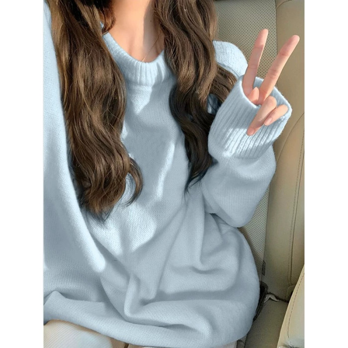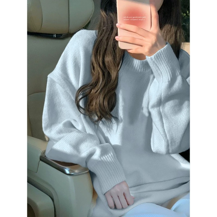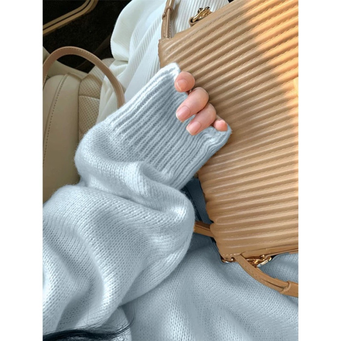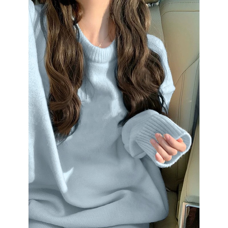 大碼胖MM淺藍純色奶fufu慵懶圓領毛衣女秋冬季2025新款寬松溫柔風