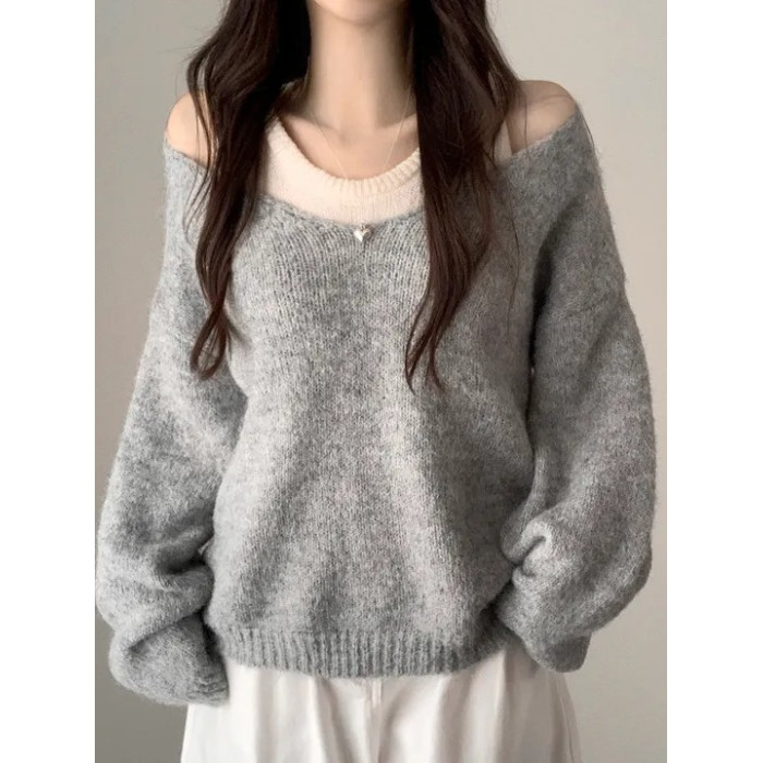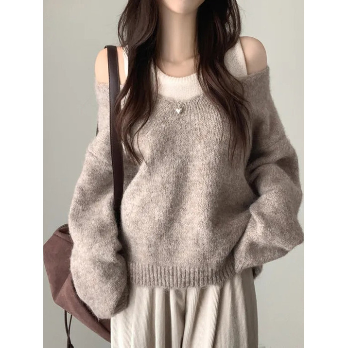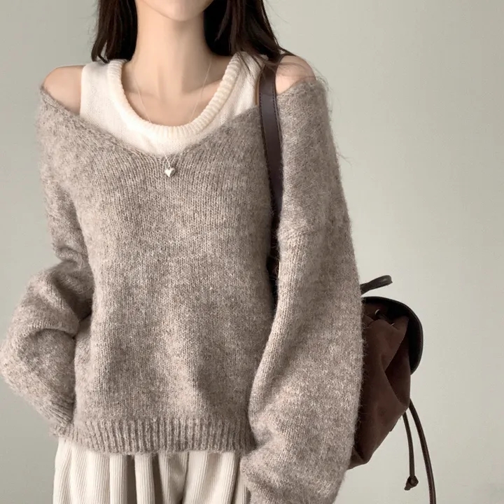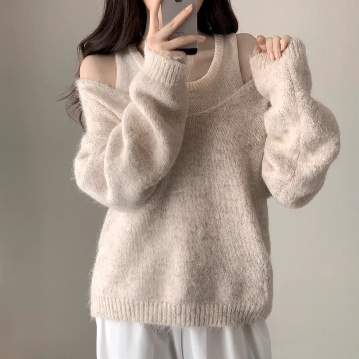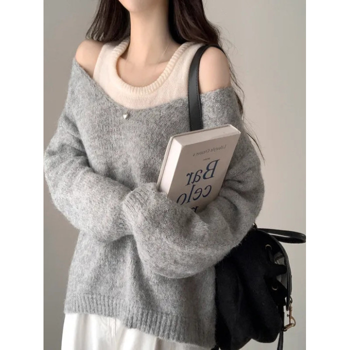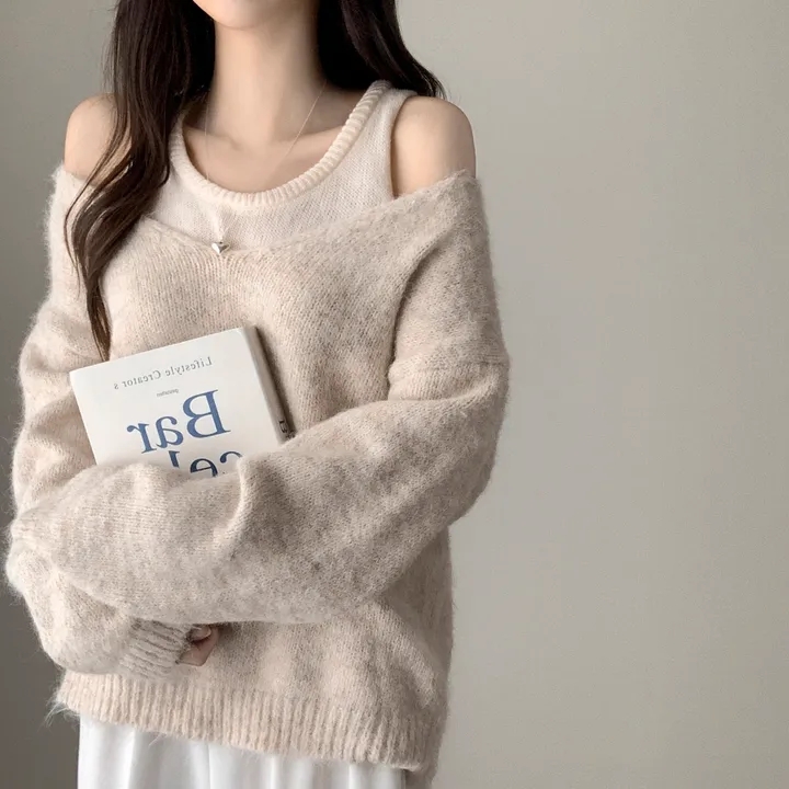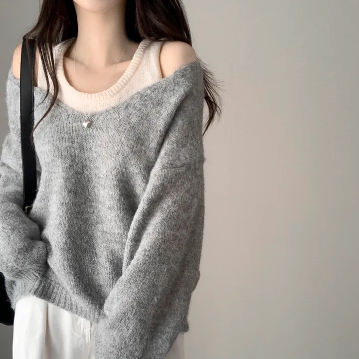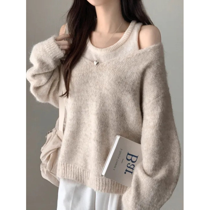 韓國chic秋冬白色打底背心+寬松休閒套頭V領針織衫兩件套毛衣女潮