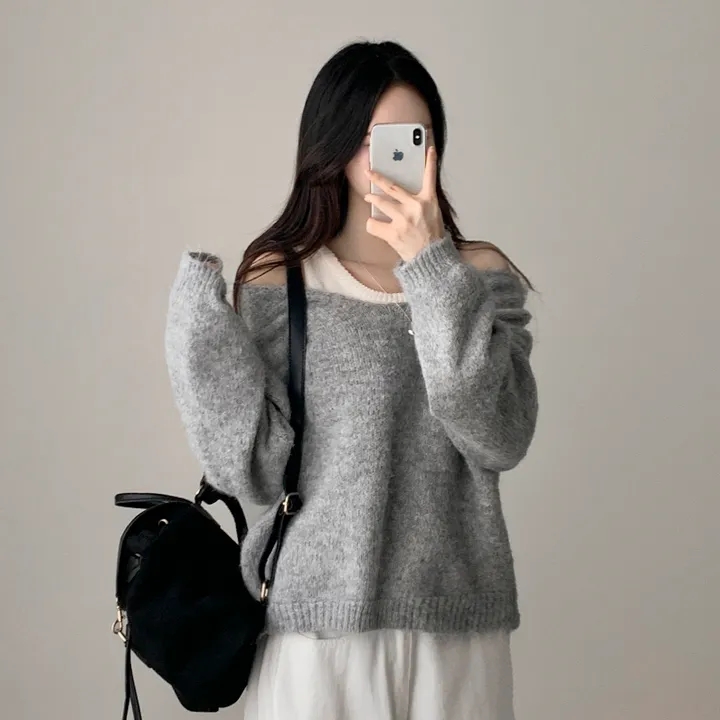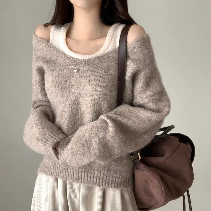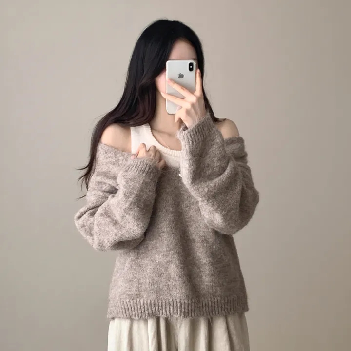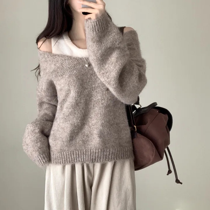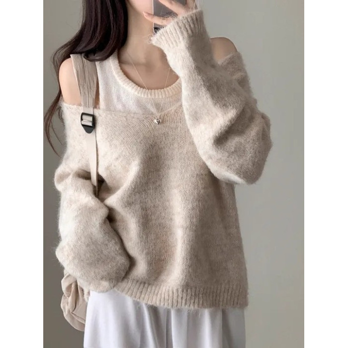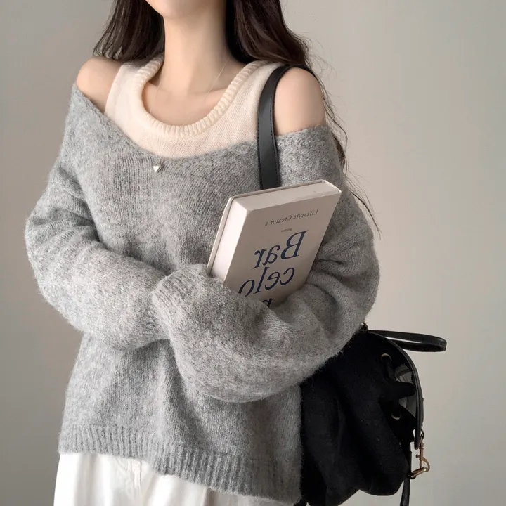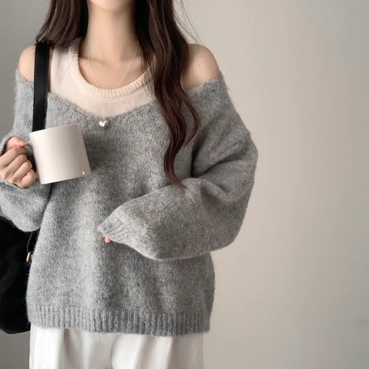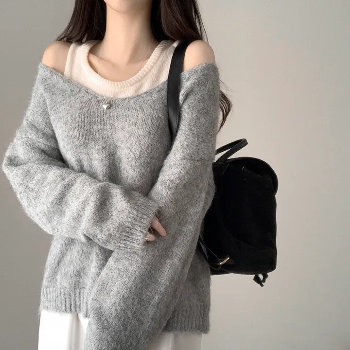 韓國chic秋冬白色打底背心+寬松休閒套頭V領針織衫兩件套毛衣女潮
