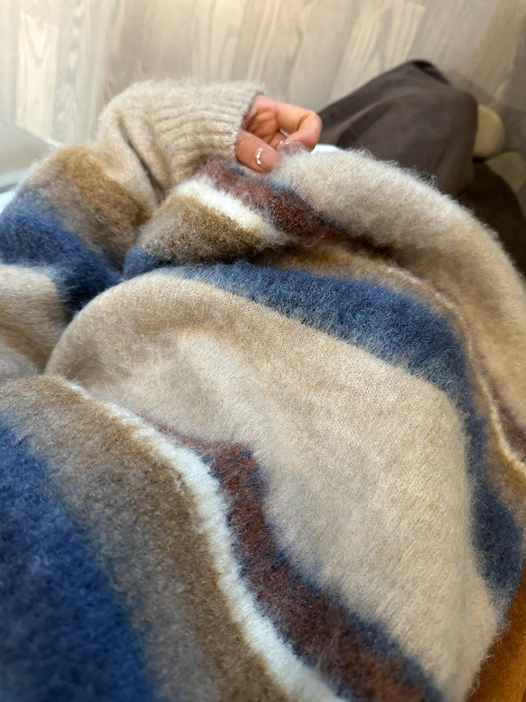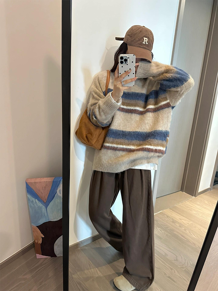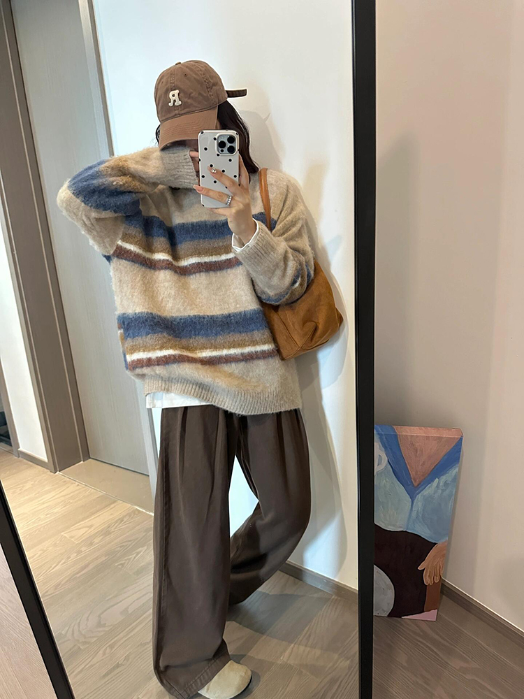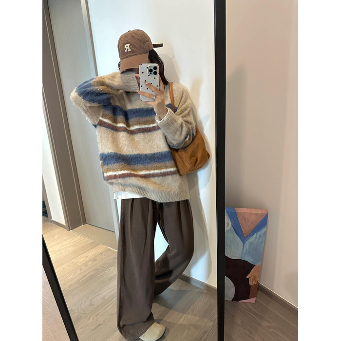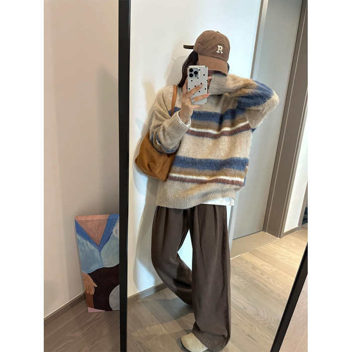復古撞色條紋毛衣女軟糯慵懶高級感2025秋冬新款寬松針織衫上衣潮