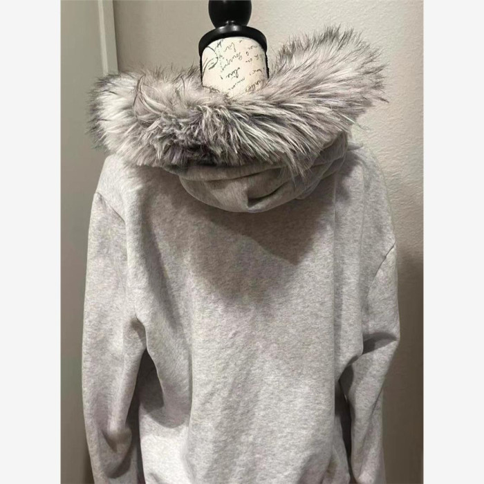 美式古著亞文化y2k衣服連帽衛衣女秋冬加絨加厚開衫毛領外套上衣
