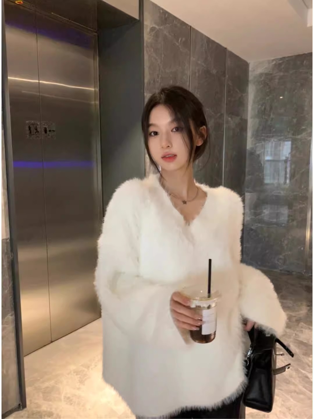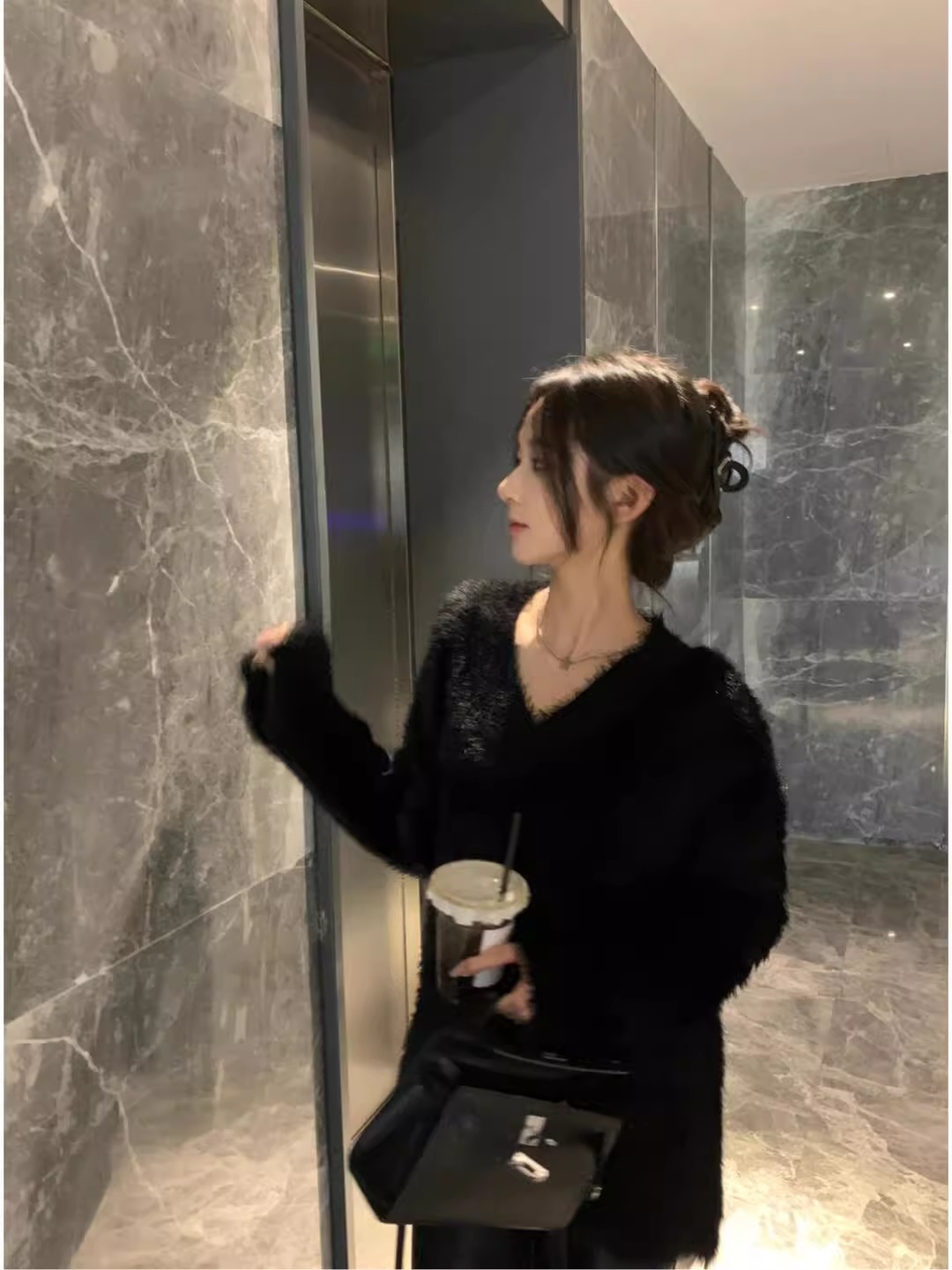軟糯水貂絨黑色毛衣女秋冬高級感超好看V領寬松內搭打底上衣加厚
