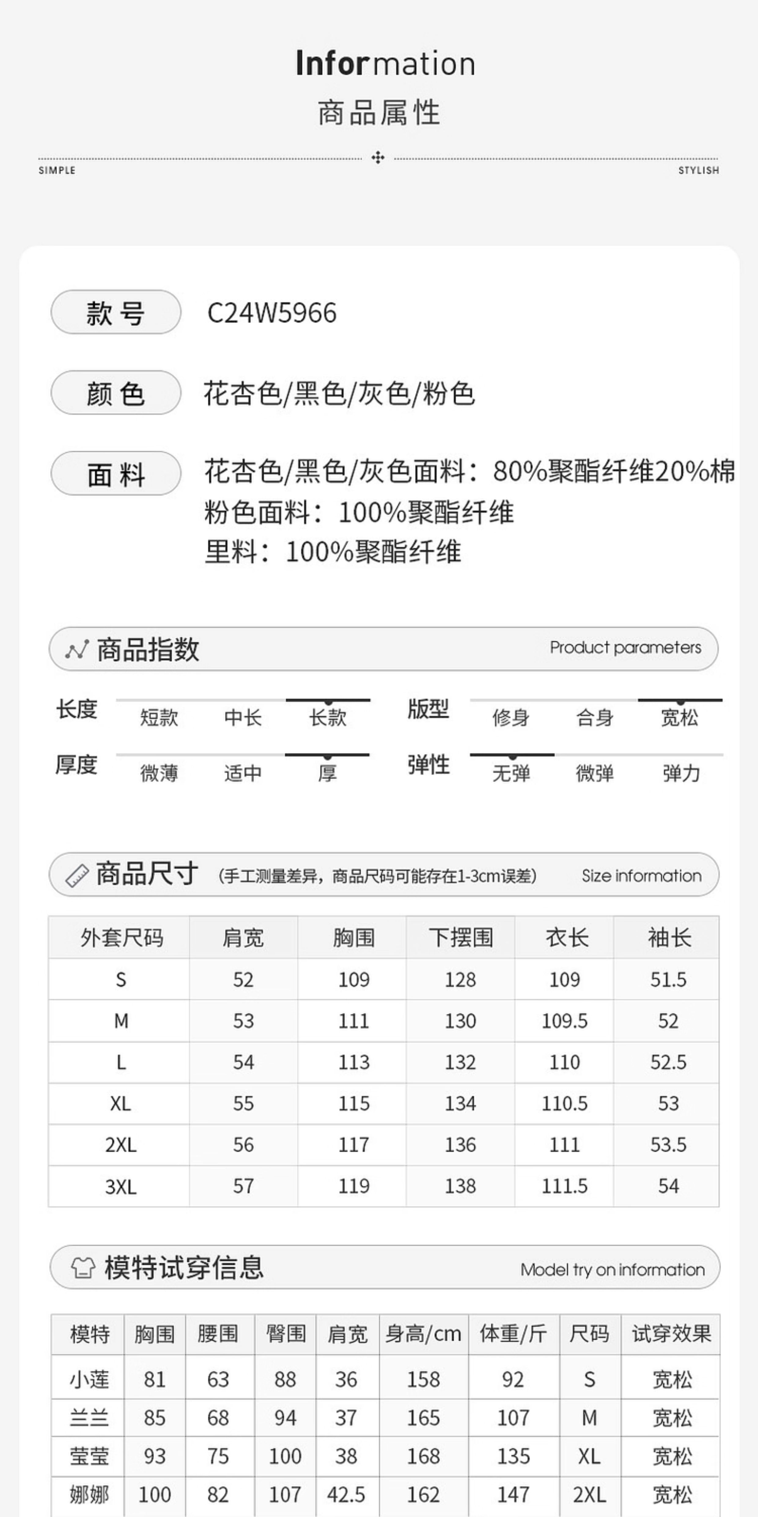 | 衣長 | 中長款 |