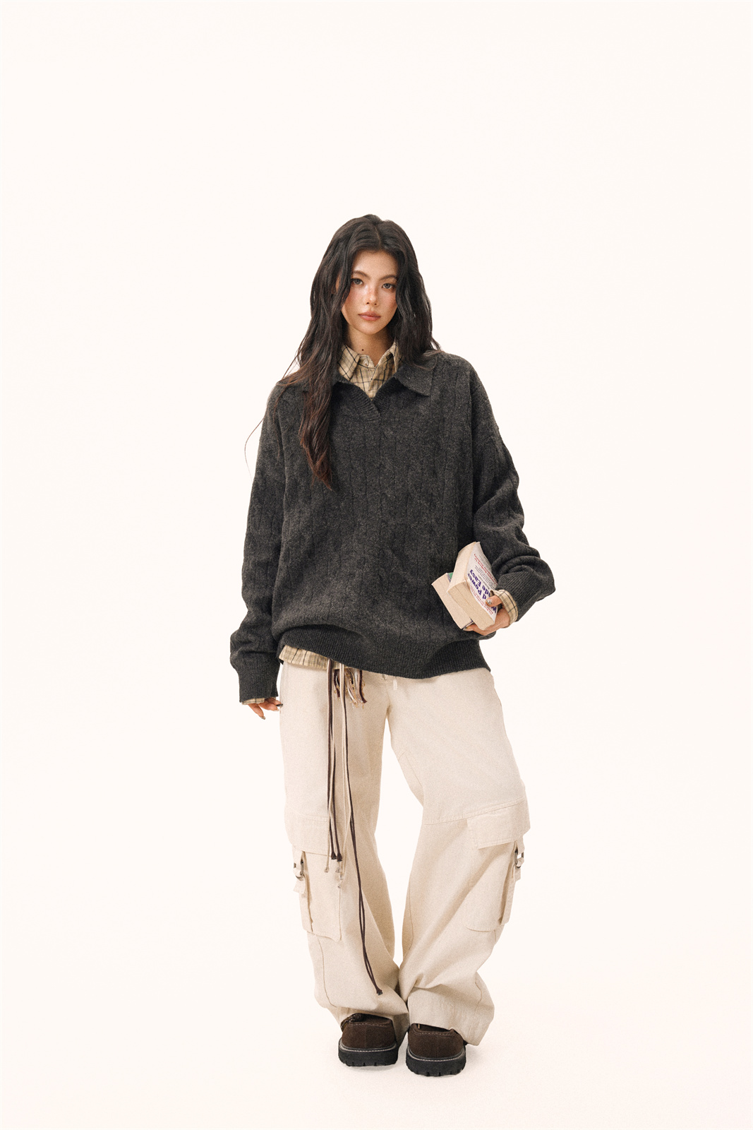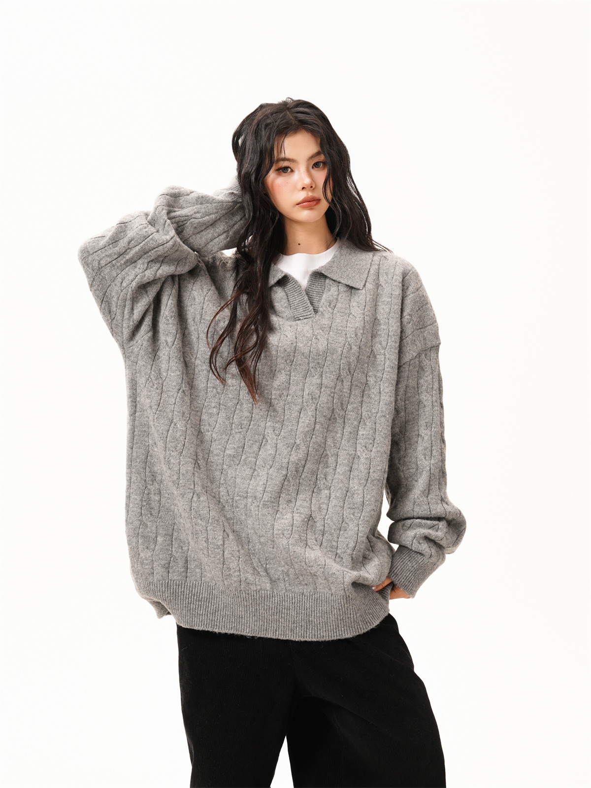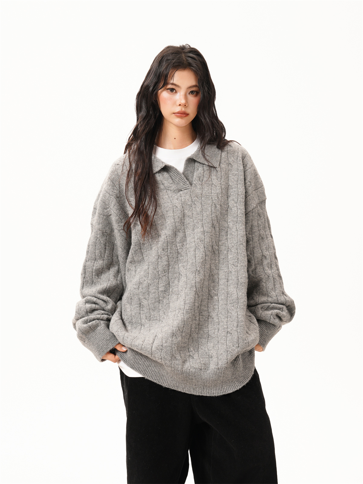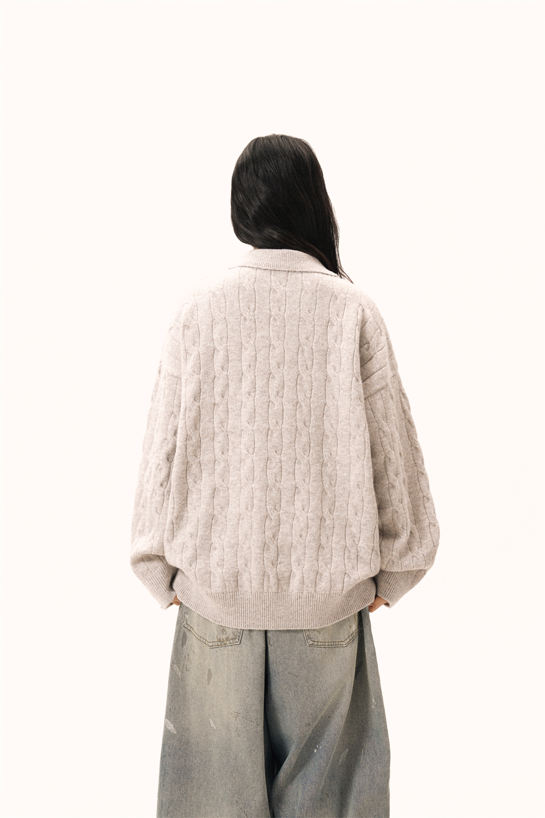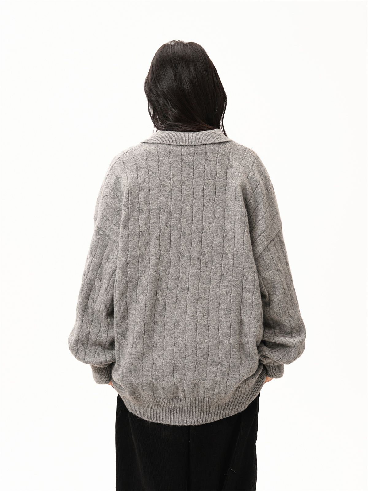 復古老錢風絞花POLO領毛衣女男秋季寬松慵懶松弛感翻領針織衫外套