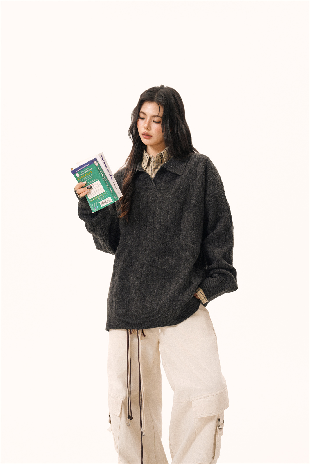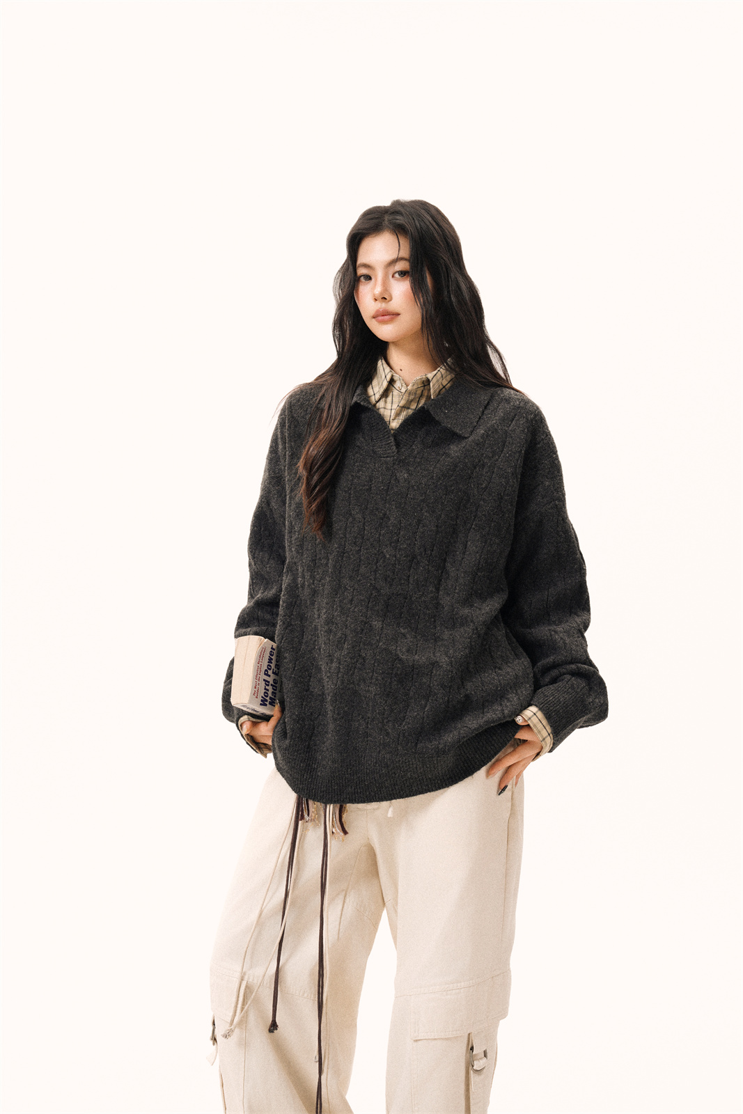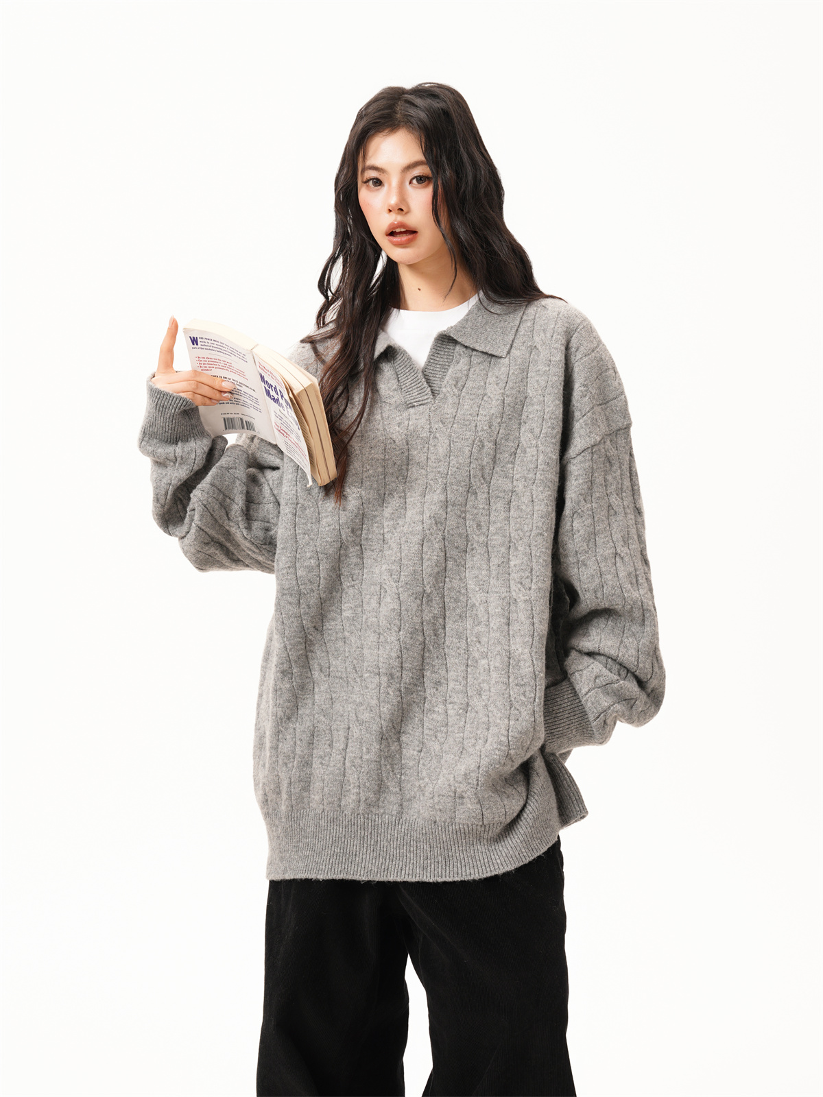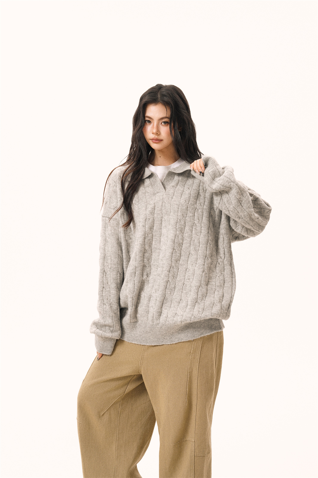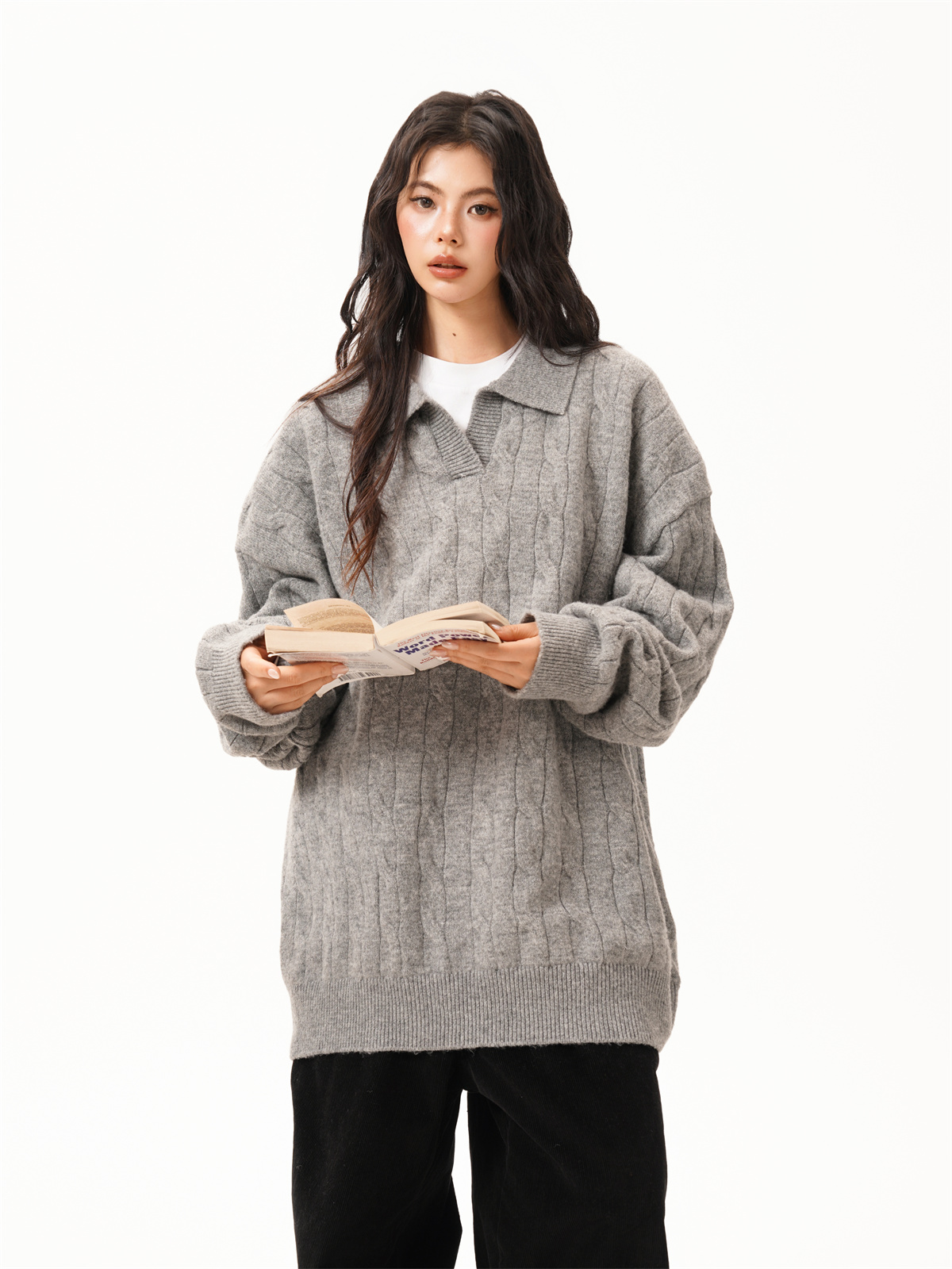 復古老錢風絞花POLO領毛衣女男秋季寬松慵懶松弛感翻領針織衫外套