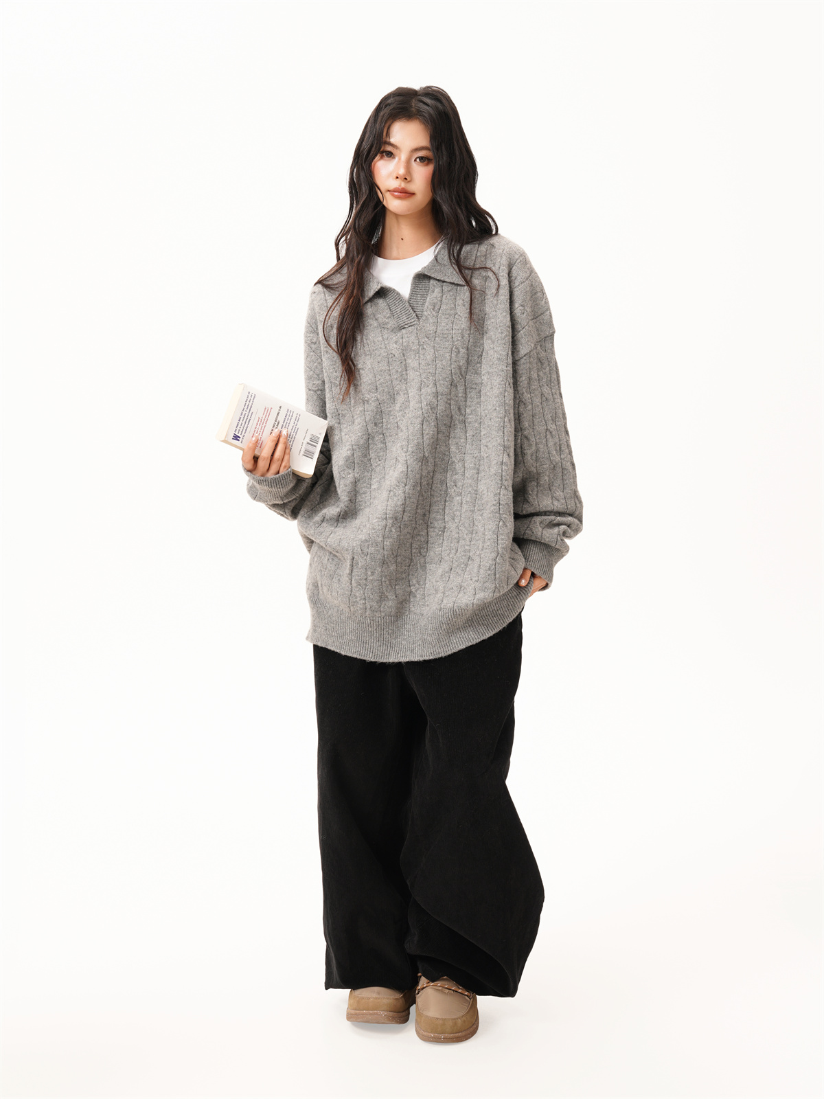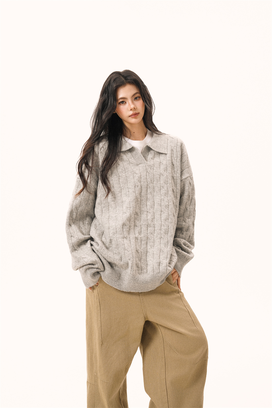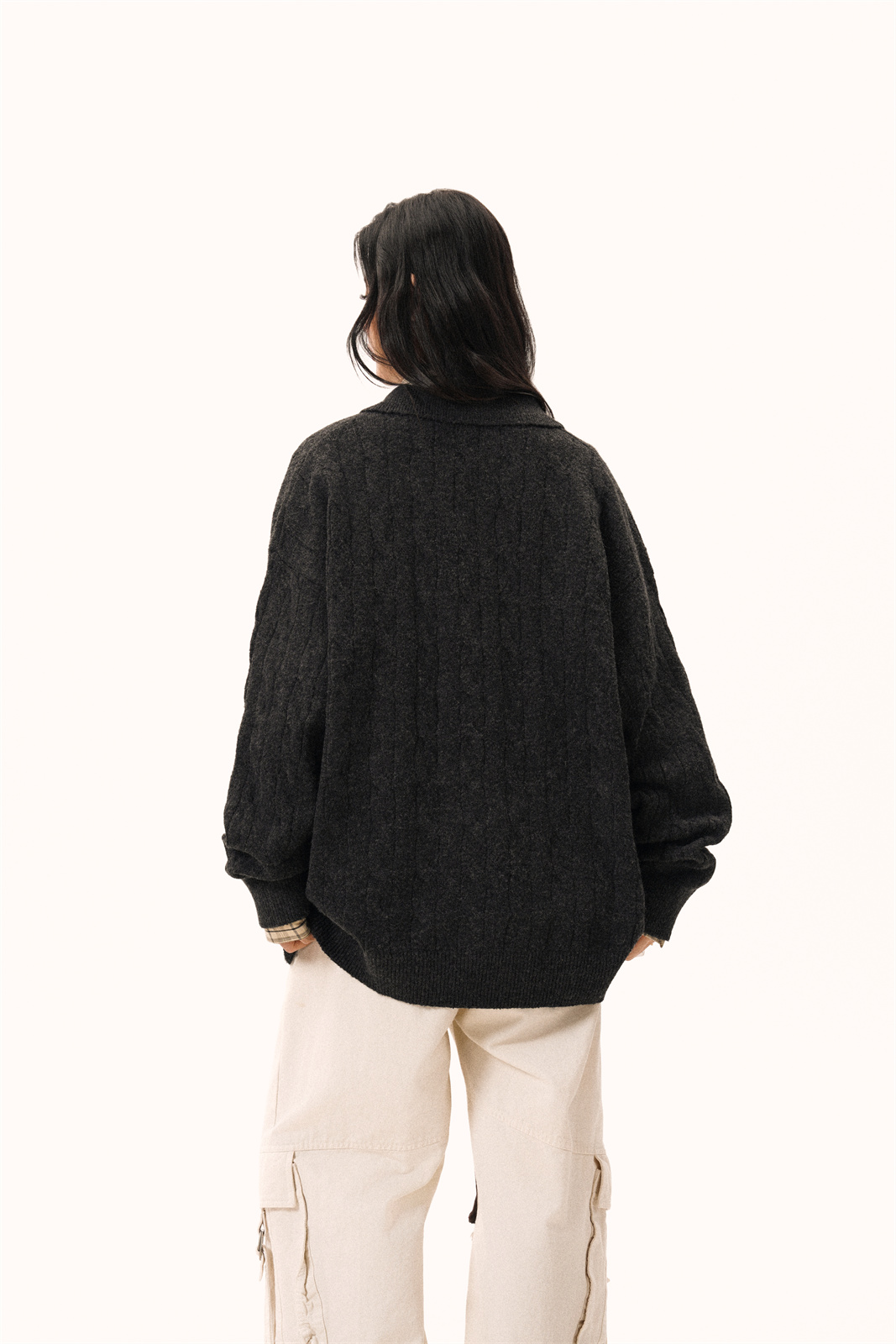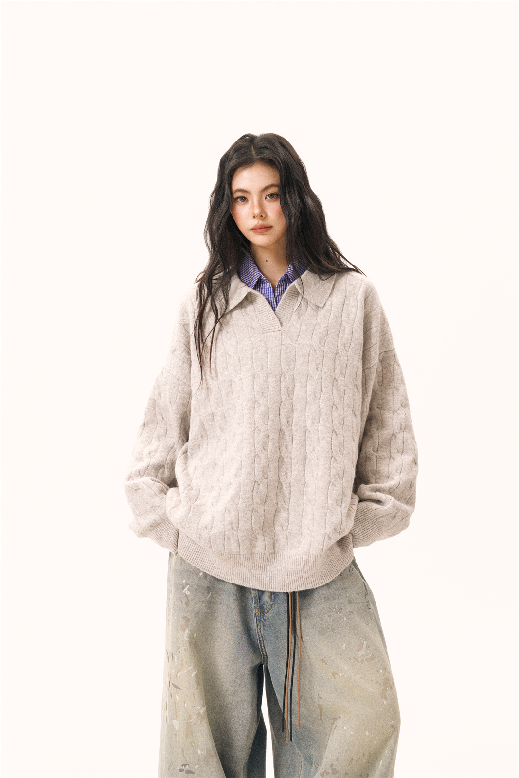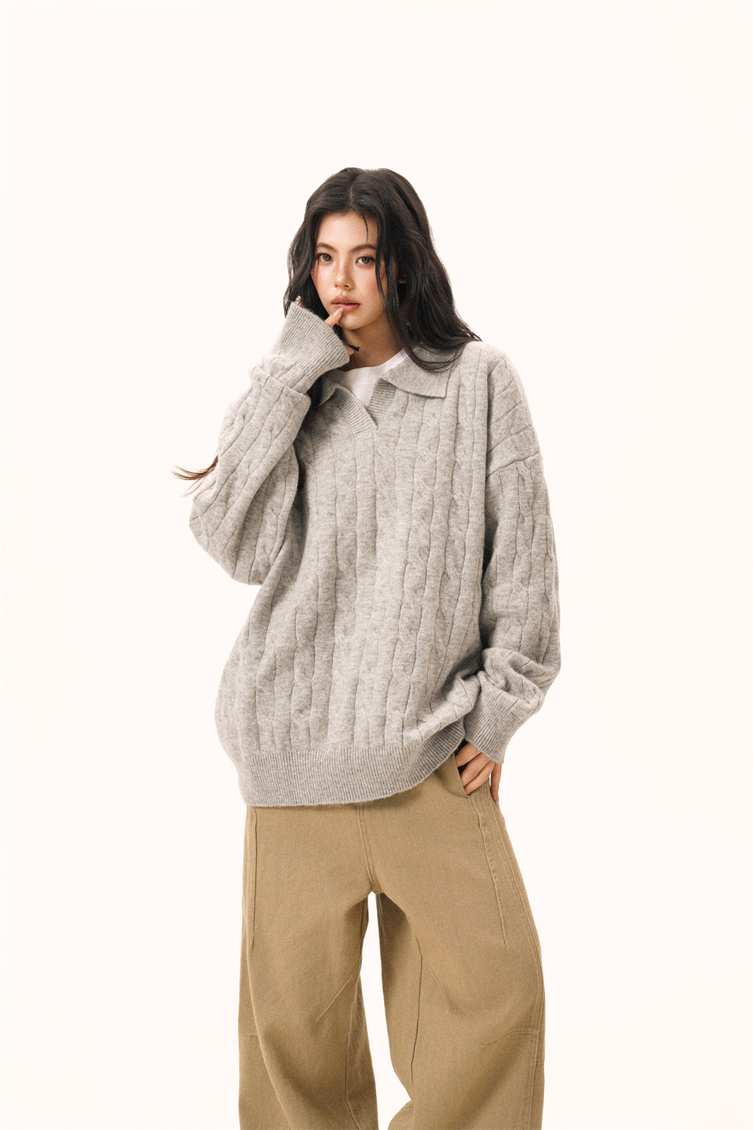復古老錢風絞花POLO領毛衣女男秋季寬松慵懶松弛感翻領針織衫外套