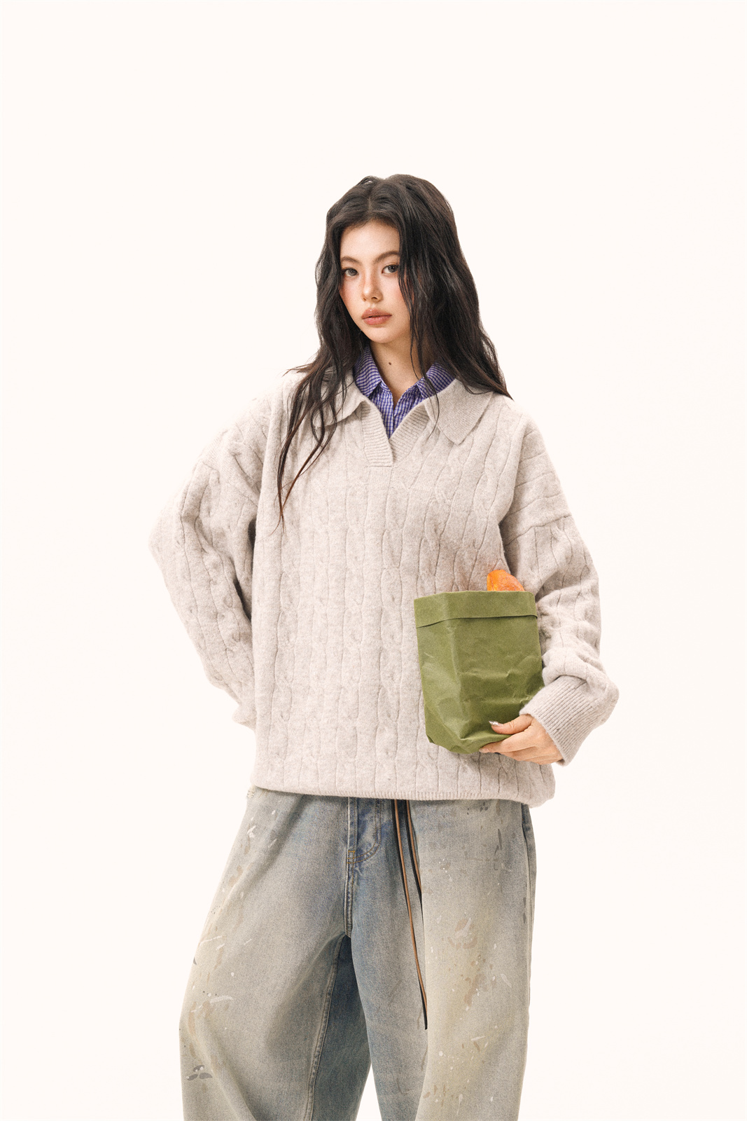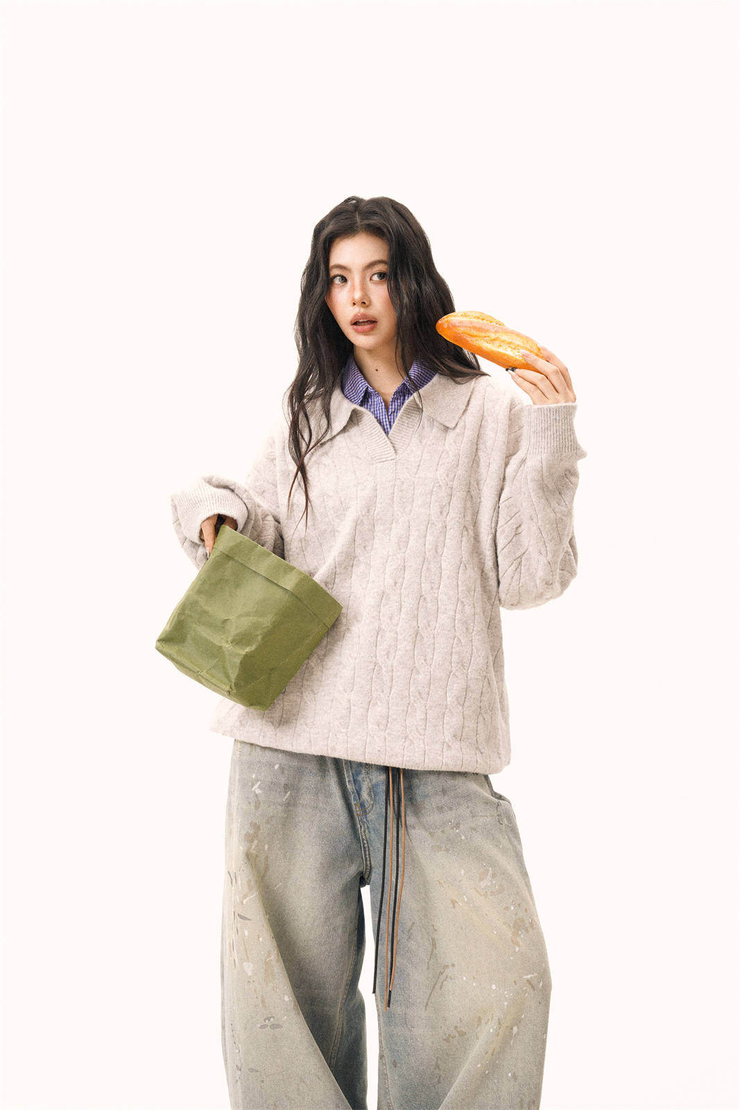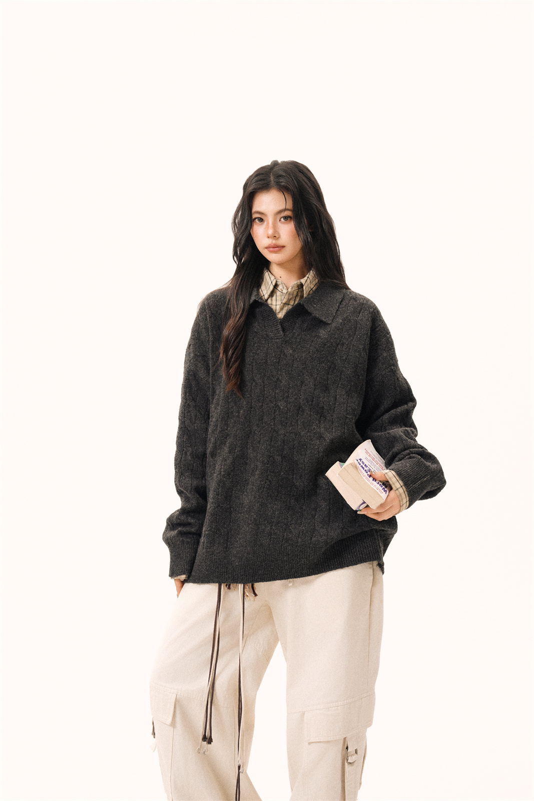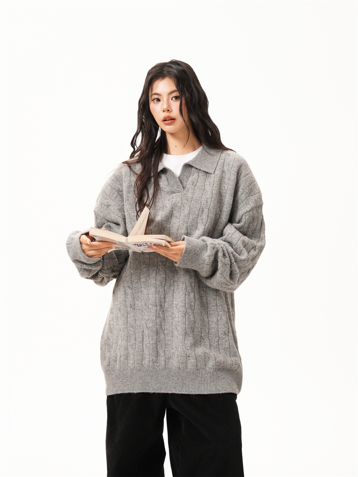 復古老錢風絞花POLO領毛衣女男秋季寬松慵懶松弛感翻領針織衫外套