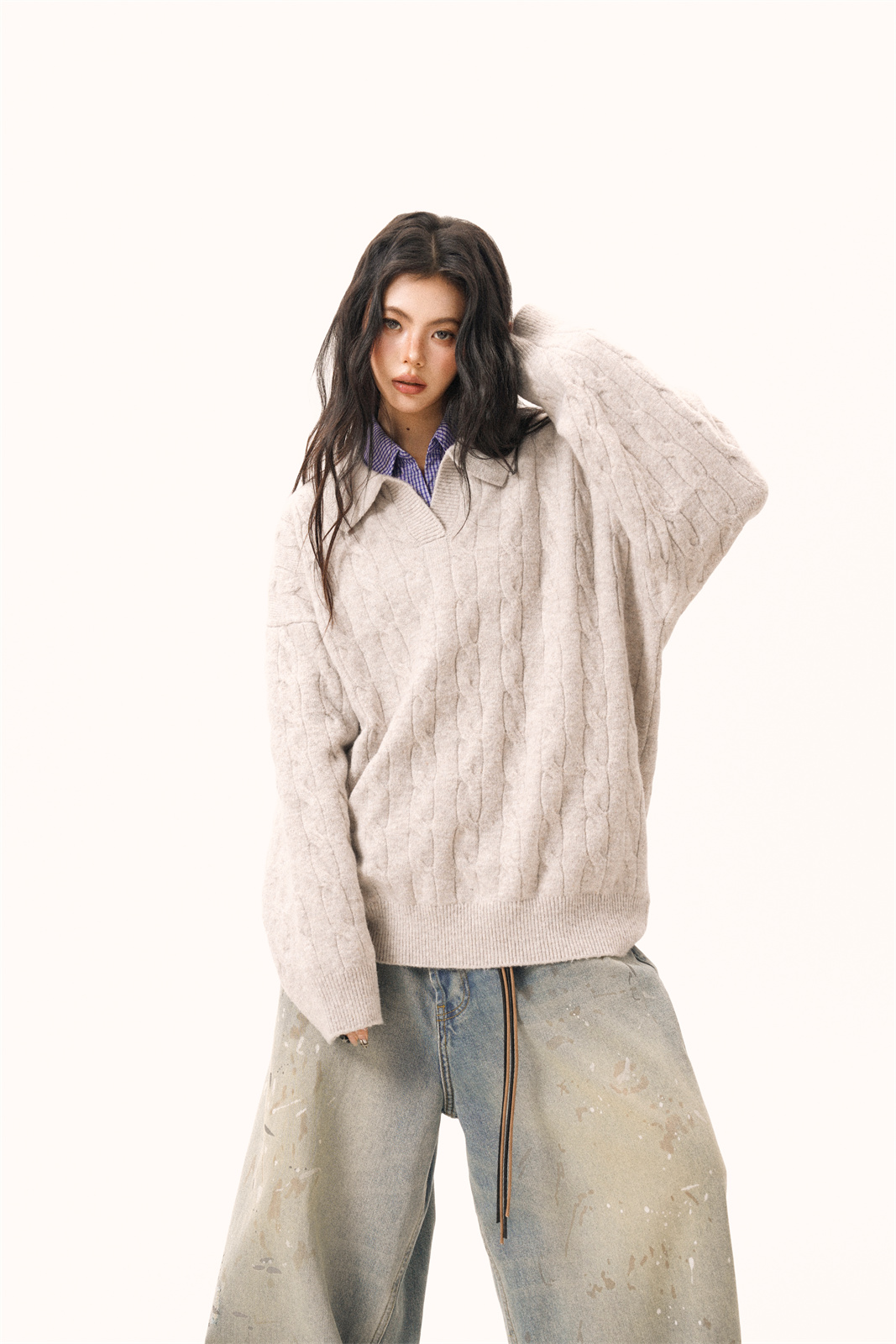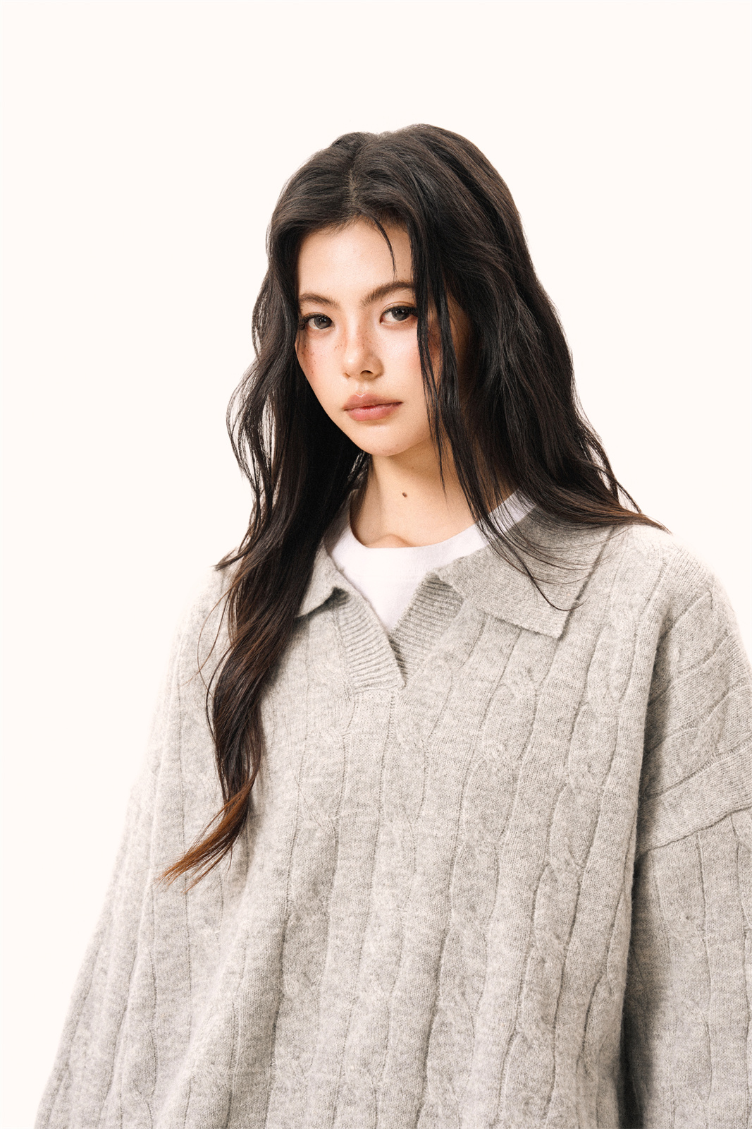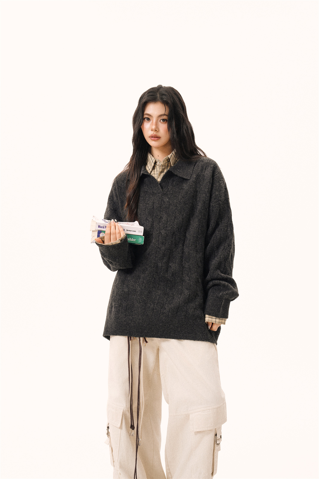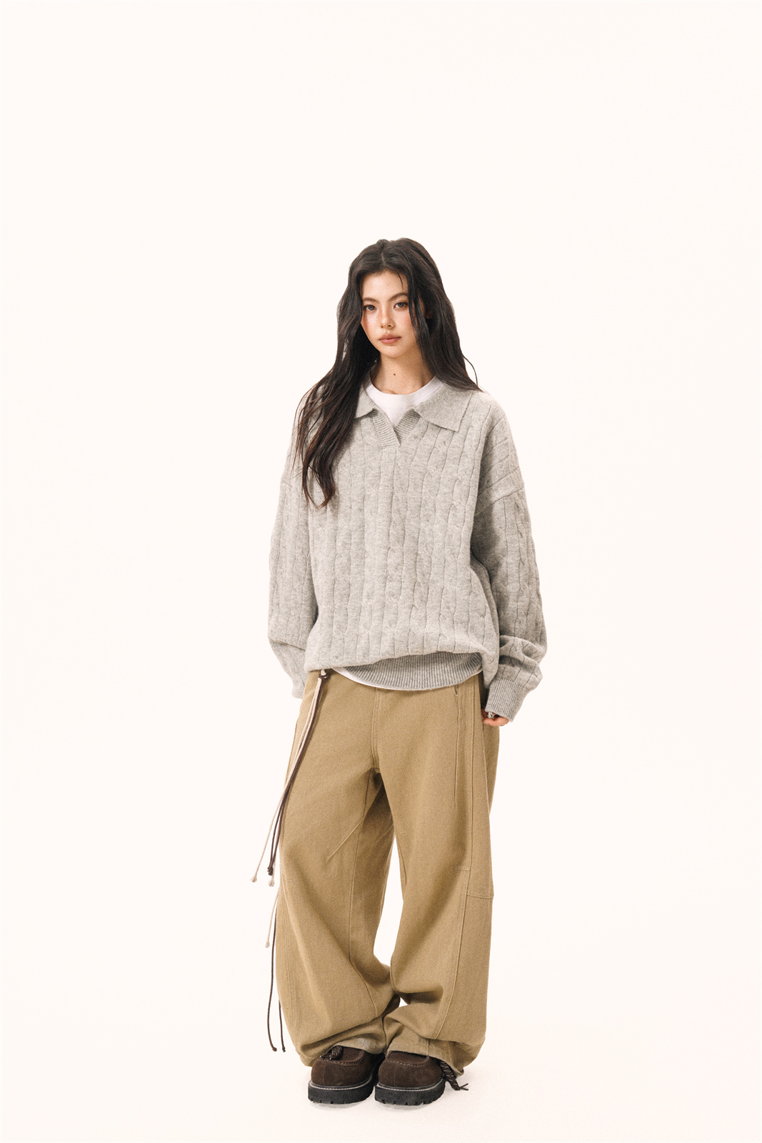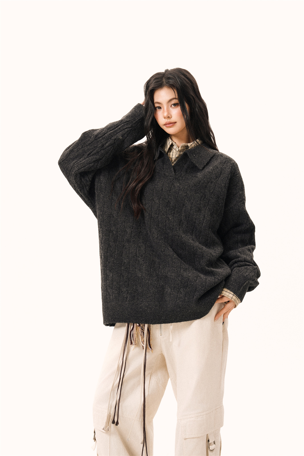 復古老錢風絞花POLO領毛衣女男秋季寬松慵懶松弛感翻領針織衫外套