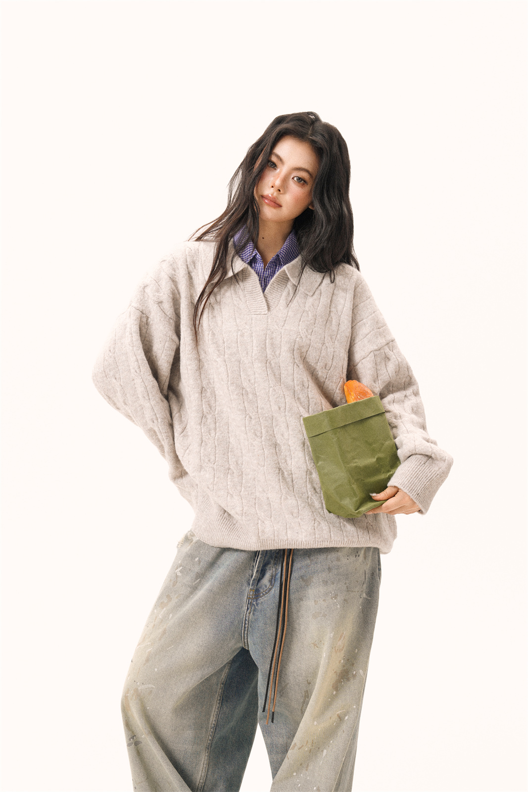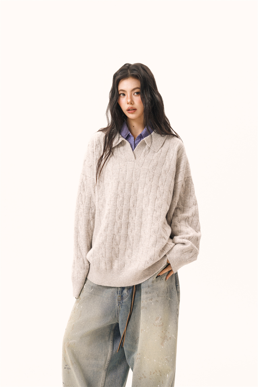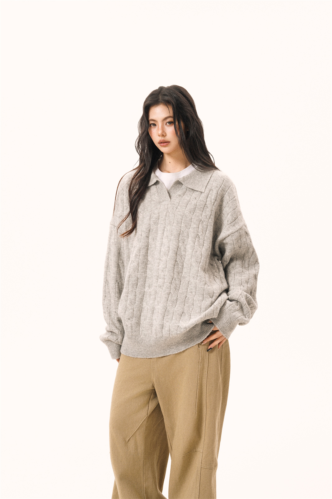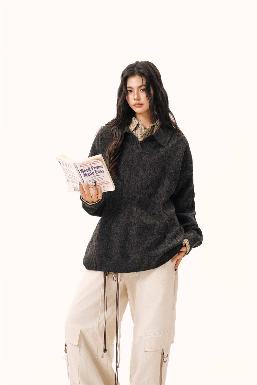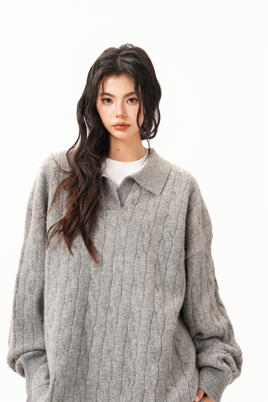 復古老錢風絞花POLO領毛衣女男秋季寬松慵懶松弛感翻領針織衫外套