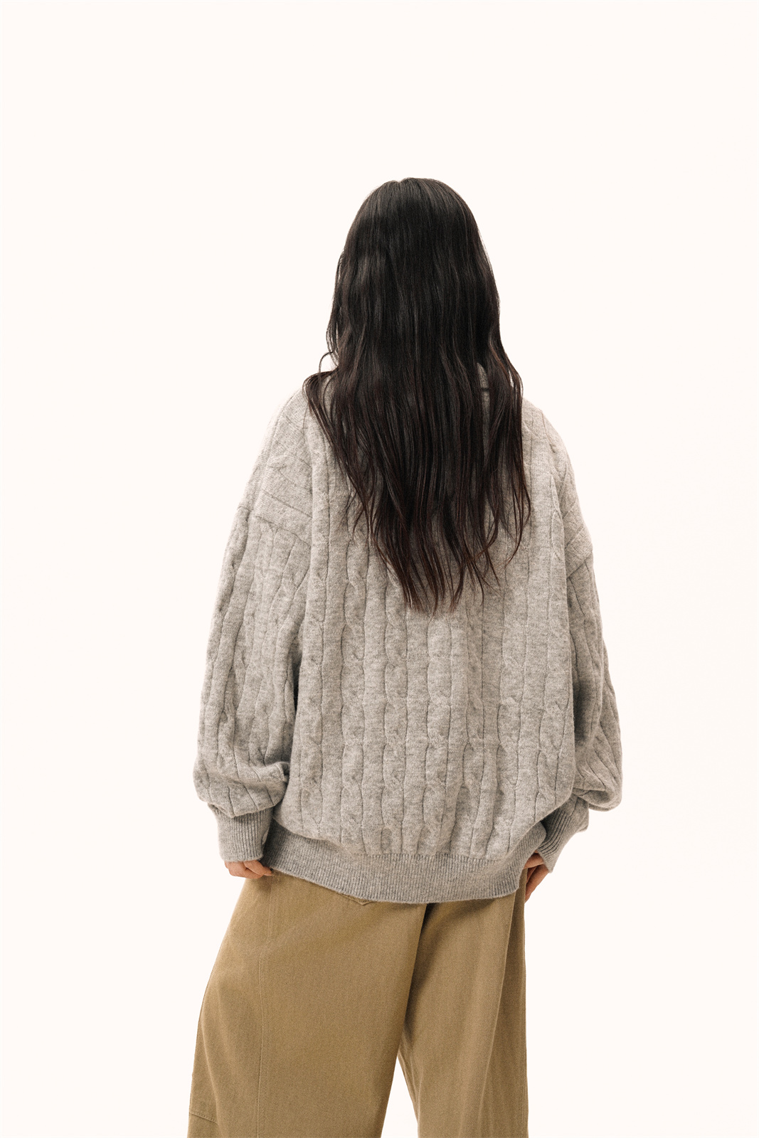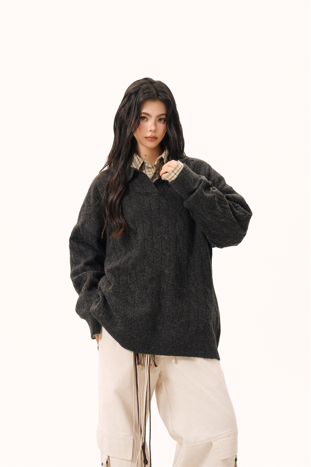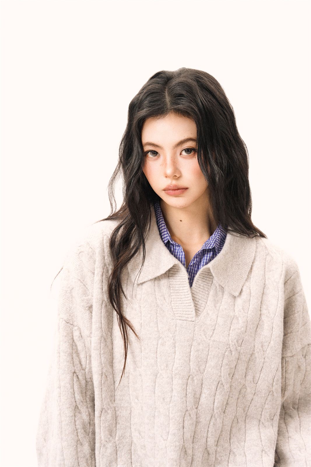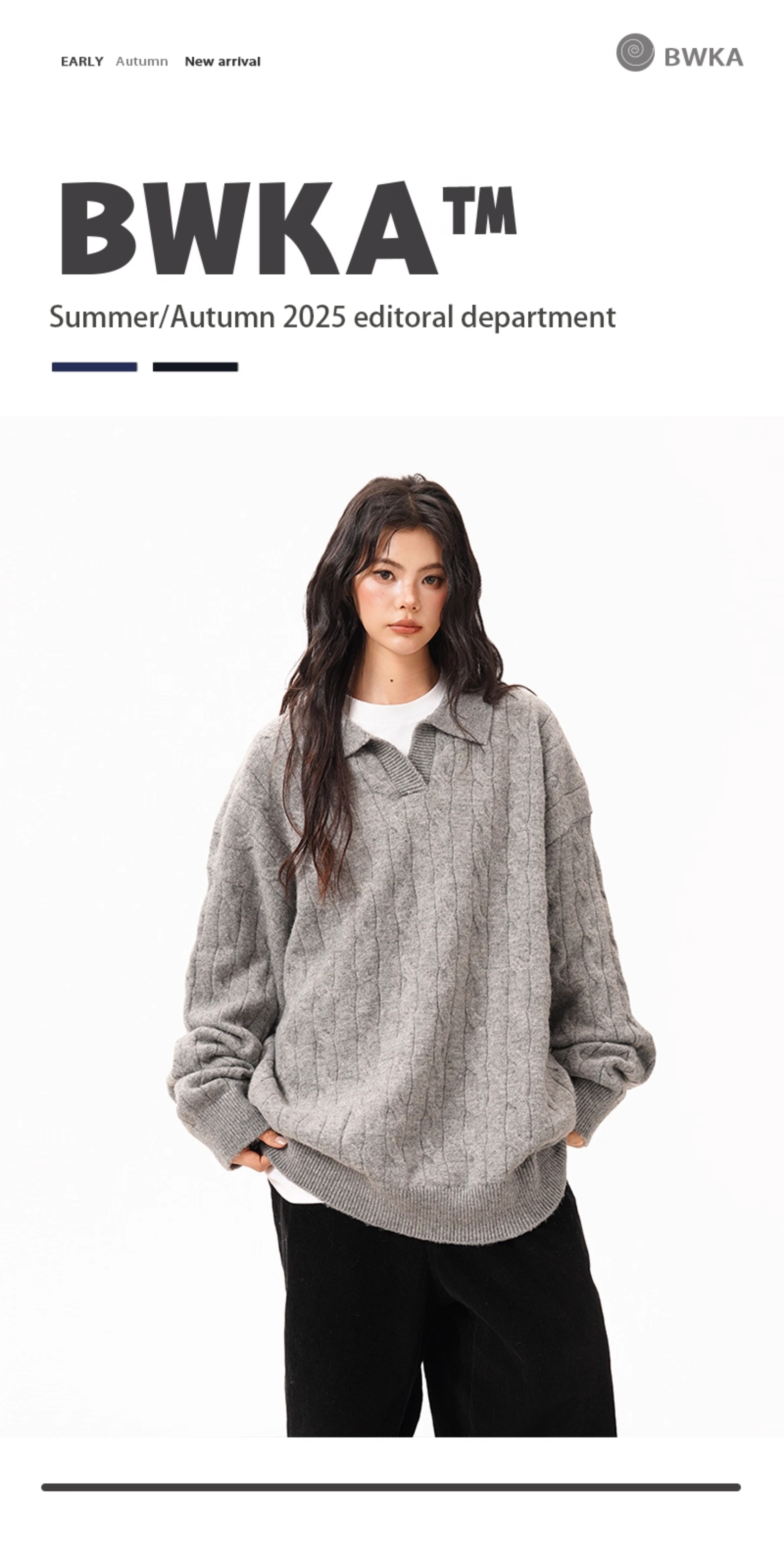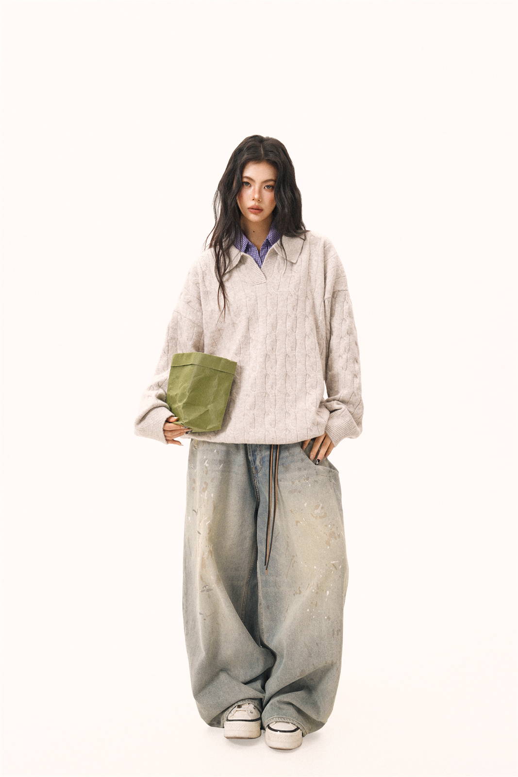 復古老錢風絞花POLO領毛衣女男秋季寬松慵懶松弛感翻領針織衫外套