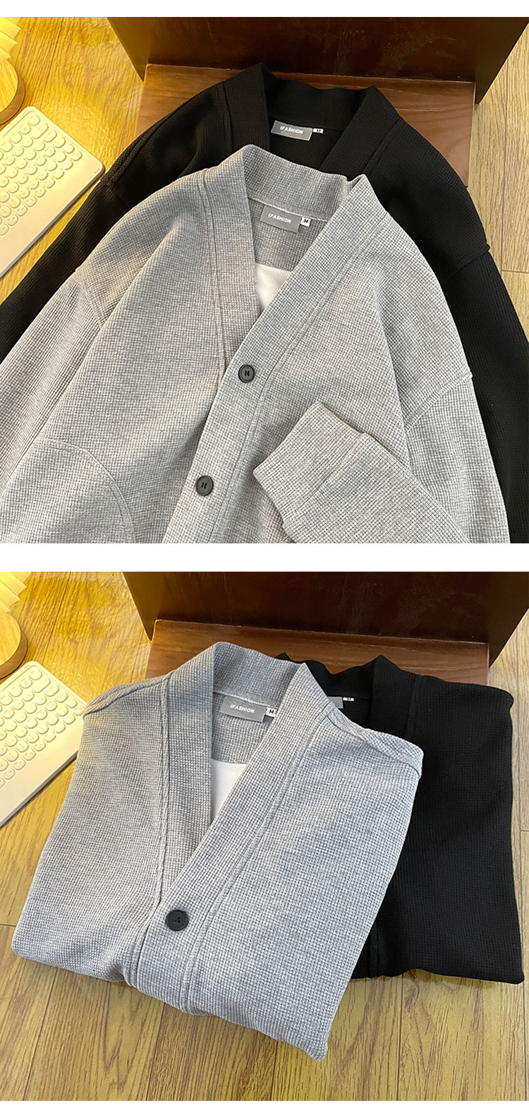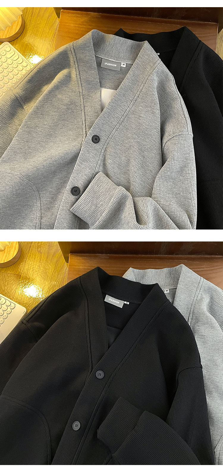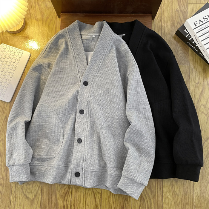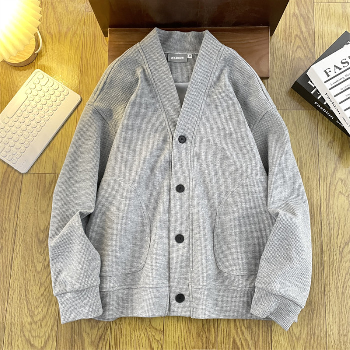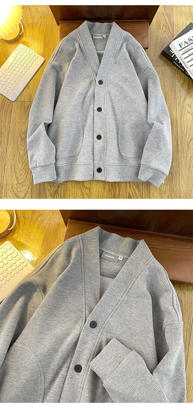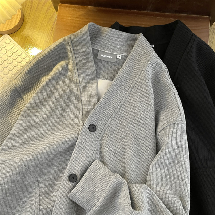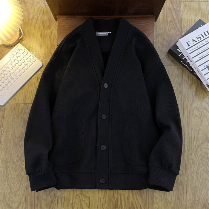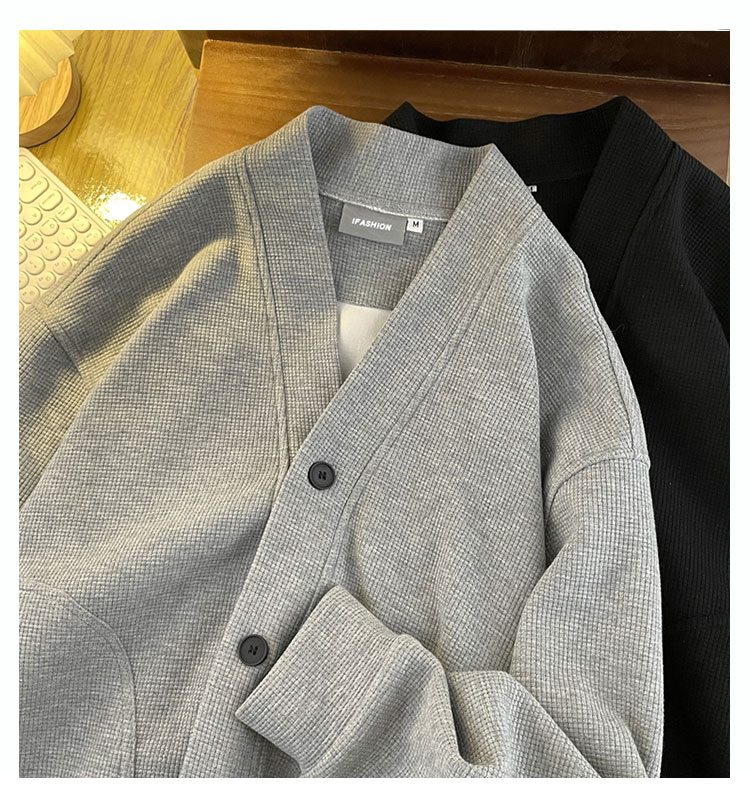 華夫格V領針織毛衣男秋季寬松開衫衛衣日系潮牌情侶休閒紐釦夾克