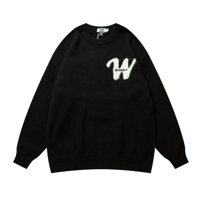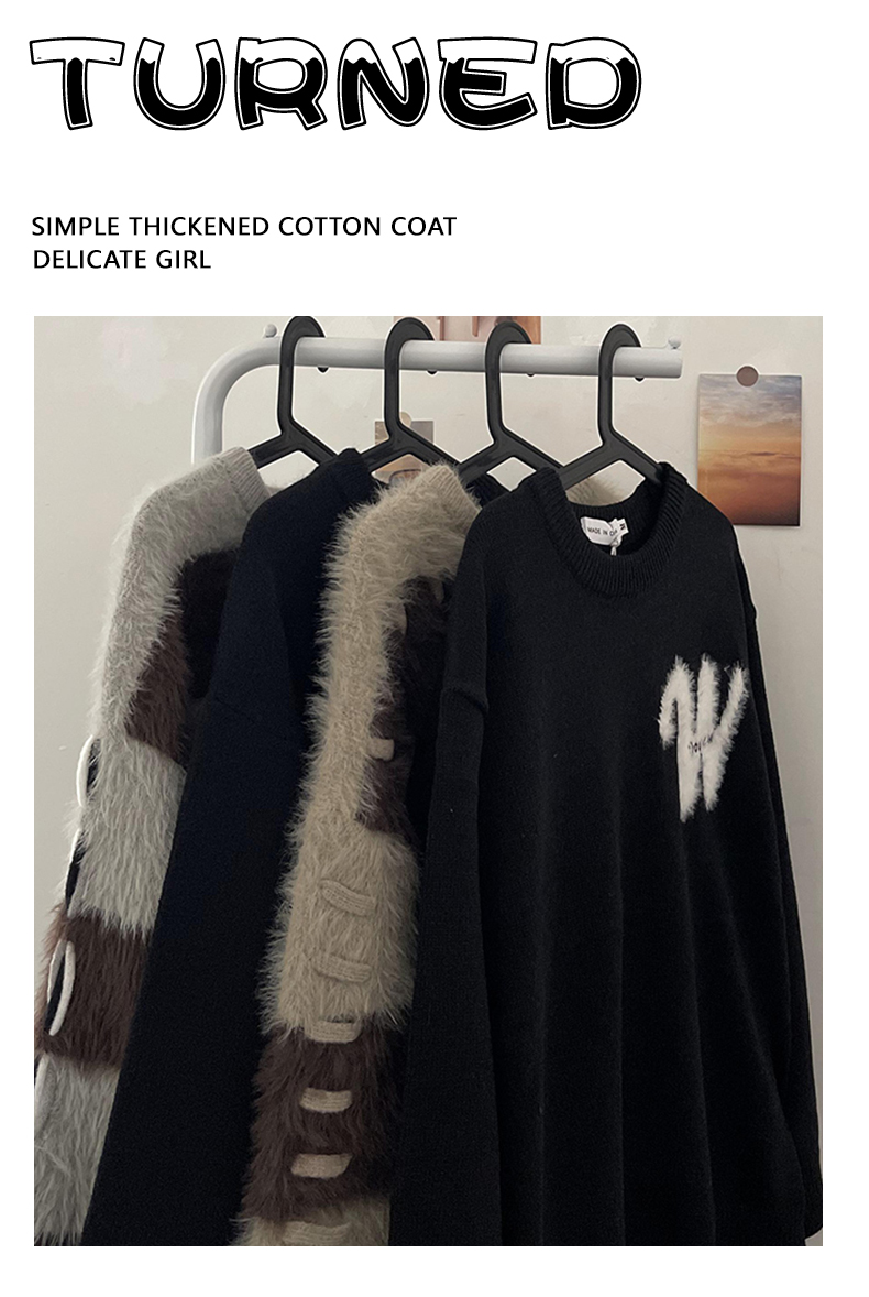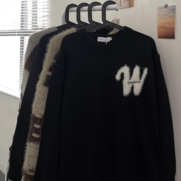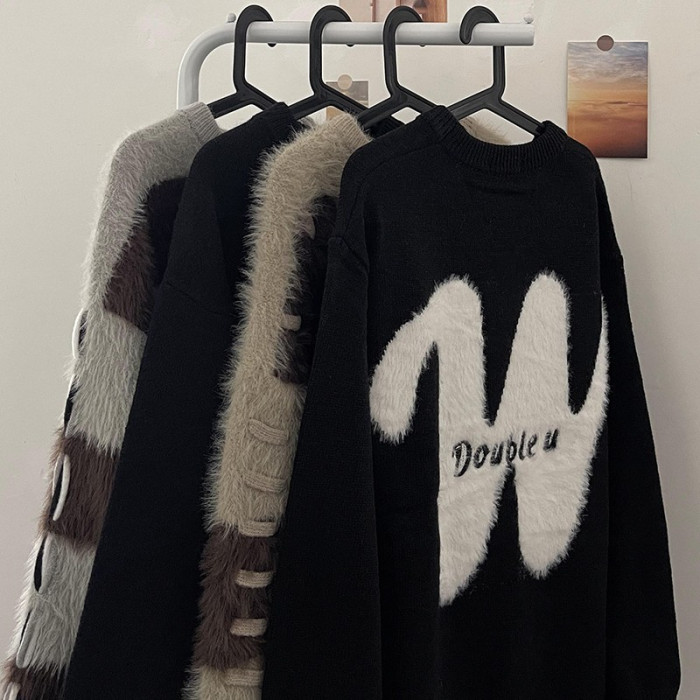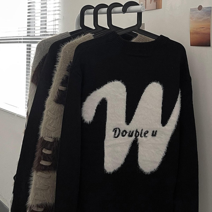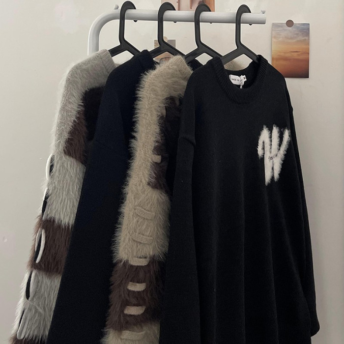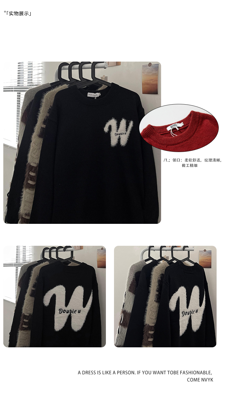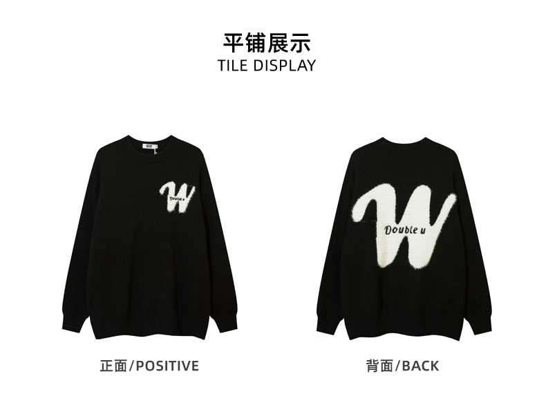 邱細狗QXIGOU圓領馬海毛毛衣男國潮植絨字母寬松百搭針織衫