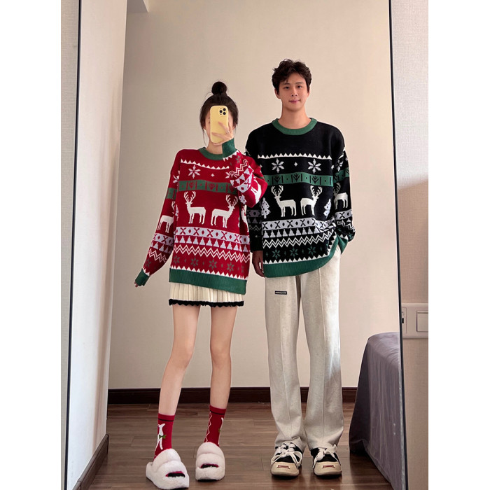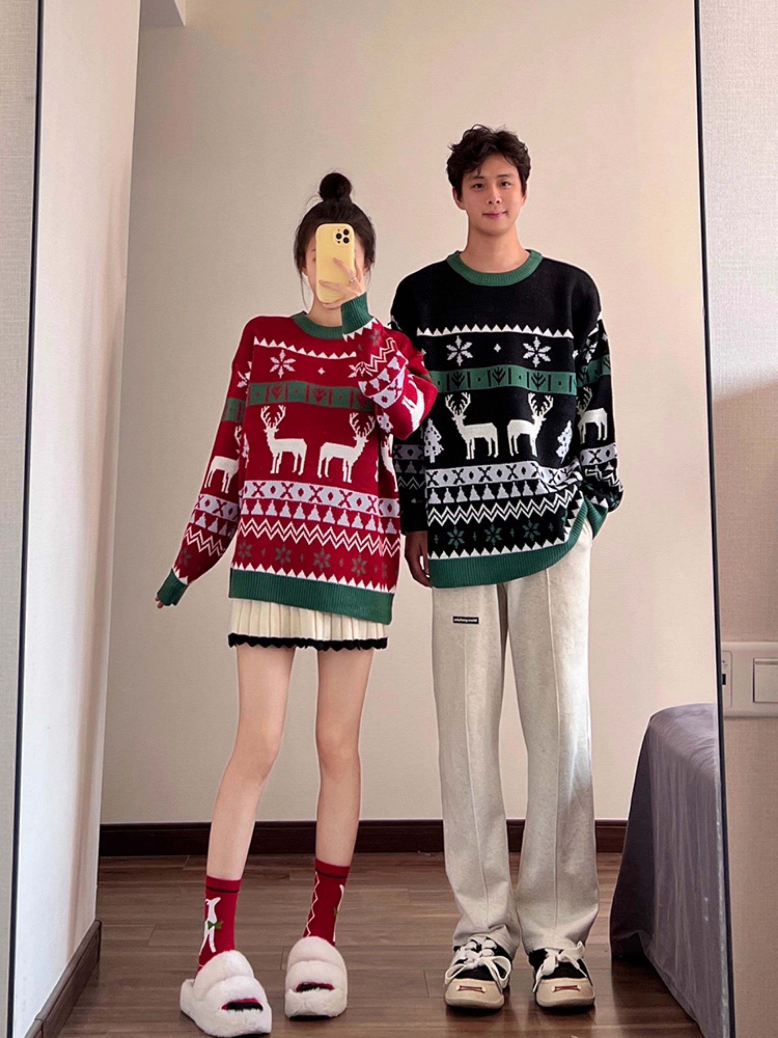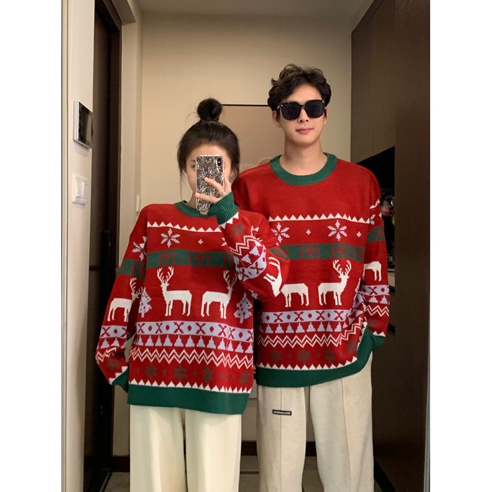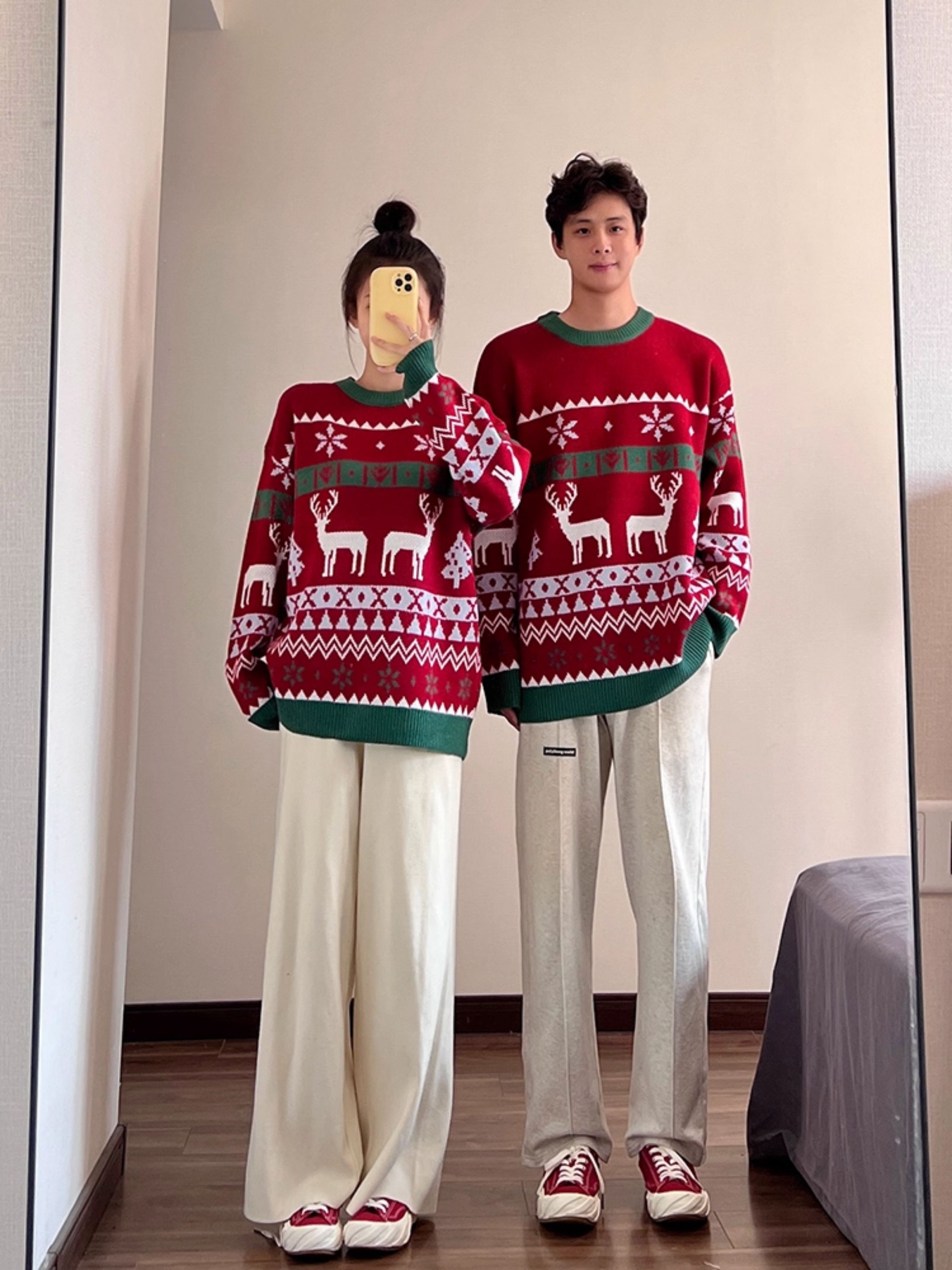 聖誕氛圍感穿搭情侶裝秋冬2025新款針織衫毛衣紅色麋鹿聖誕節戰袍