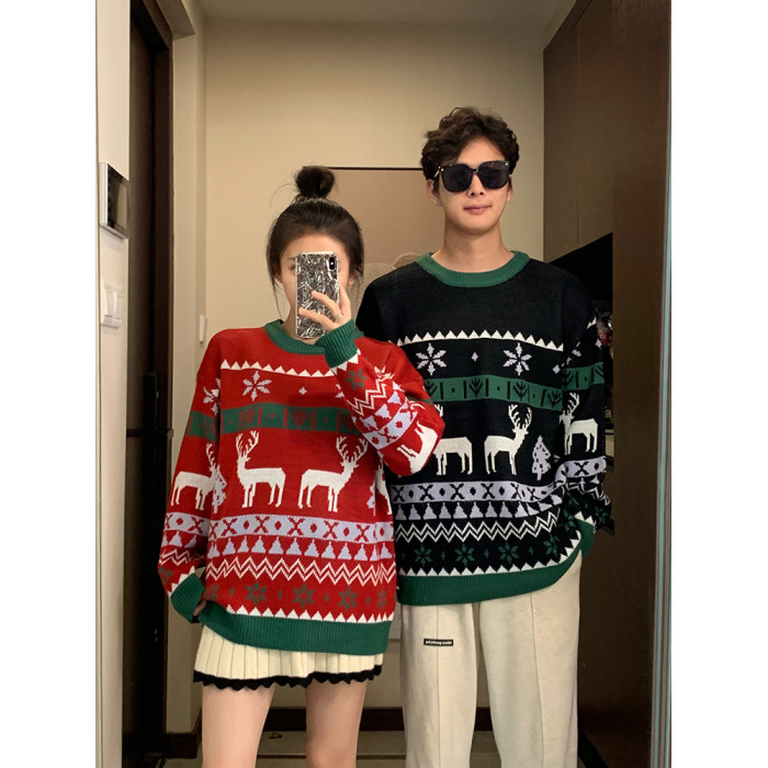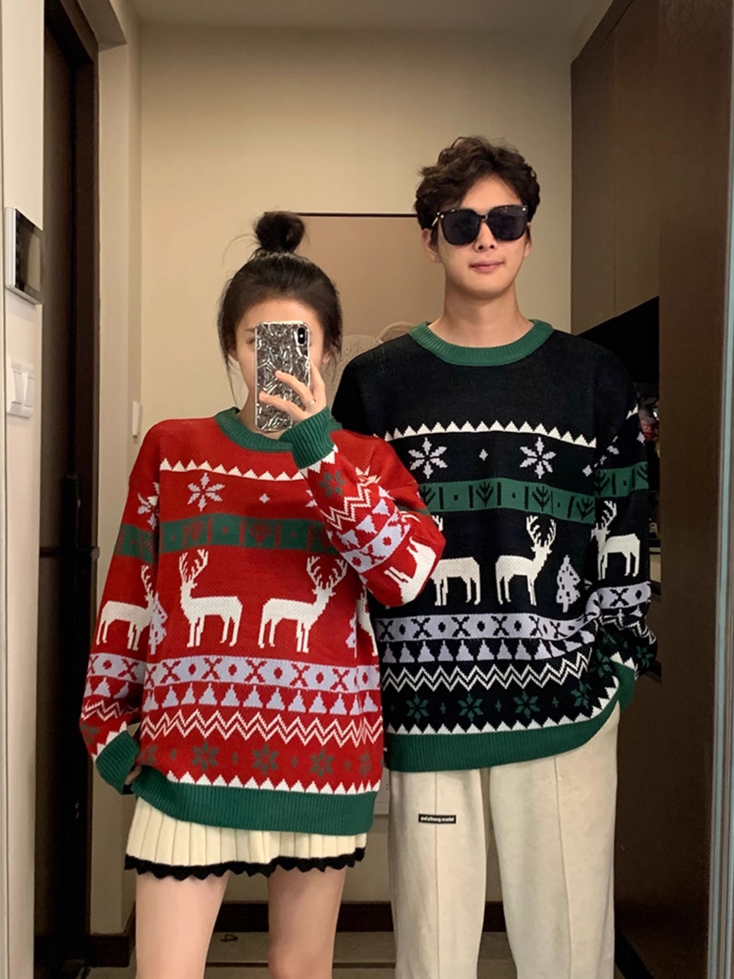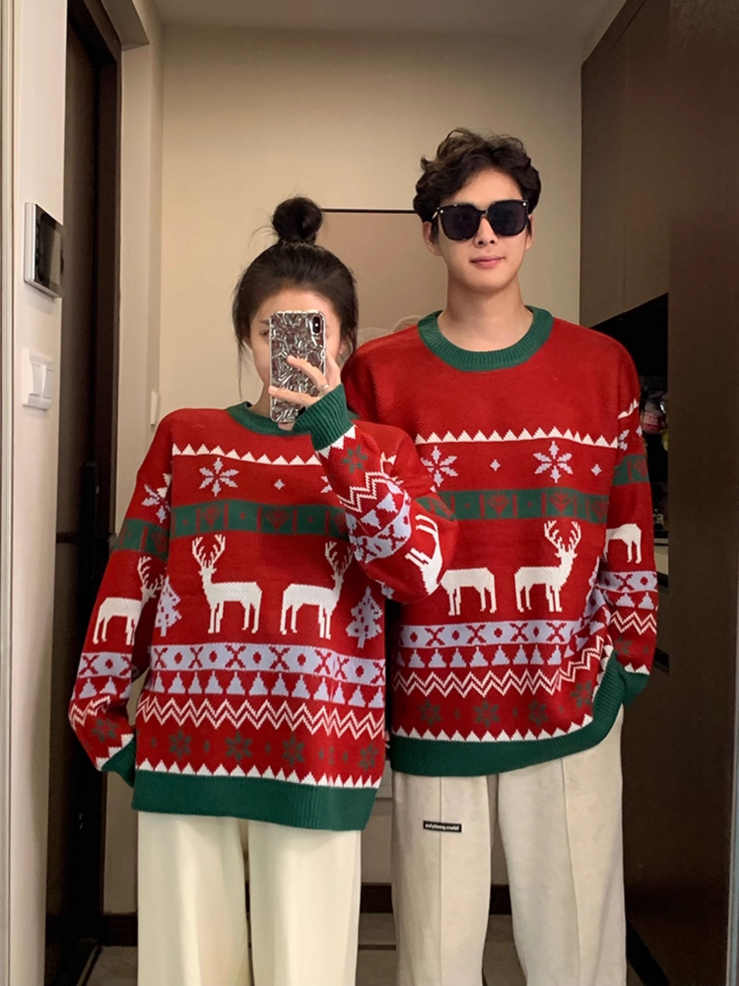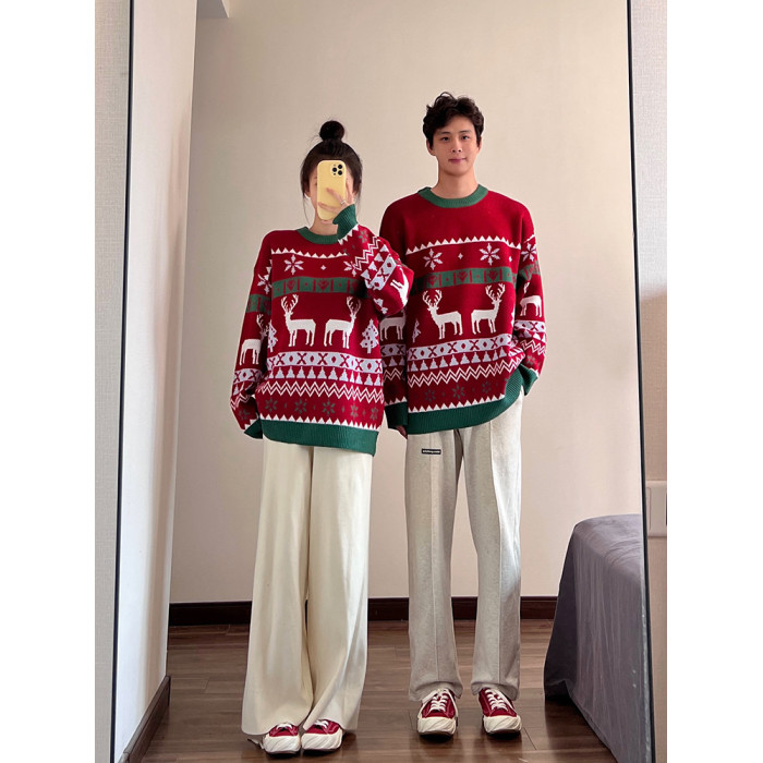 聖誕氛圍感穿搭情侶裝秋冬2025新款針織衫毛衣紅色麋鹿聖誕節戰袍