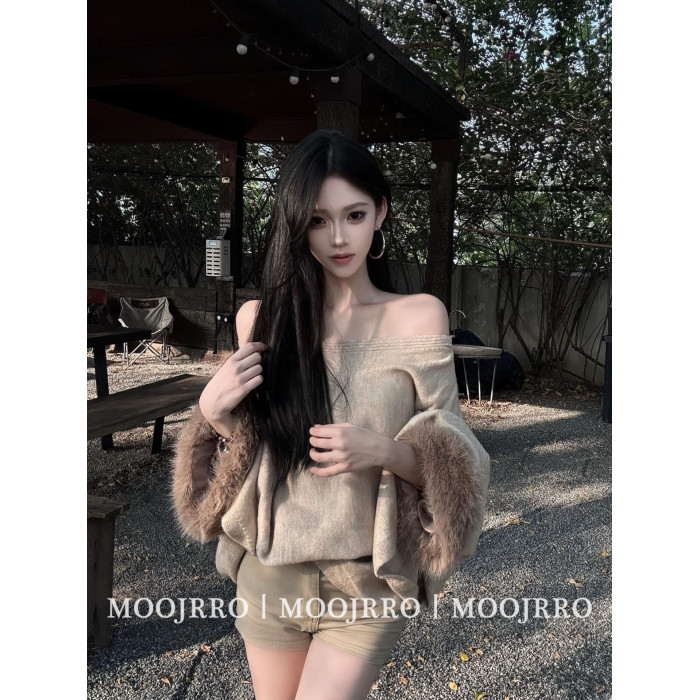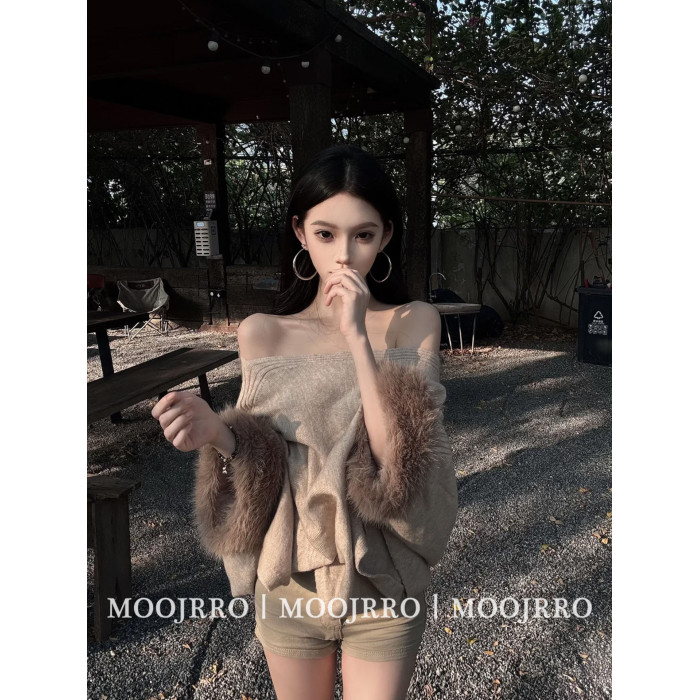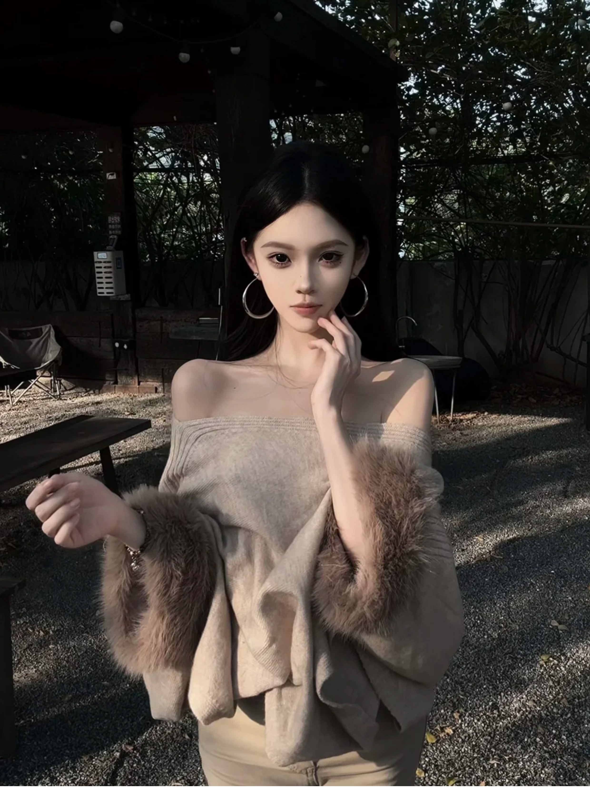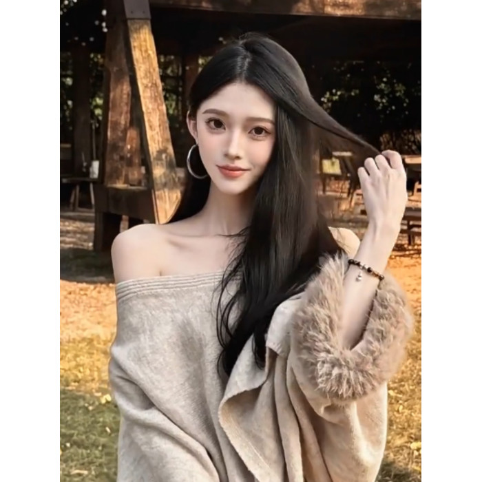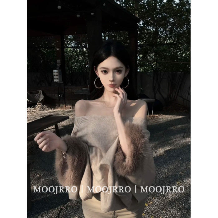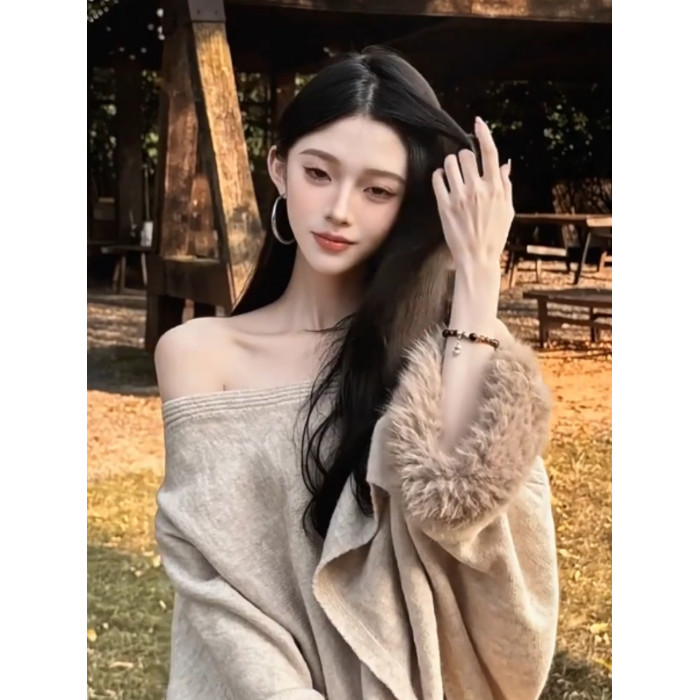 韓系一字肩套頭毛衣女秋冬慵懶氣質長袖針織衫高級感顯瘦寬松上衣