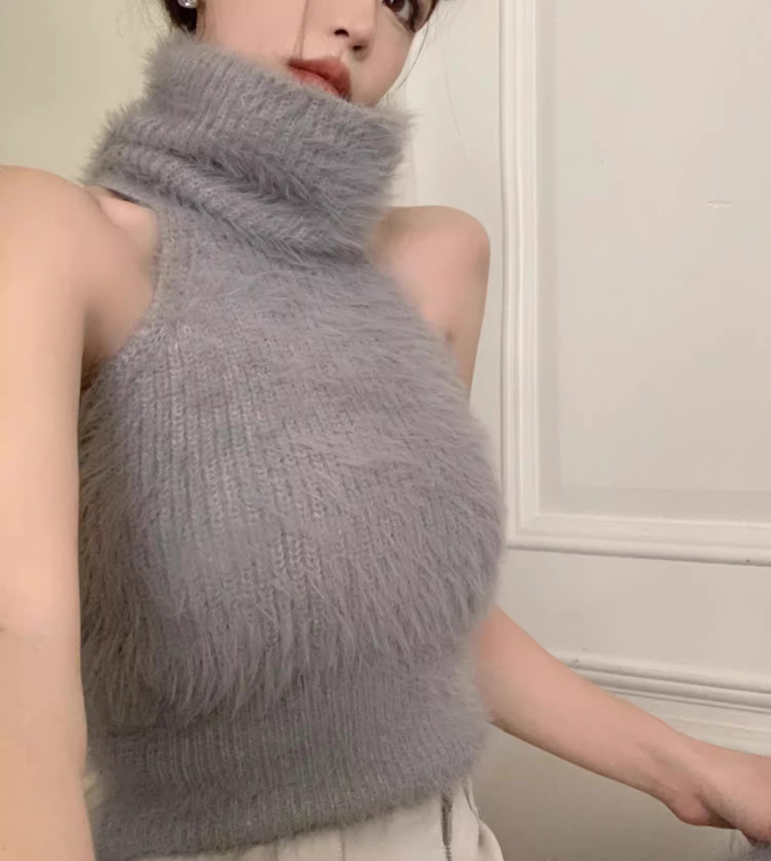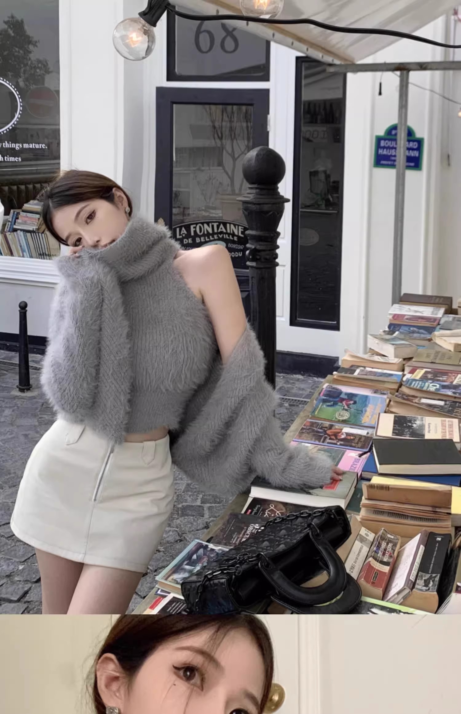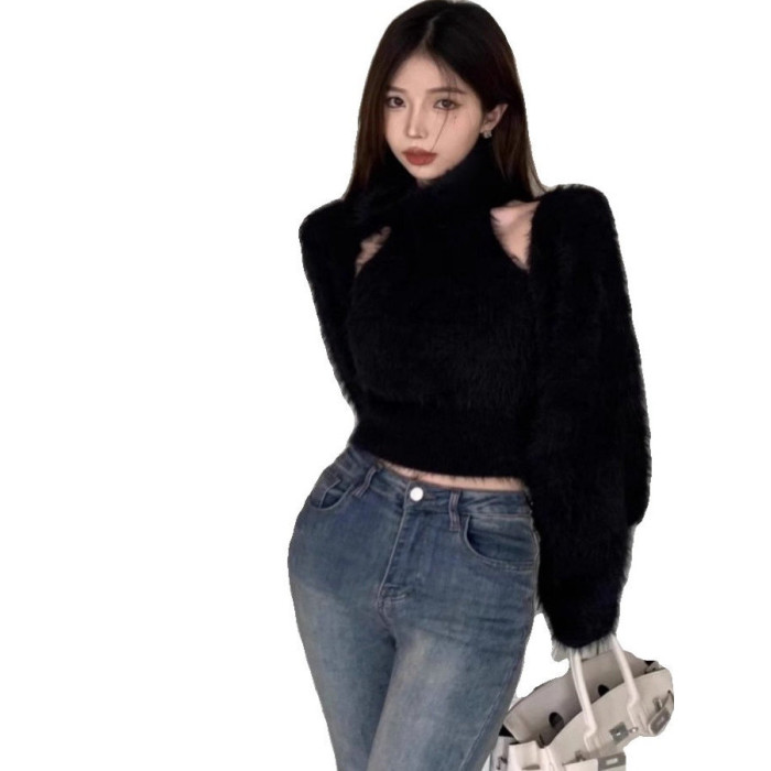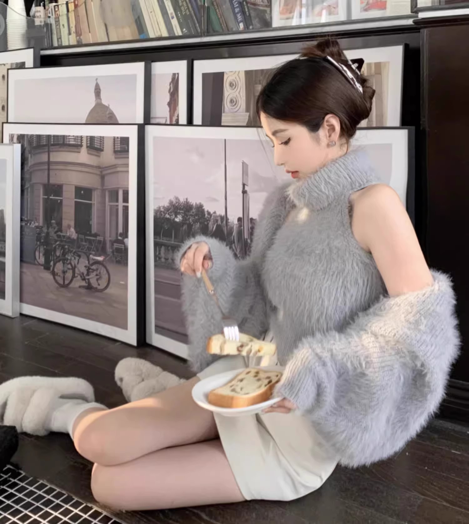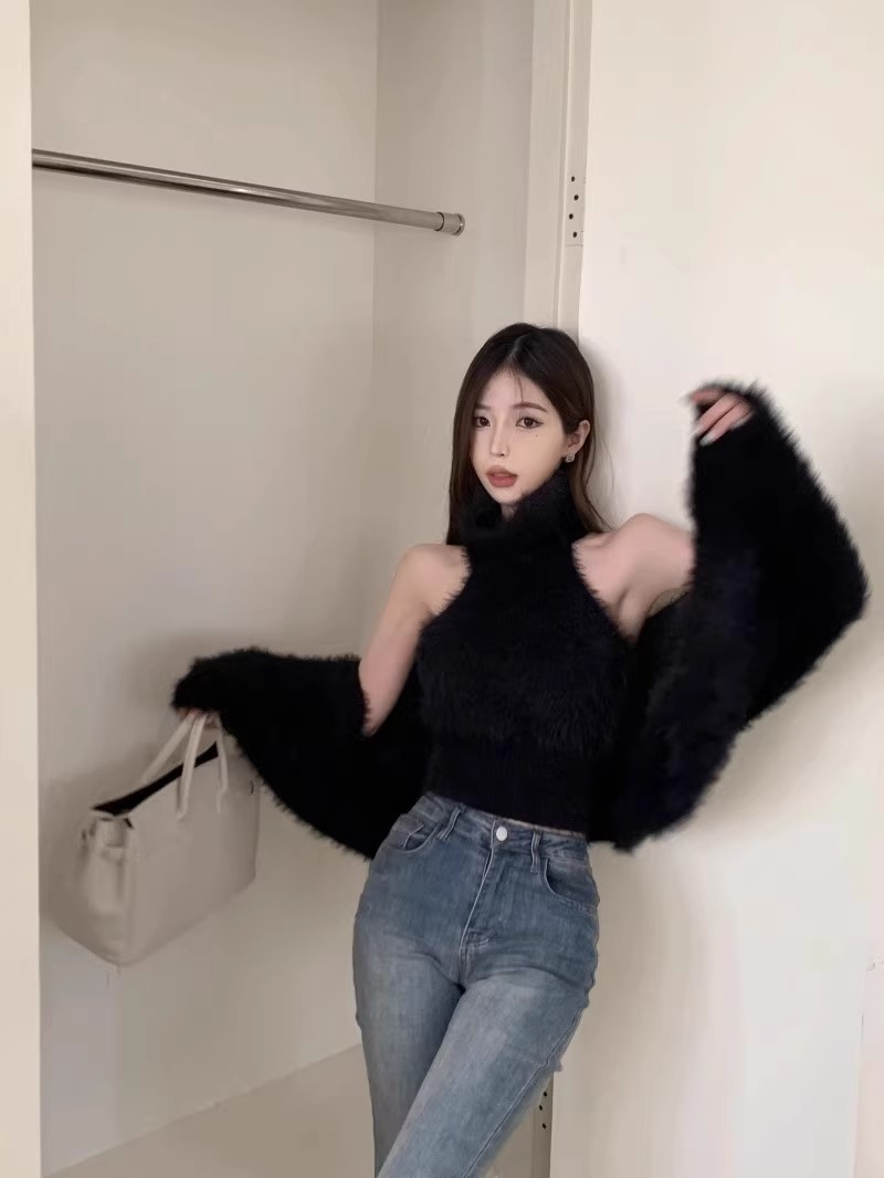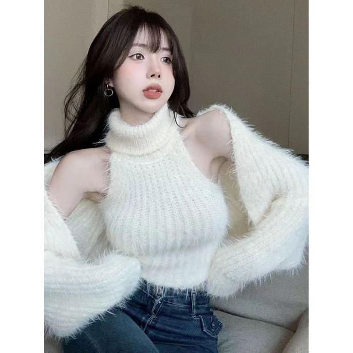 高級感毛衣套裝女秋冬純欲辣妹性感掛脖高領針織打底衫兩件套上衣