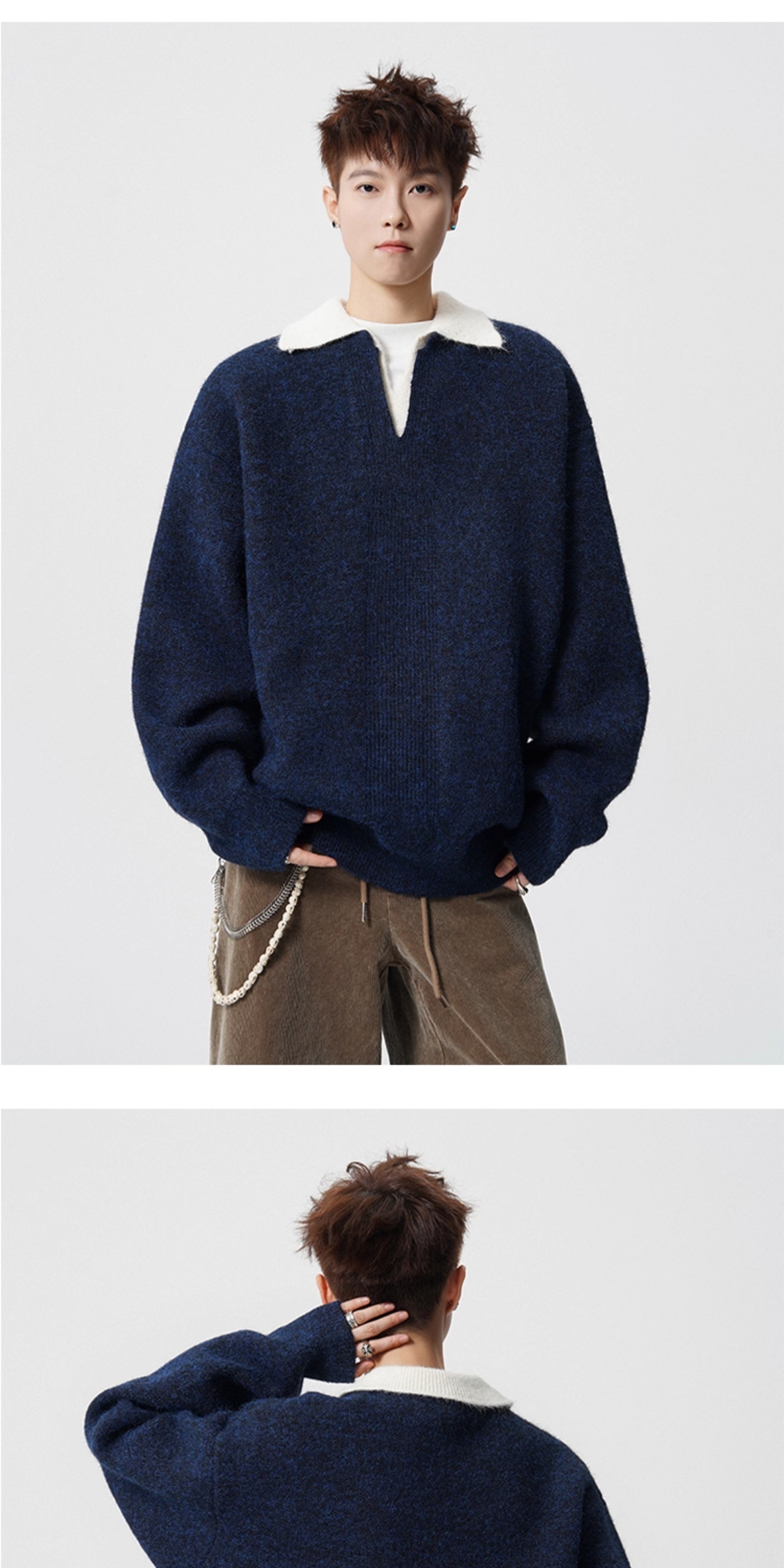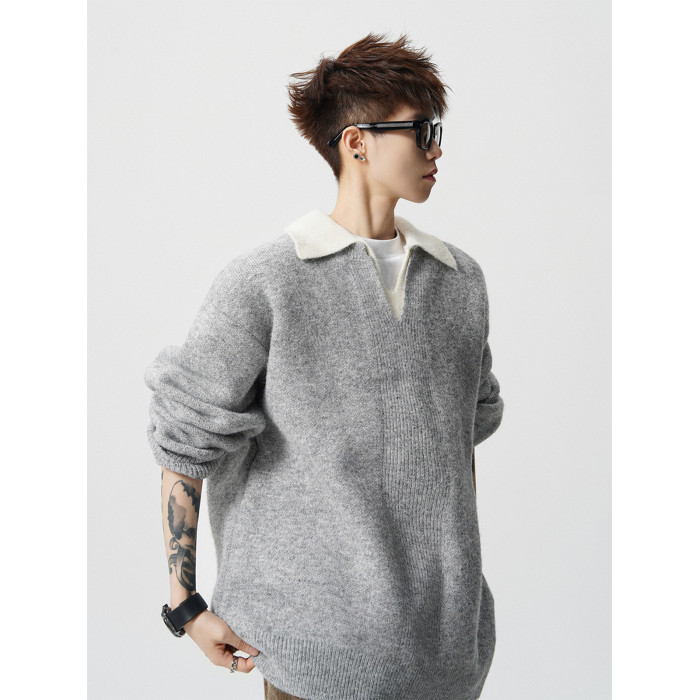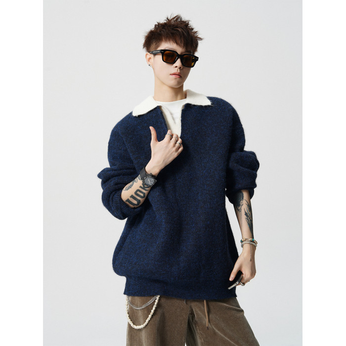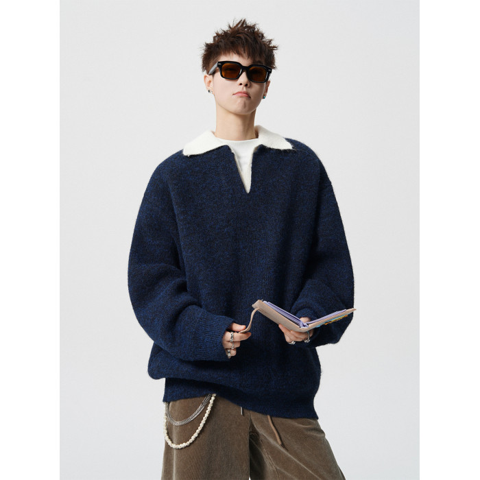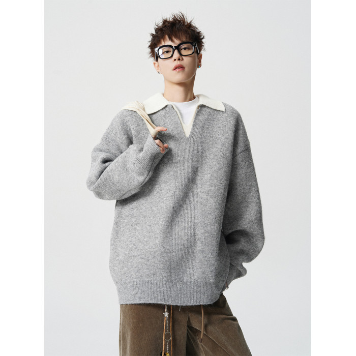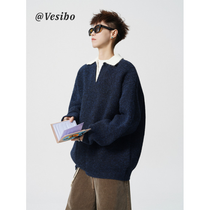 假兩件撞色V領針織衫男冬季美式設計感情侶毛衣潮牌百搭休閒內搭