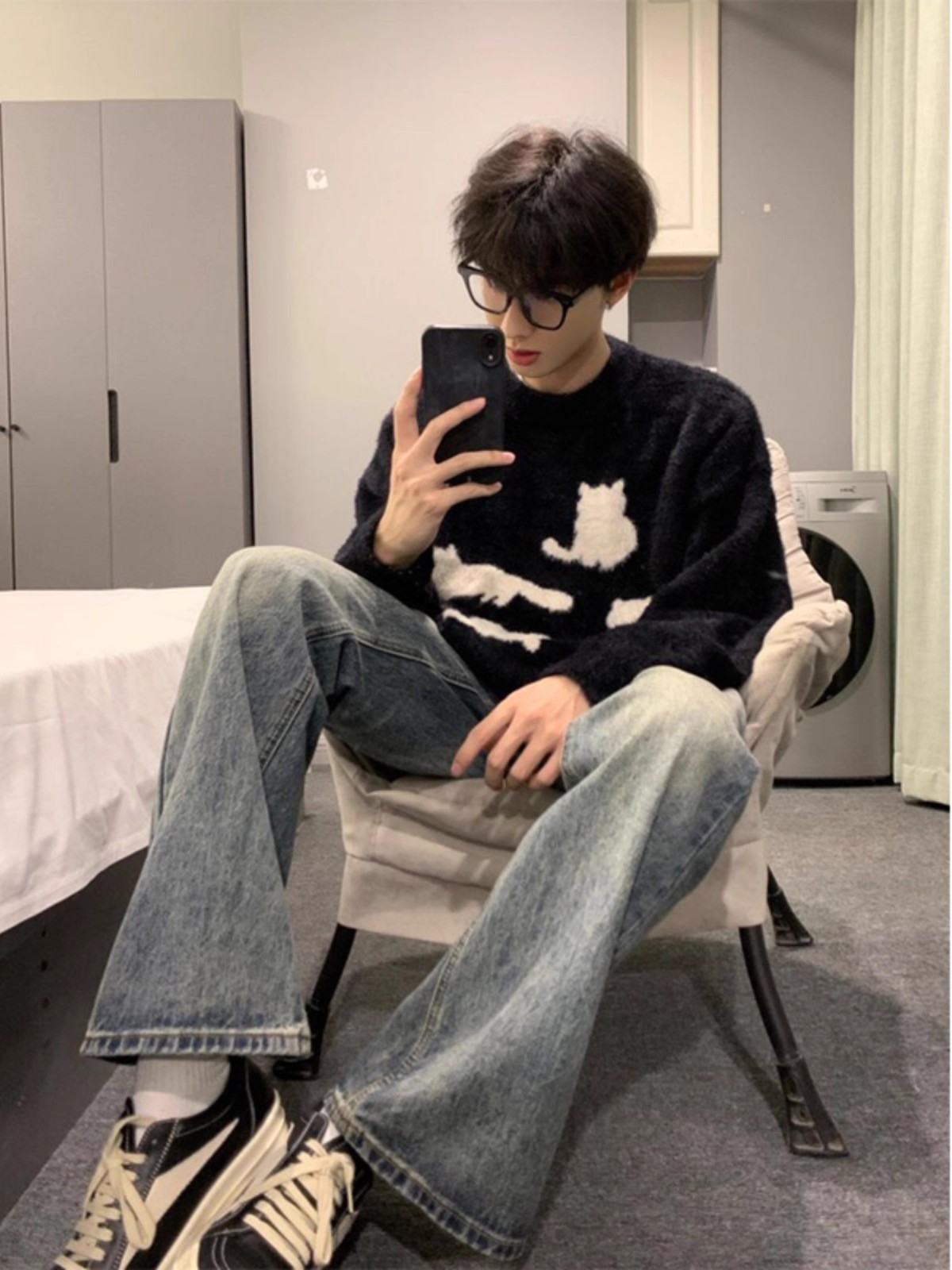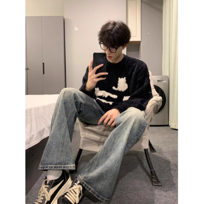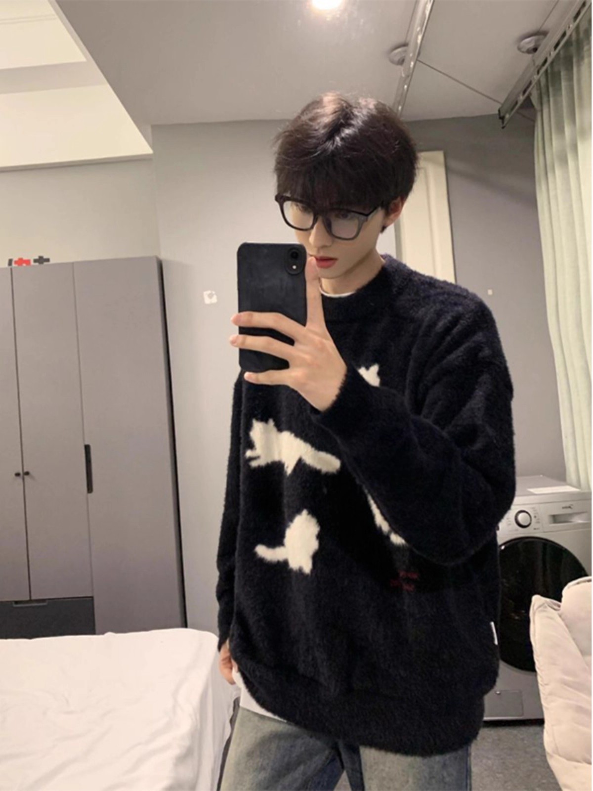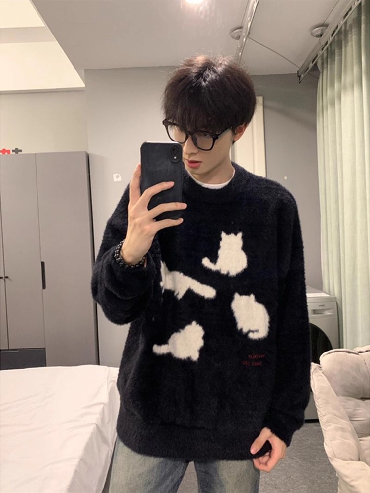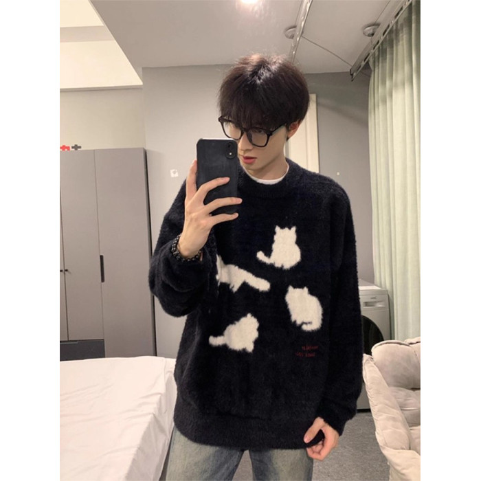 美式復古貓咪馬海毛毛衣男秋冬季潮牌慵懶風圓領針織衫高級感外套