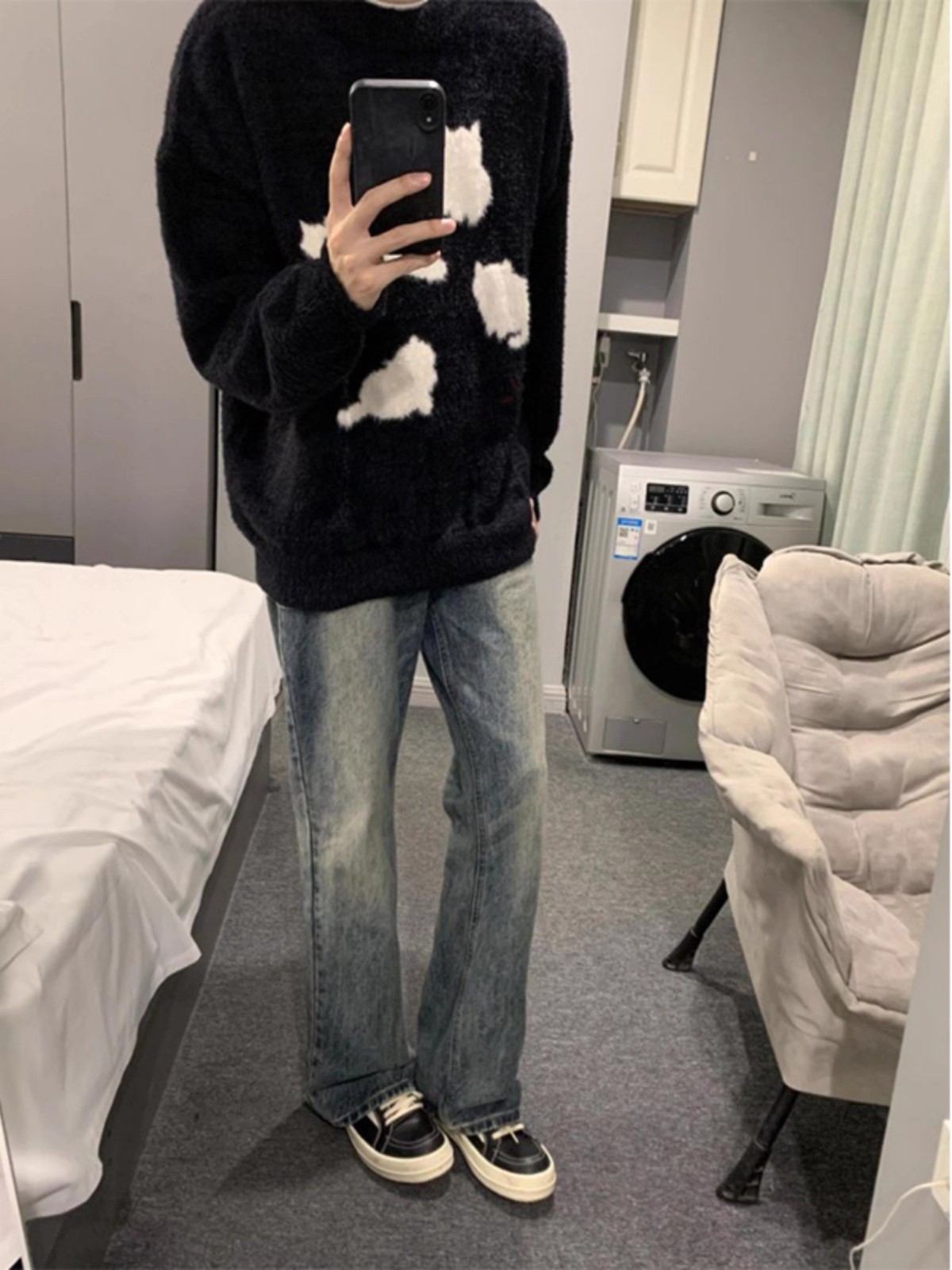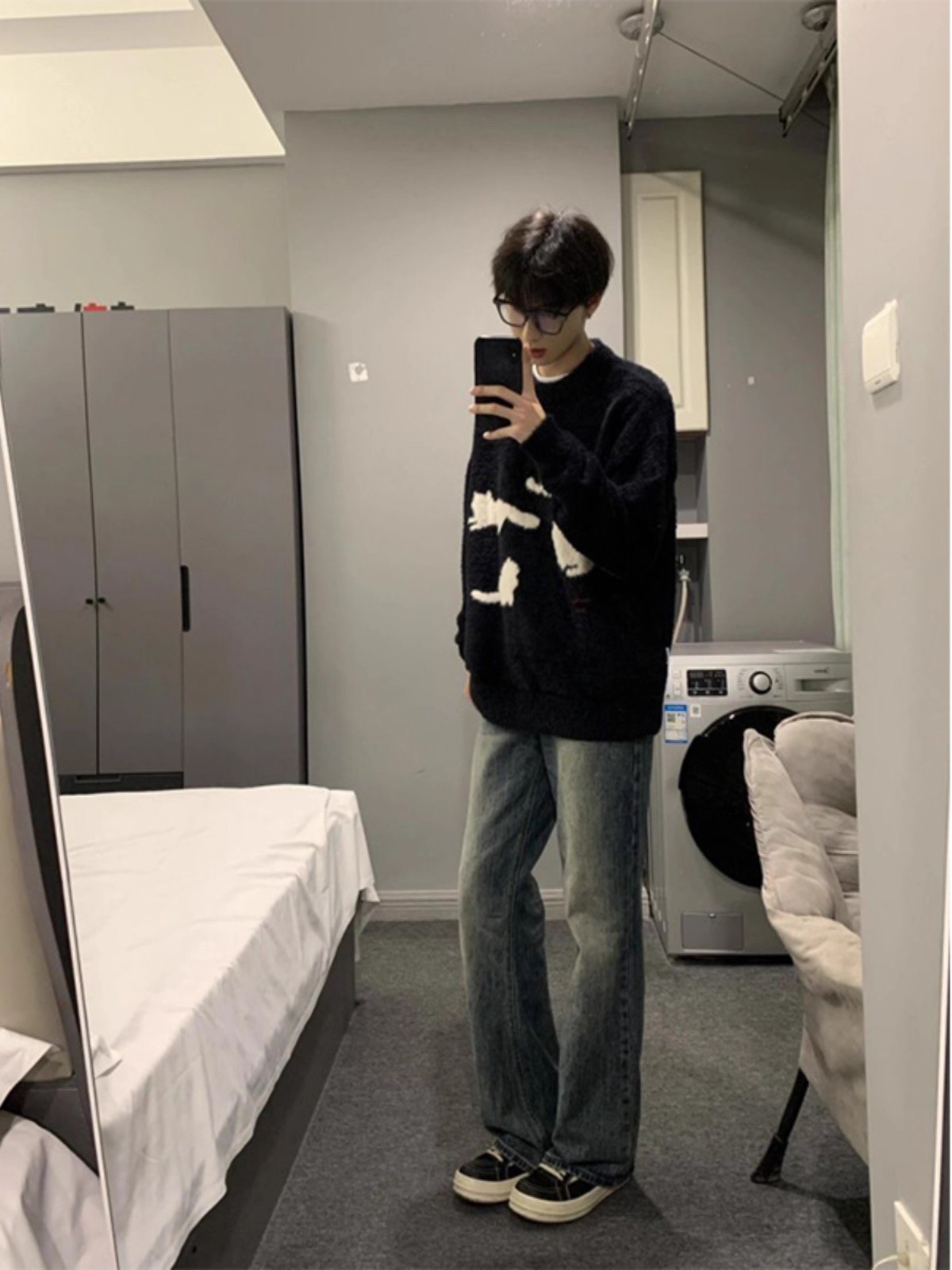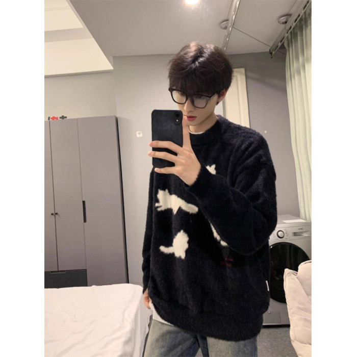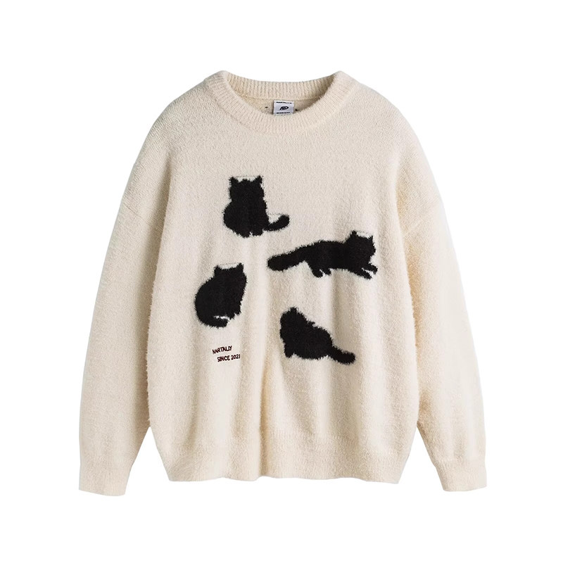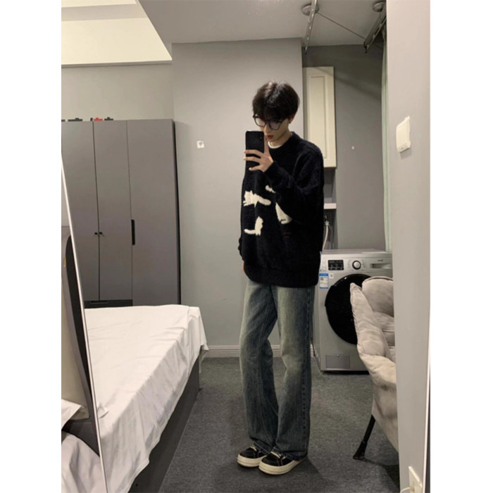 美式復古貓咪馬海毛毛衣男秋冬季潮牌慵懶風圓領針織衫高級感外套