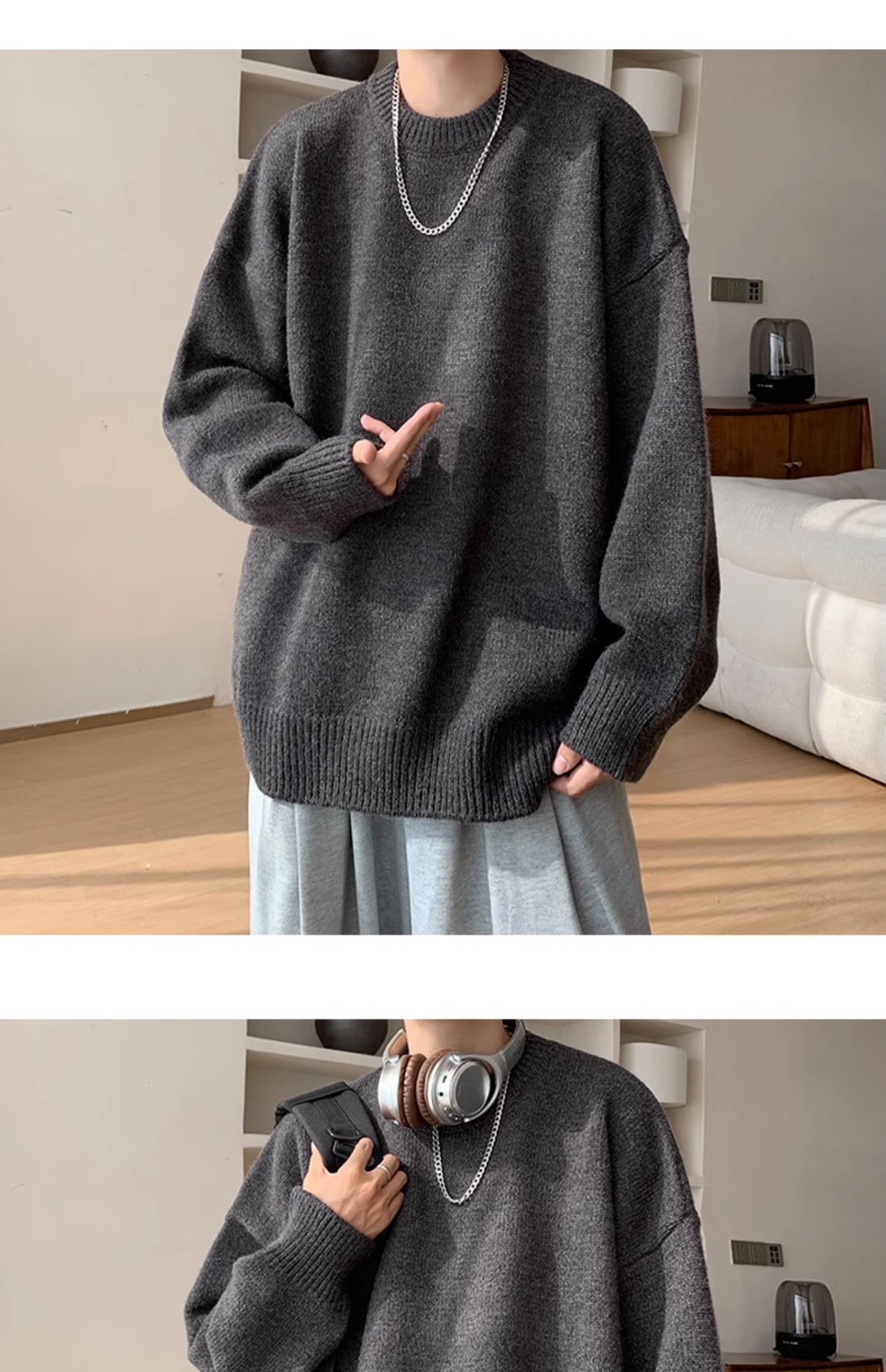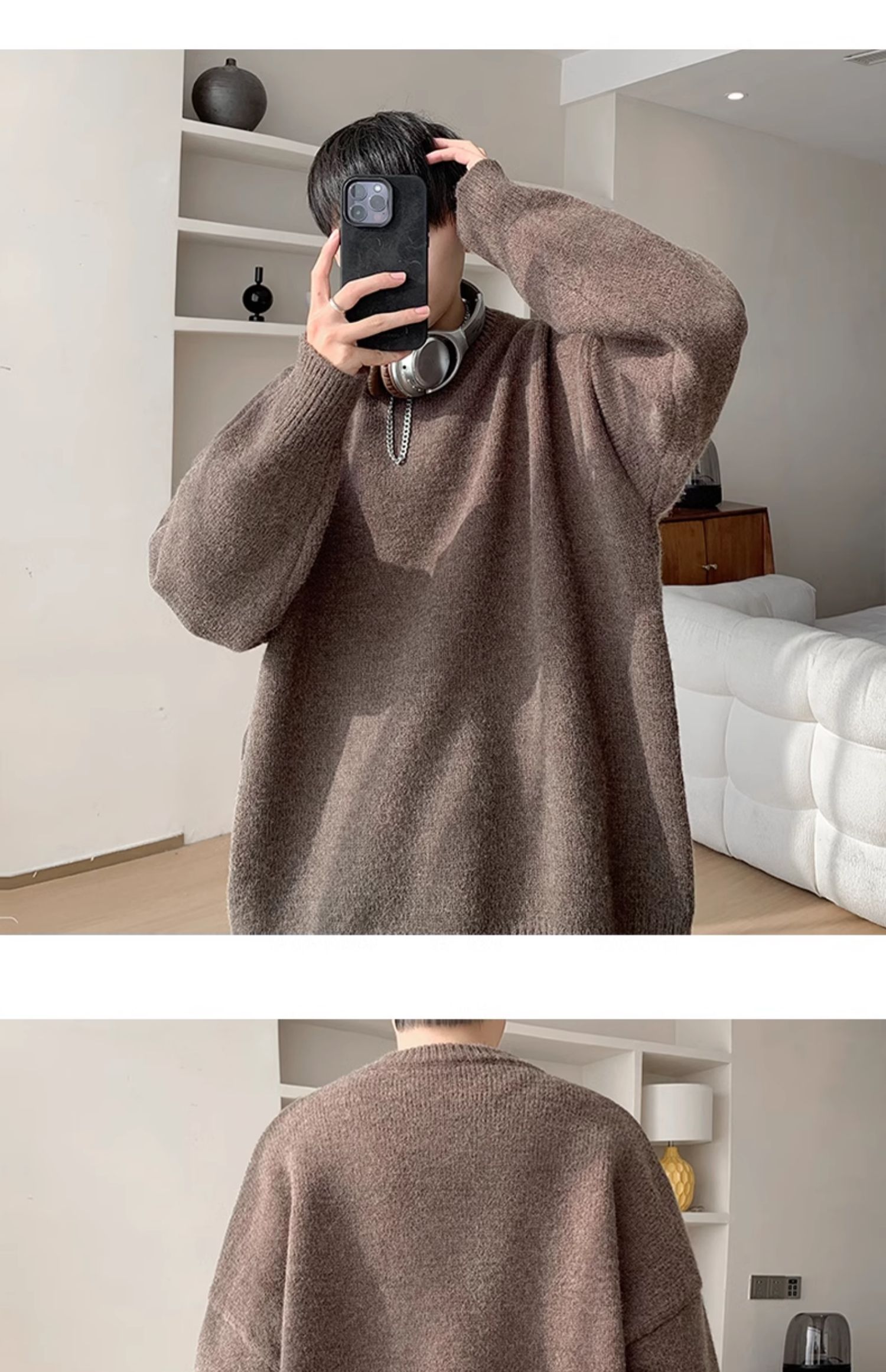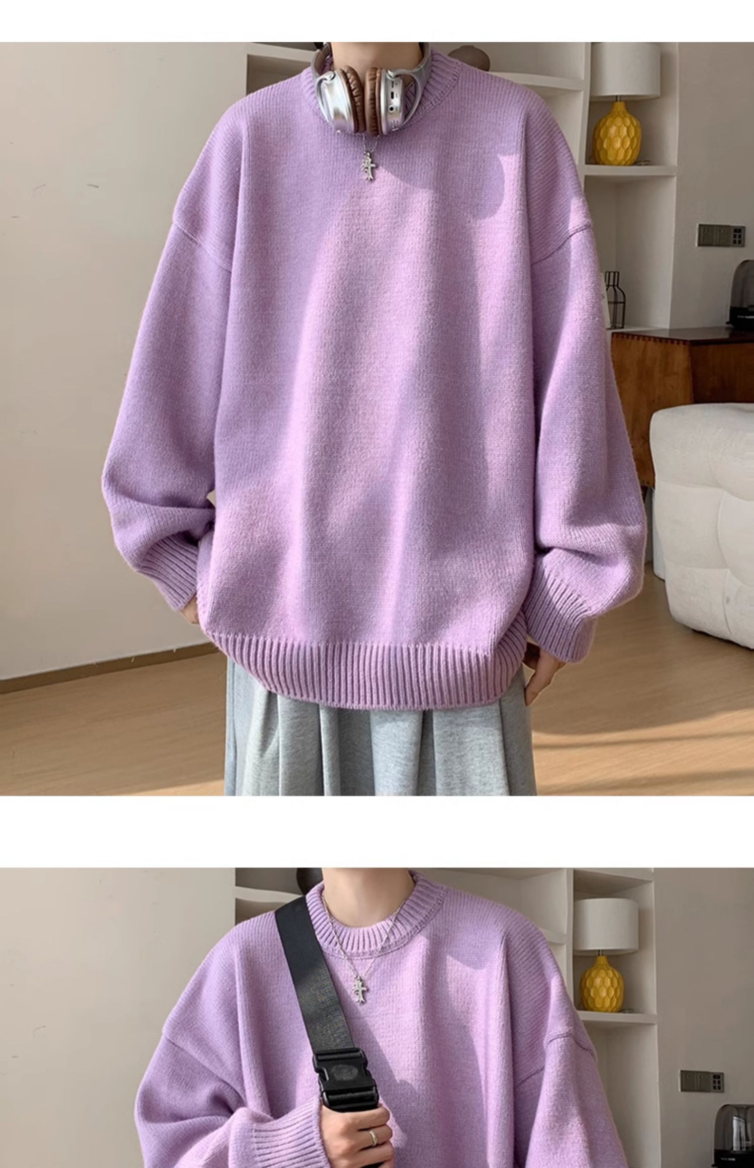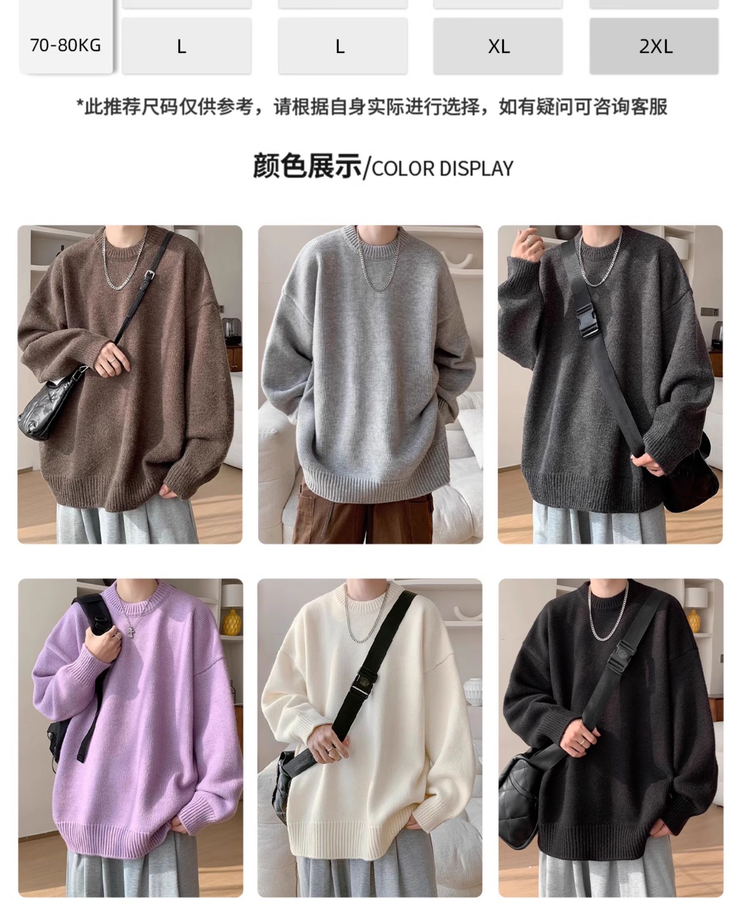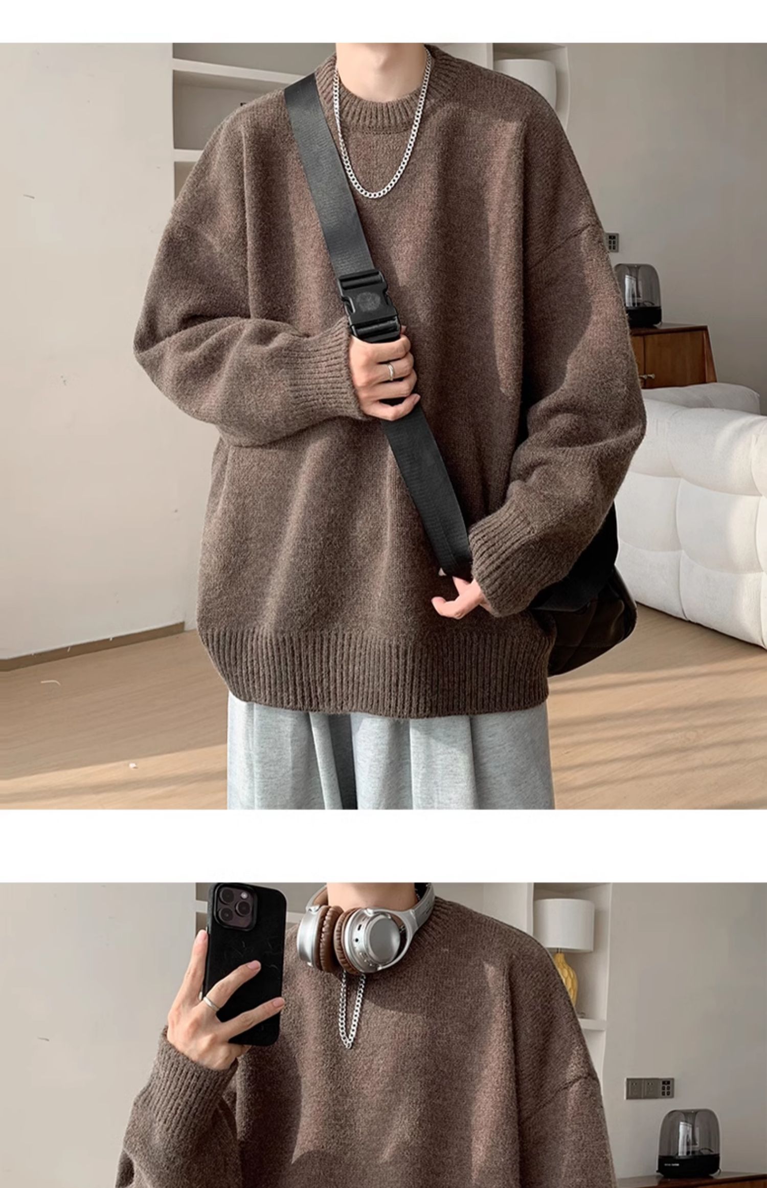 美式慵懶風圓領毛衣男冬季潮牌vintage情侶針織衫復古純色套頭衫