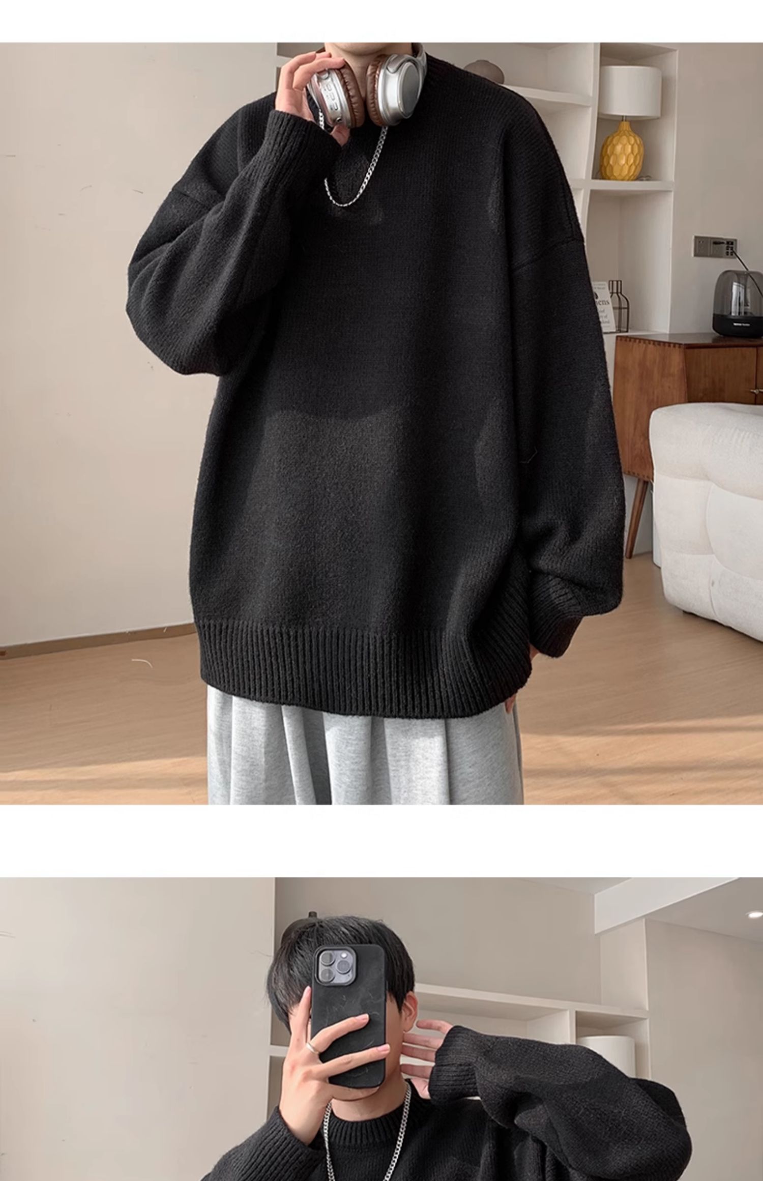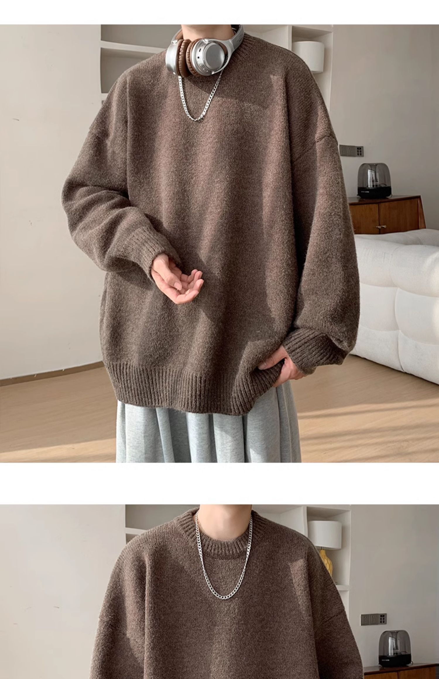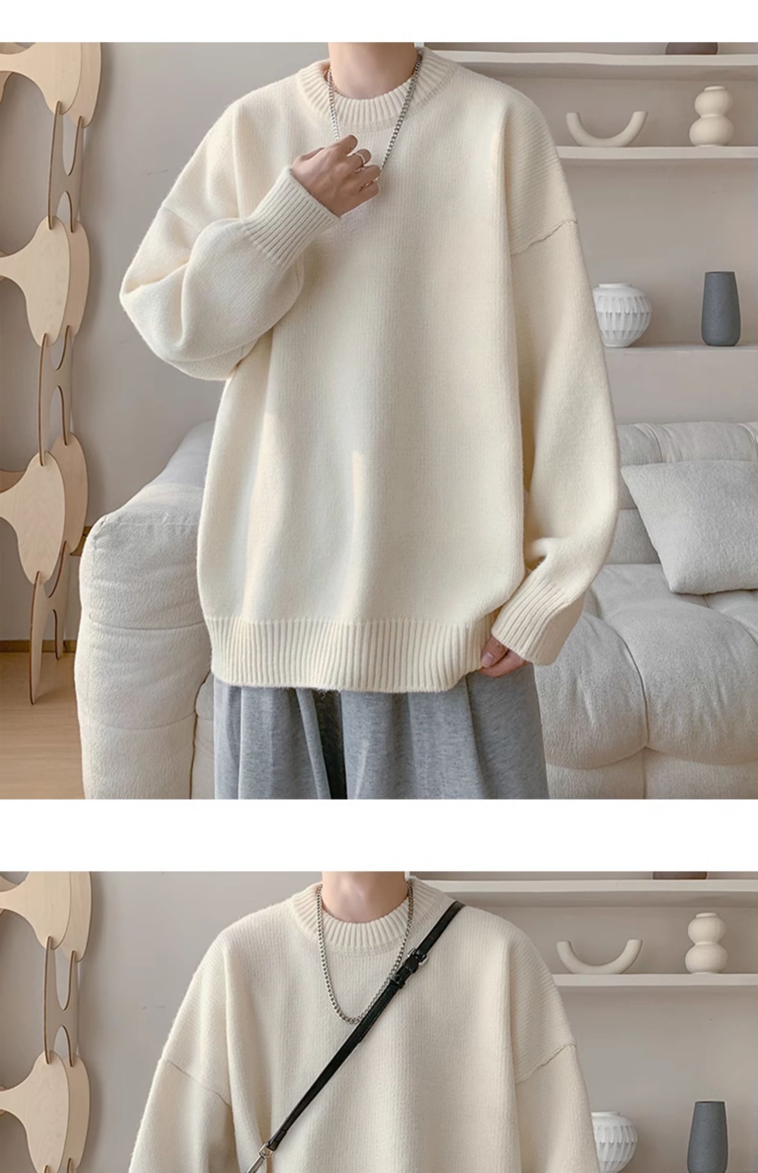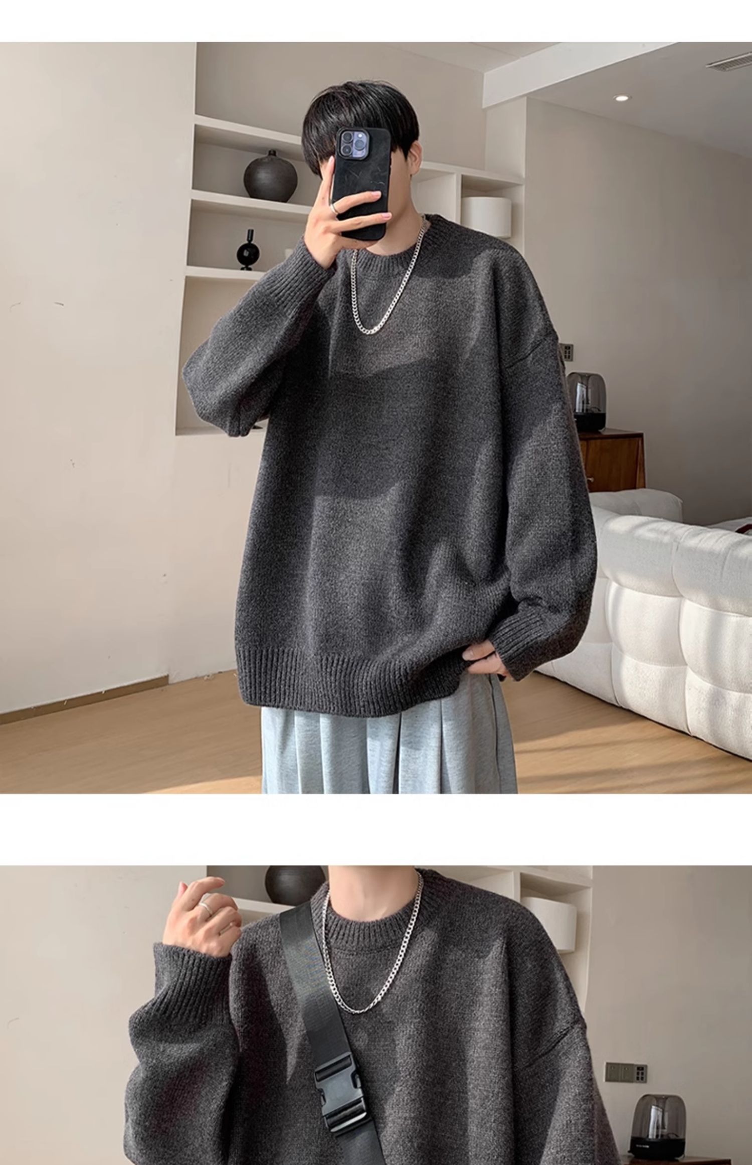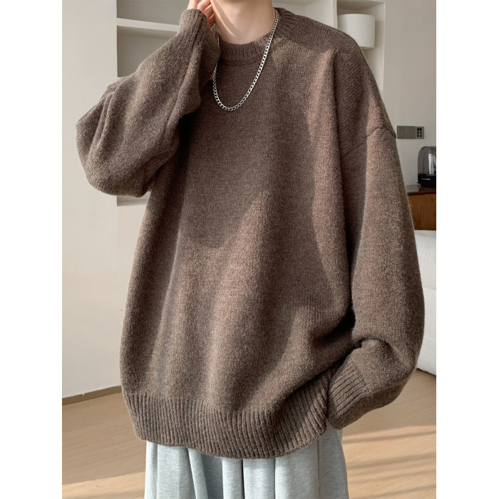 美式慵懶風圓領毛衣男冬季潮牌vintage情侶針織衫復古純色套頭衫