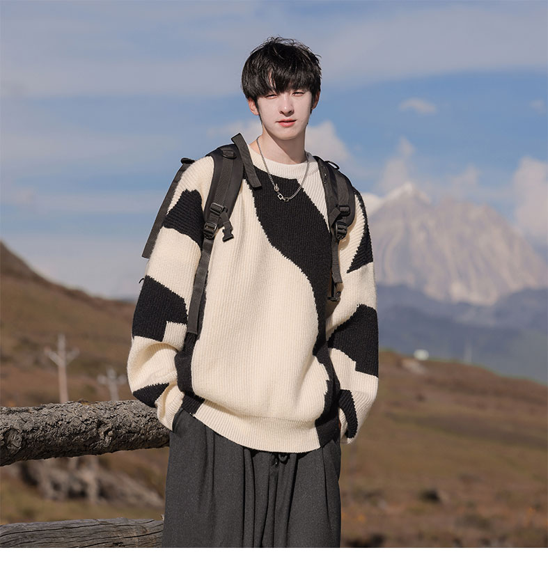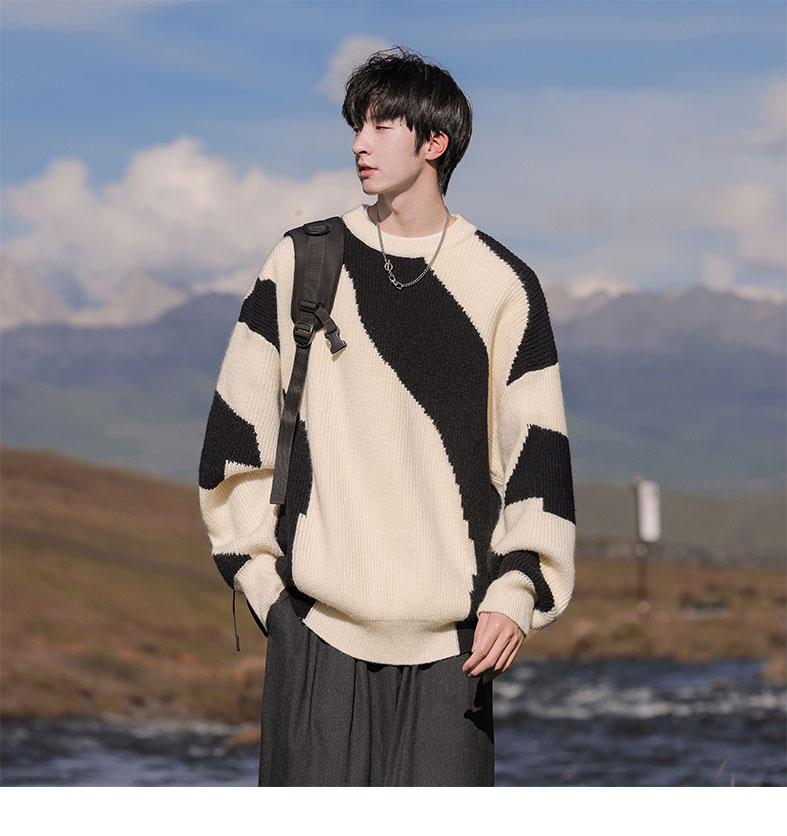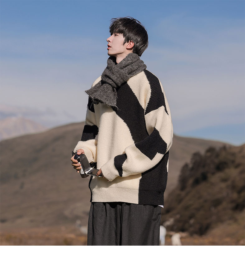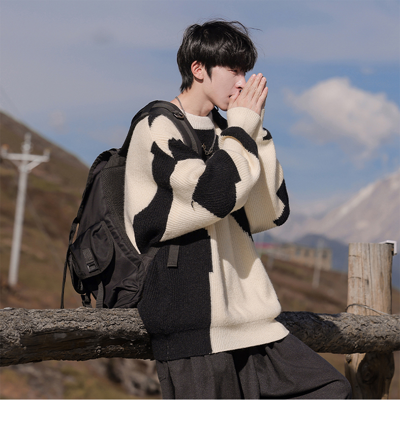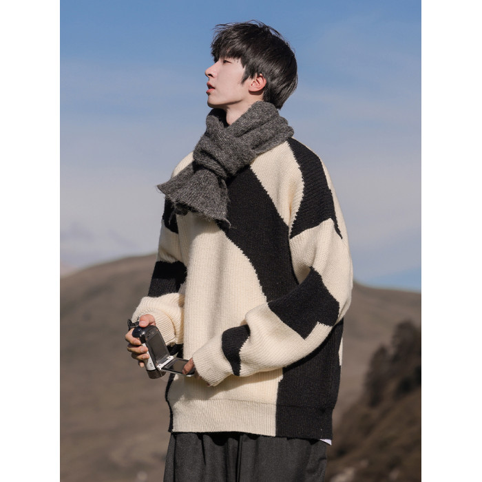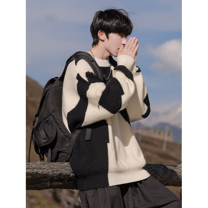 黑白撞色毛衣男款秋冬季港風潮流百搭寬松休閒男生圓領上衣針織衫