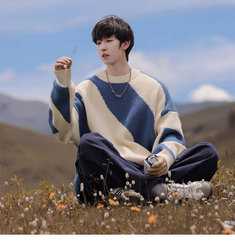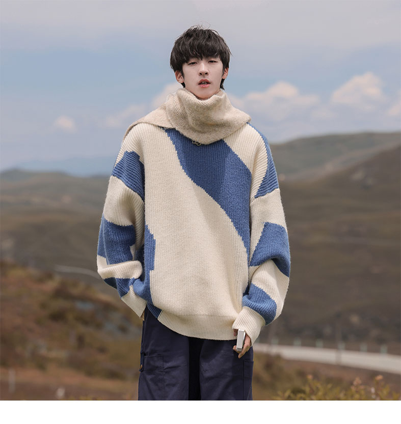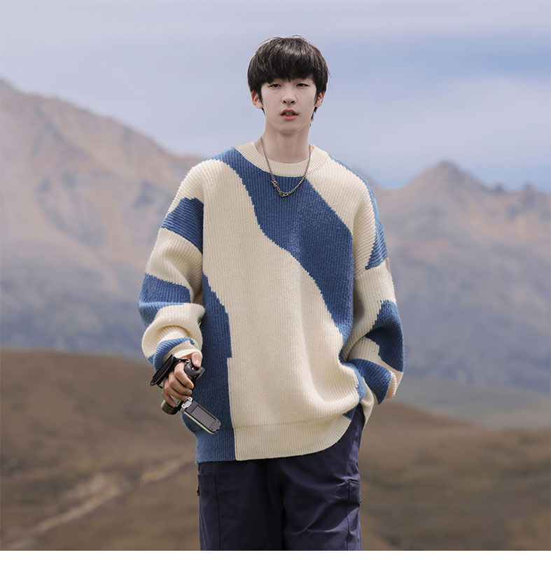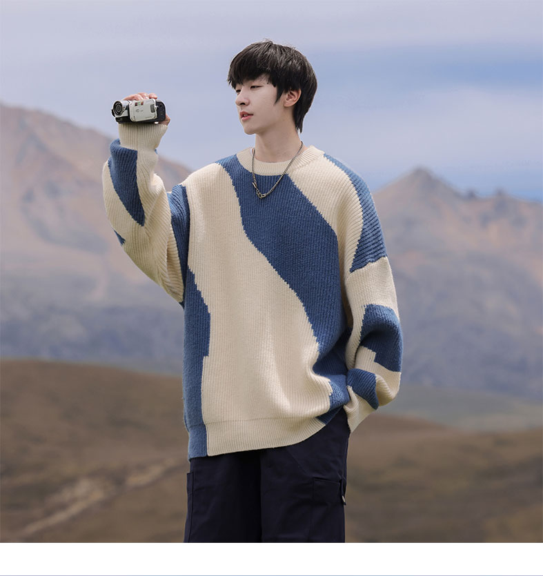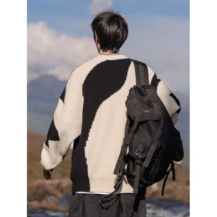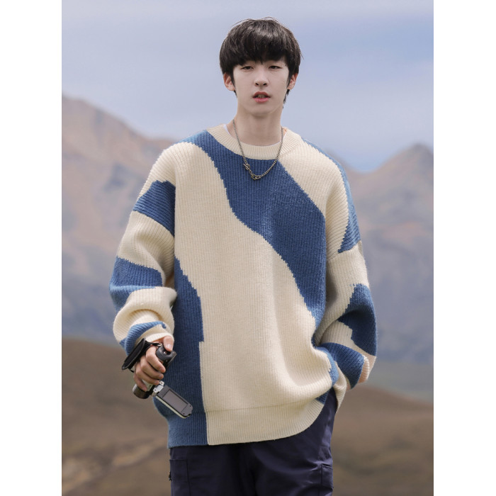 黑白撞色毛衣男款秋冬季港風潮流百搭寬松休閒男生圓領上衣針織衫