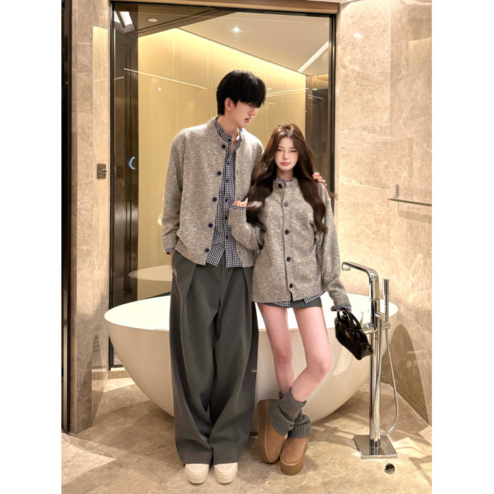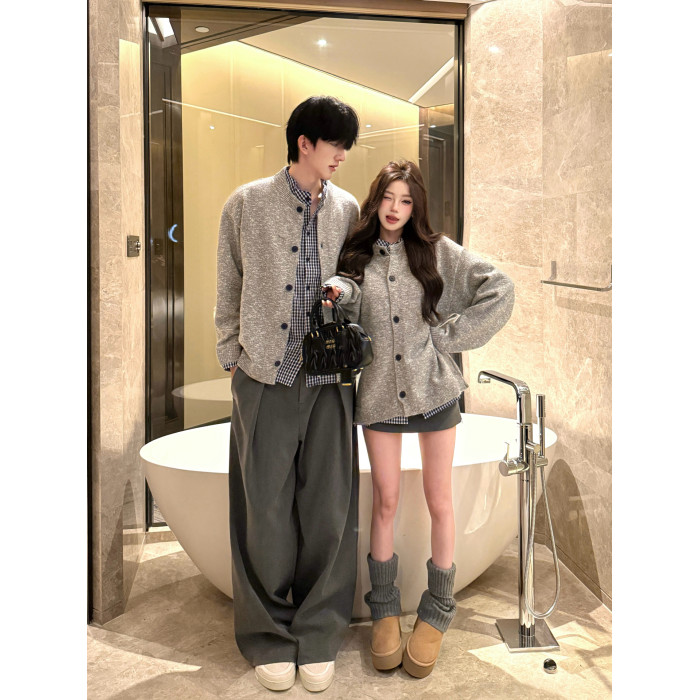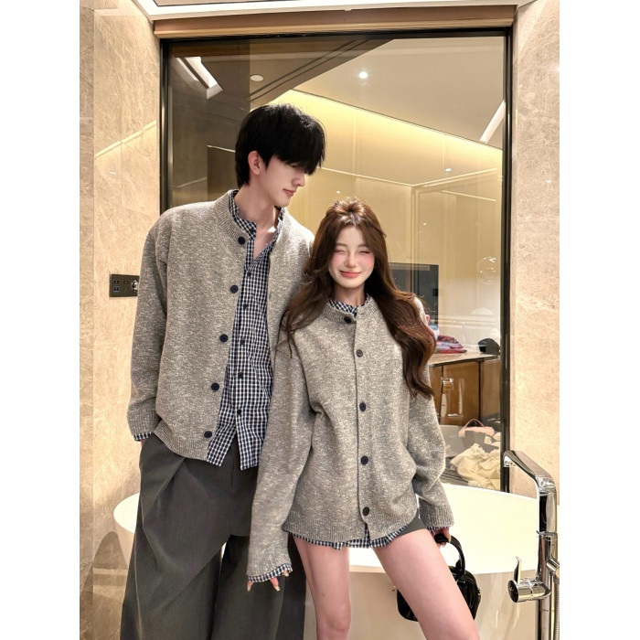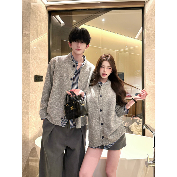 美式復古假兩件格子拼接毛衣男女情侶裝秋冬季高級感針織開衫外套