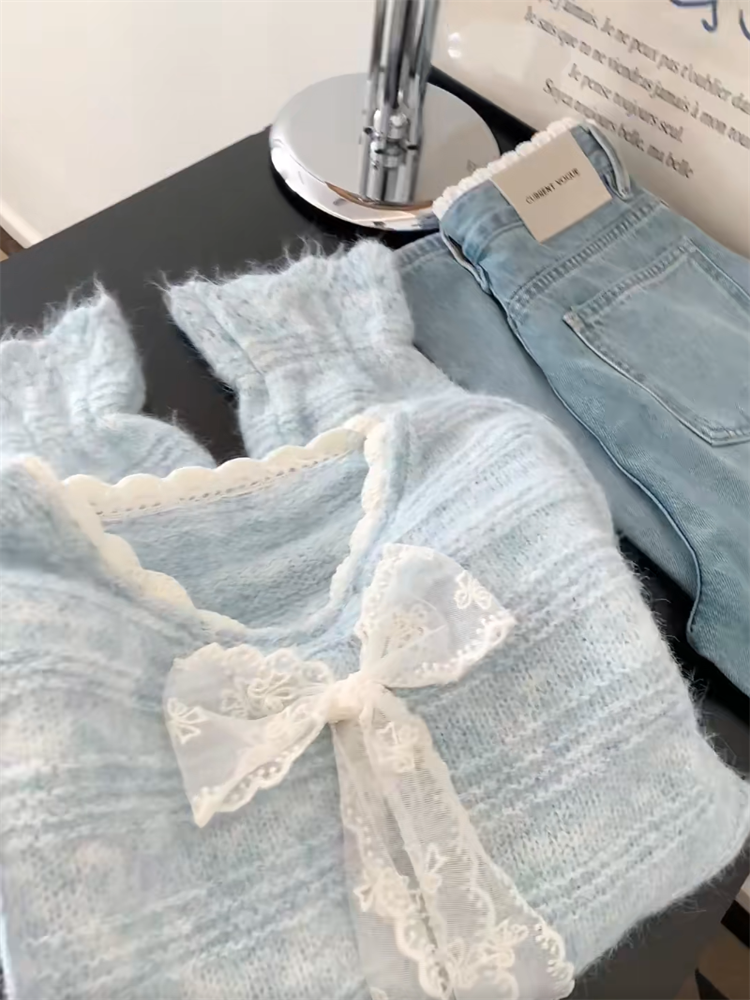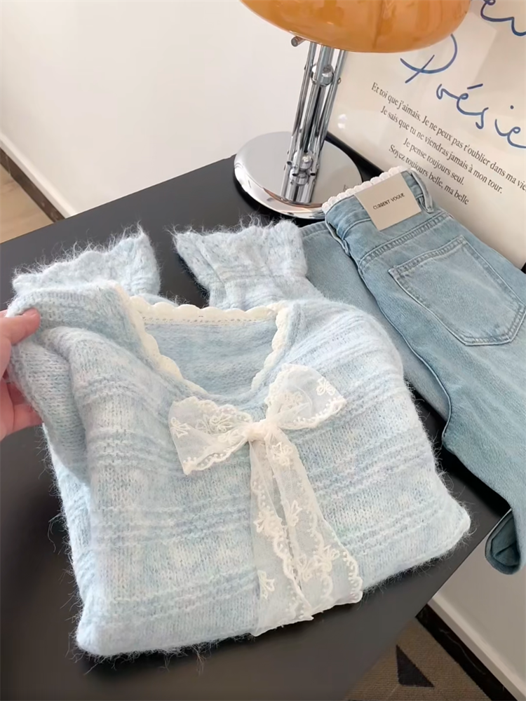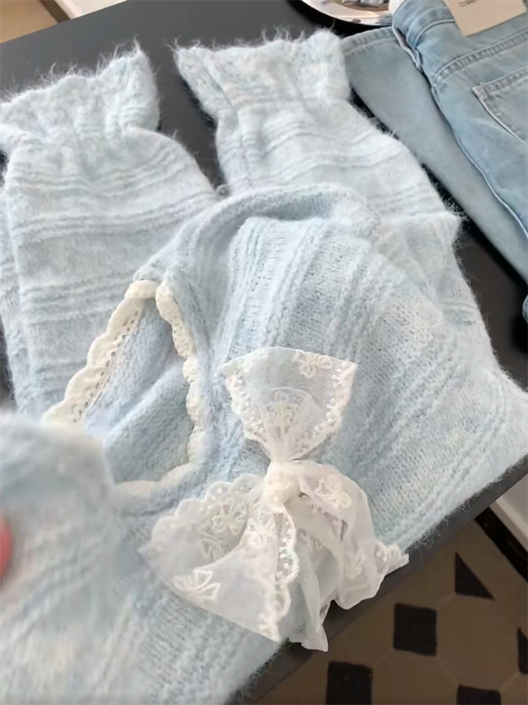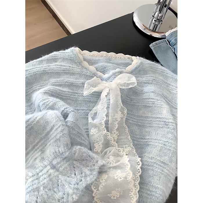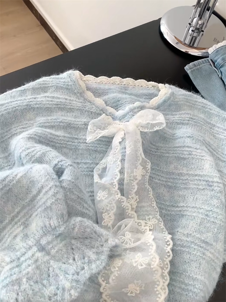 法式高級感蕾絲拼接蝴蝶結系帶毛衣女秋冬溫柔氣質V領針織衫上衣