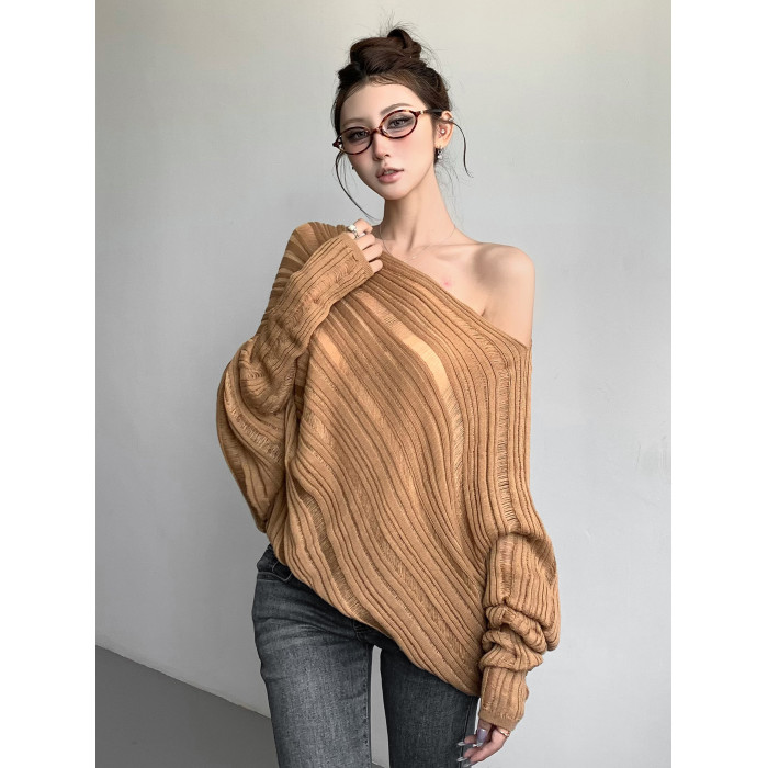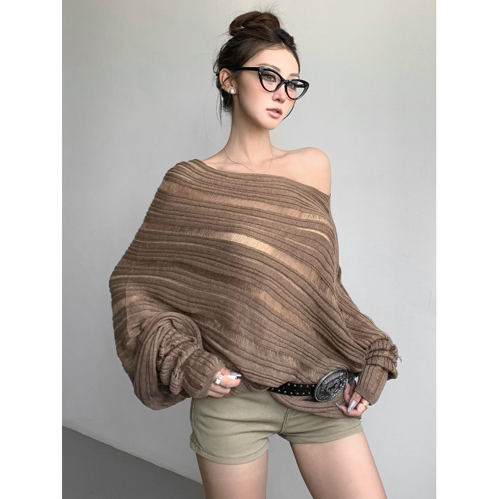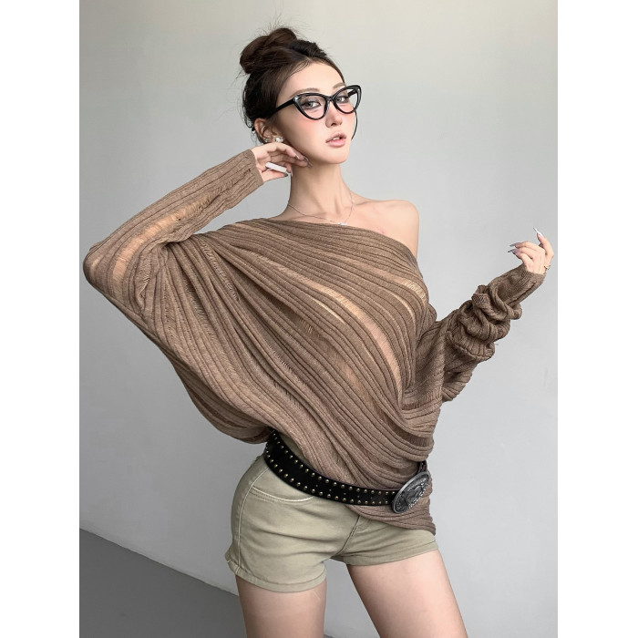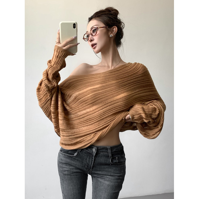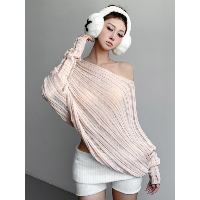斜領露肩鏤空條紋蝙蝠袖長袖針織衫女2025秋季慵懶休閒韓系上衣