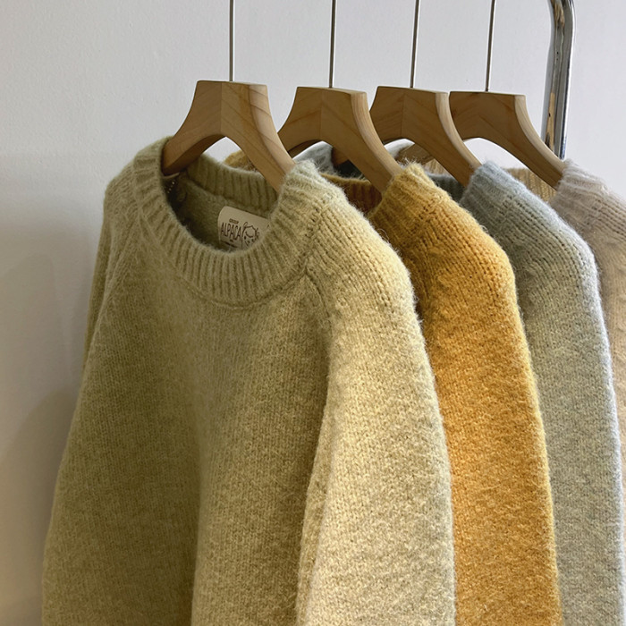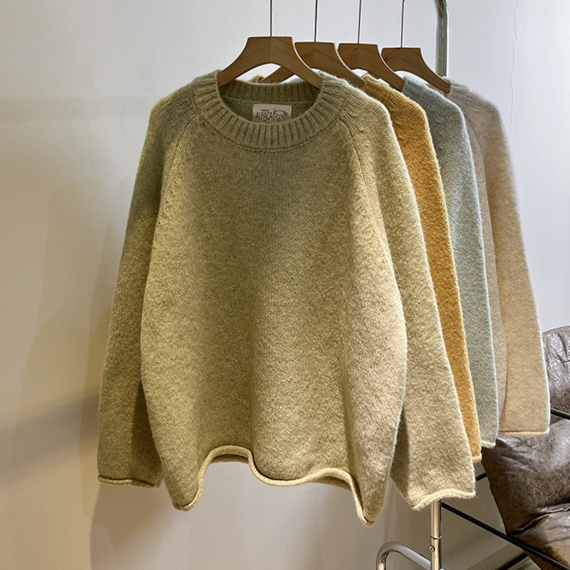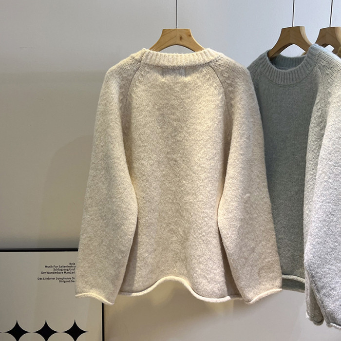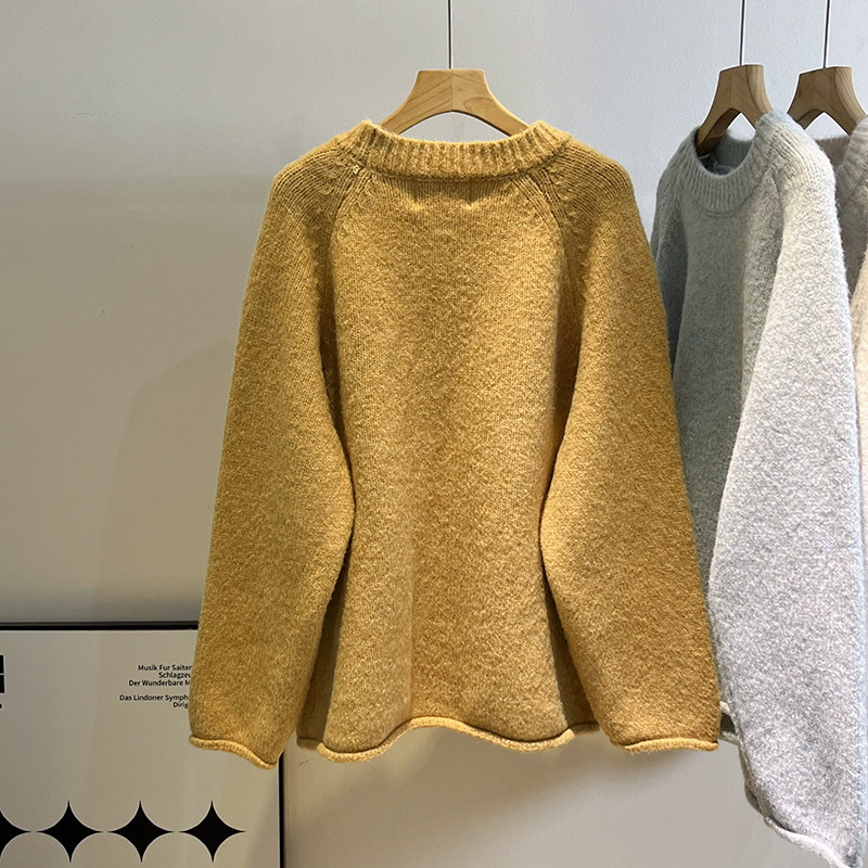 新款簡約卷邊圓領套頭毛衣女秋冬慵懶風寬松軟糯高級感針織上衣