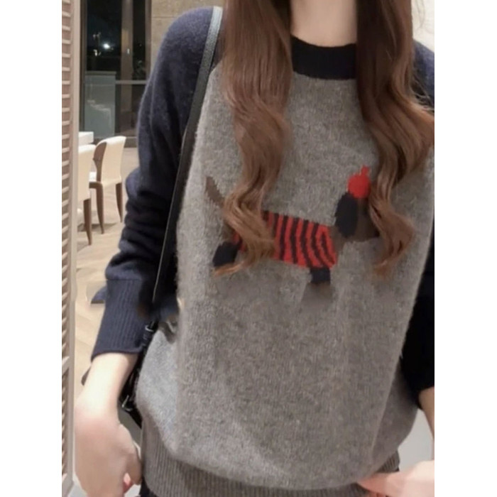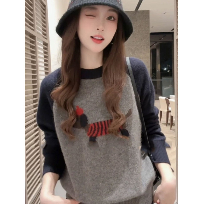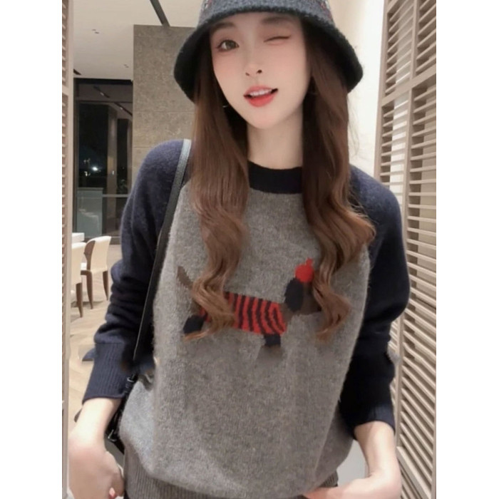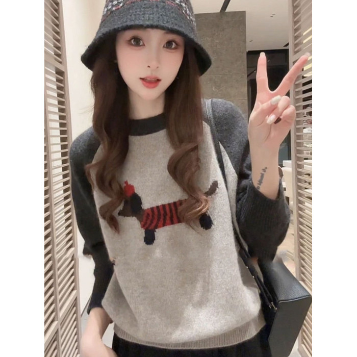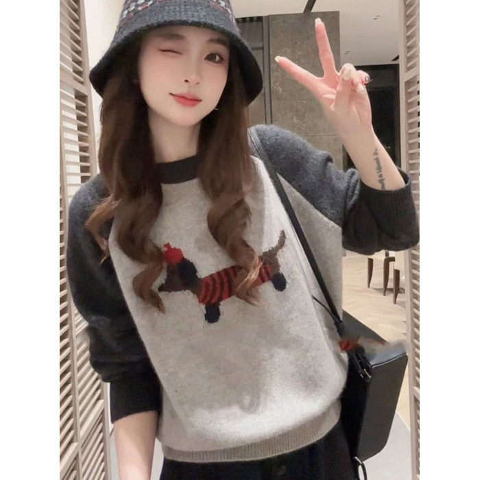 韓系氛圍感穿搭撞色刺綉小狗針織衫毛衣女秋冬新款寬松打底衫上衣
