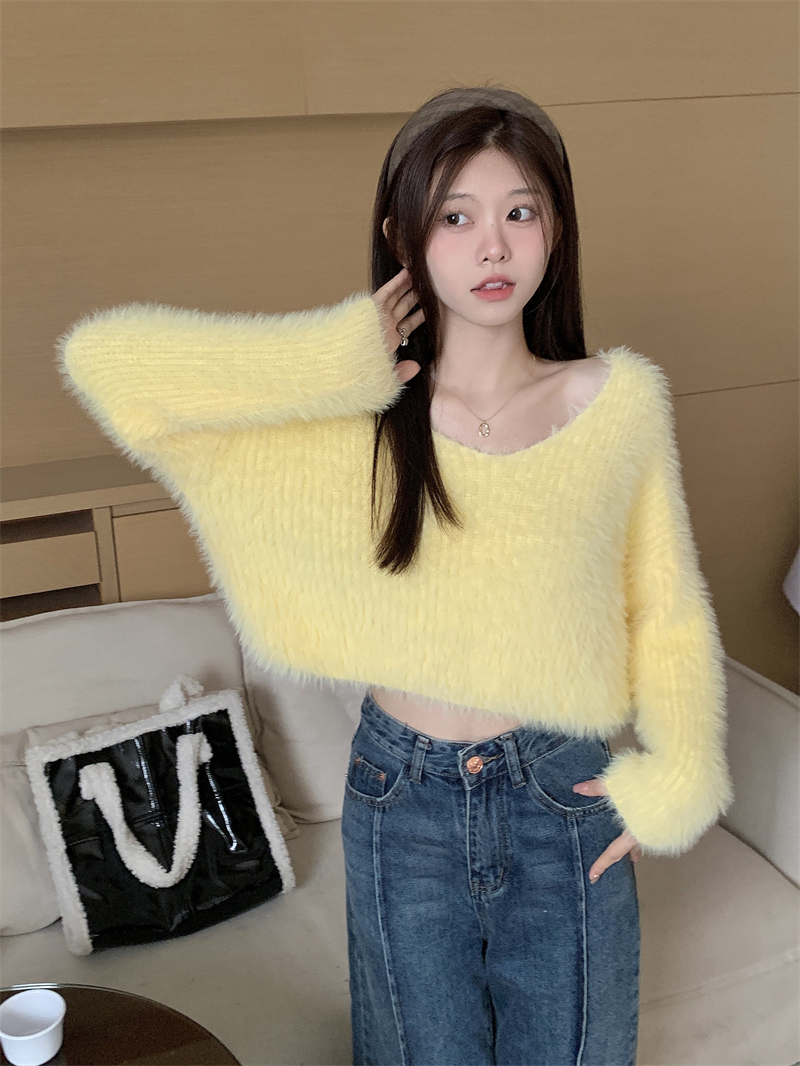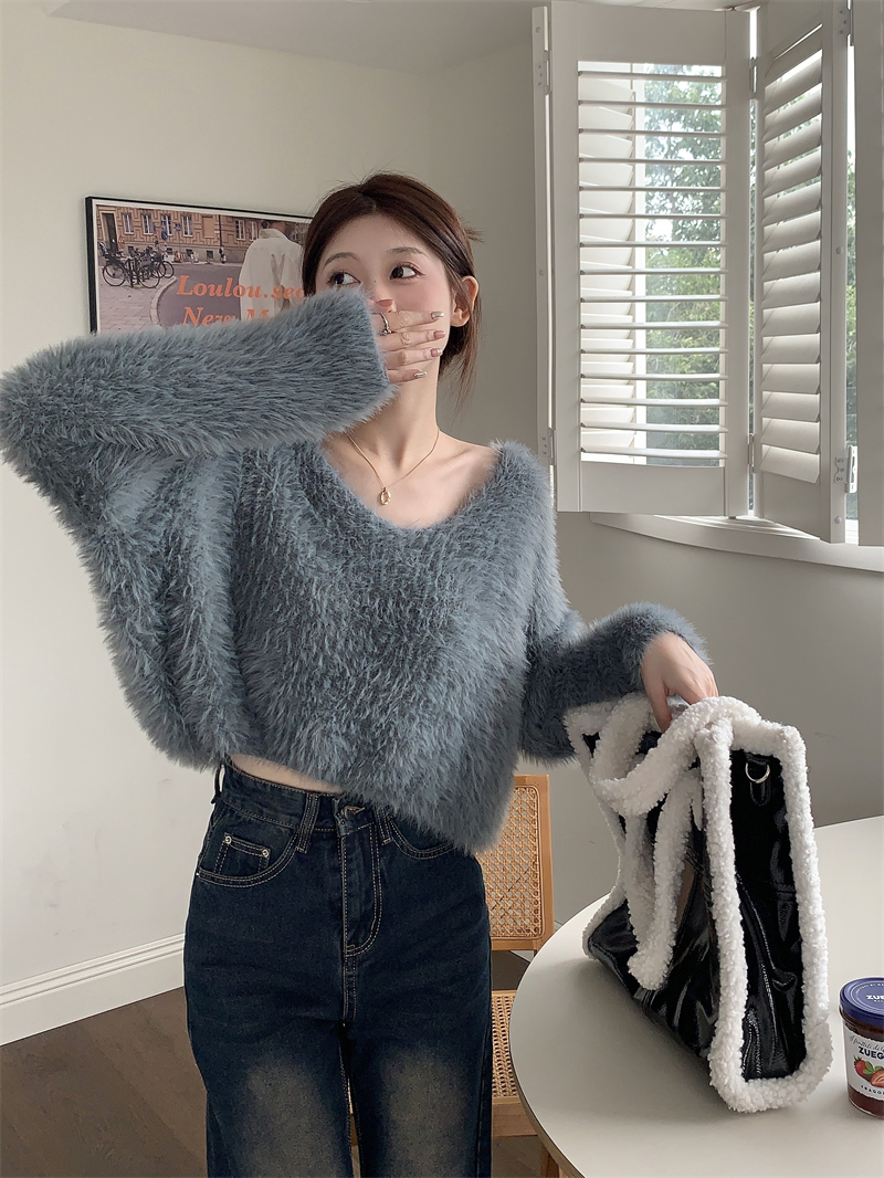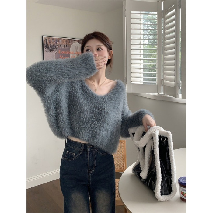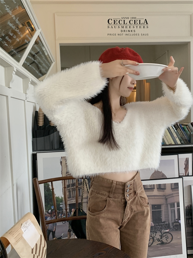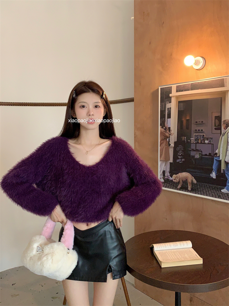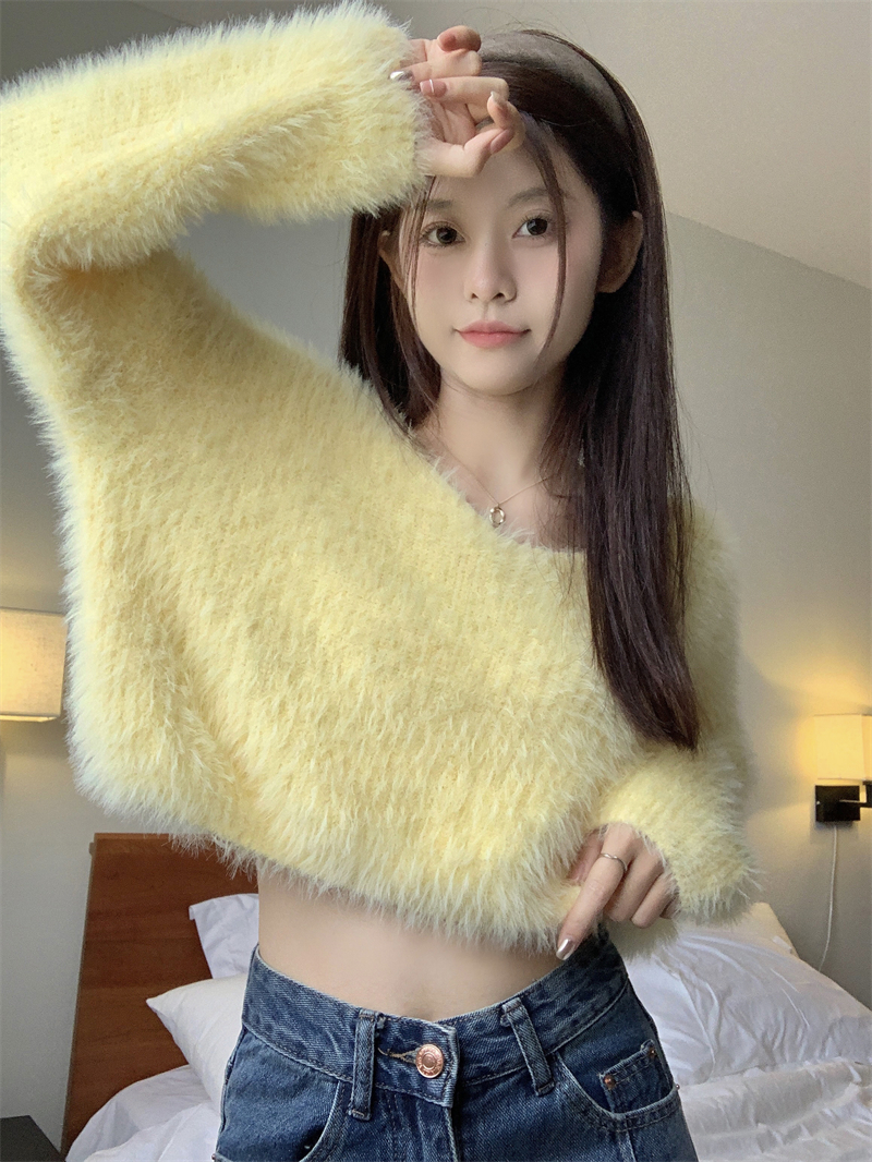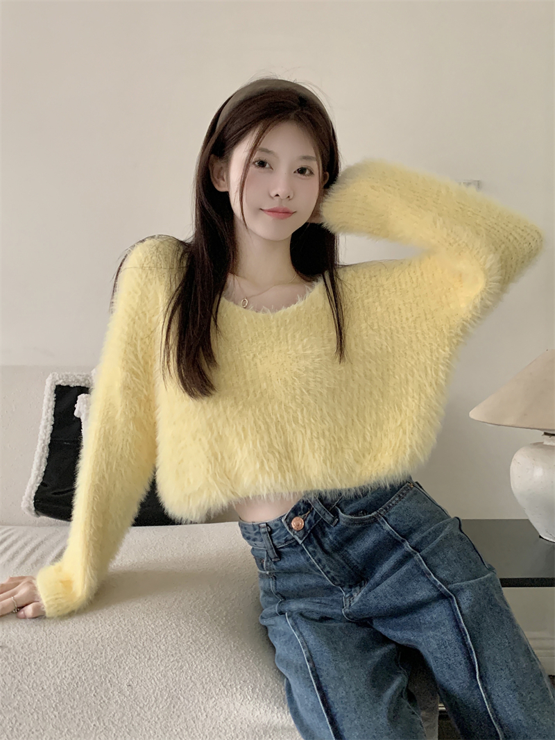 慵懶百搭仿水貂短款毛衣寬松針織衫長袖辣妹純欲風時尚超好看上衣