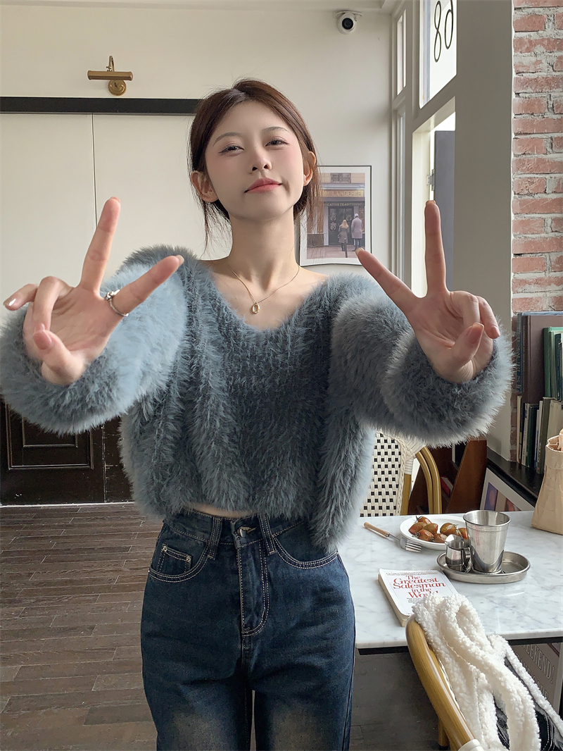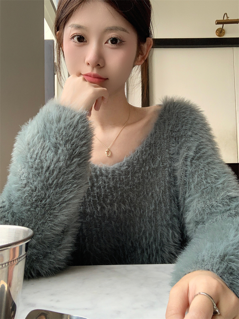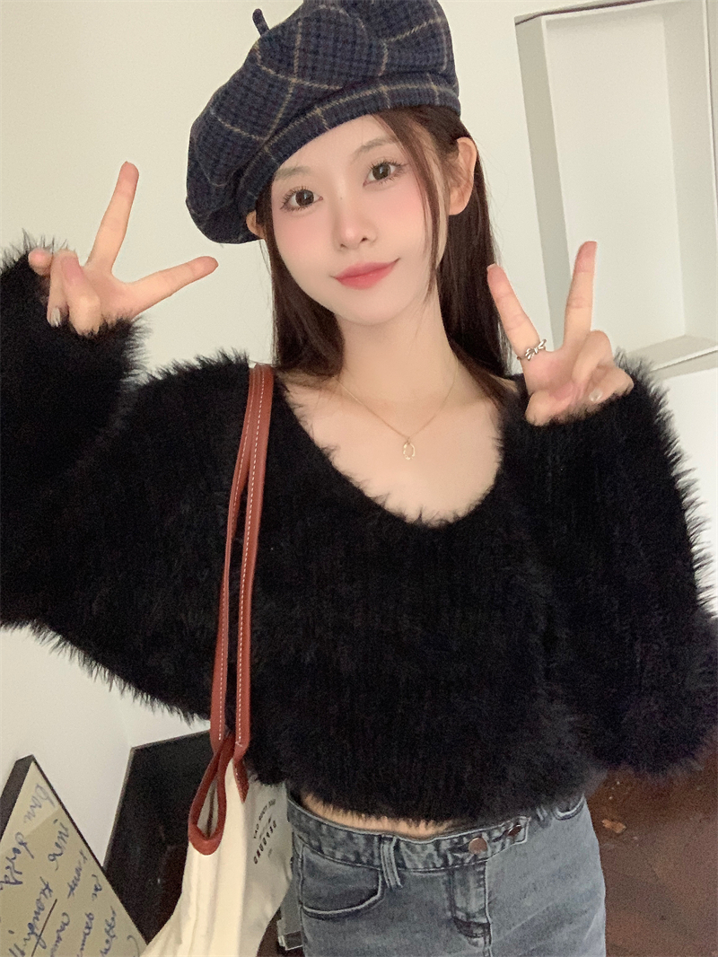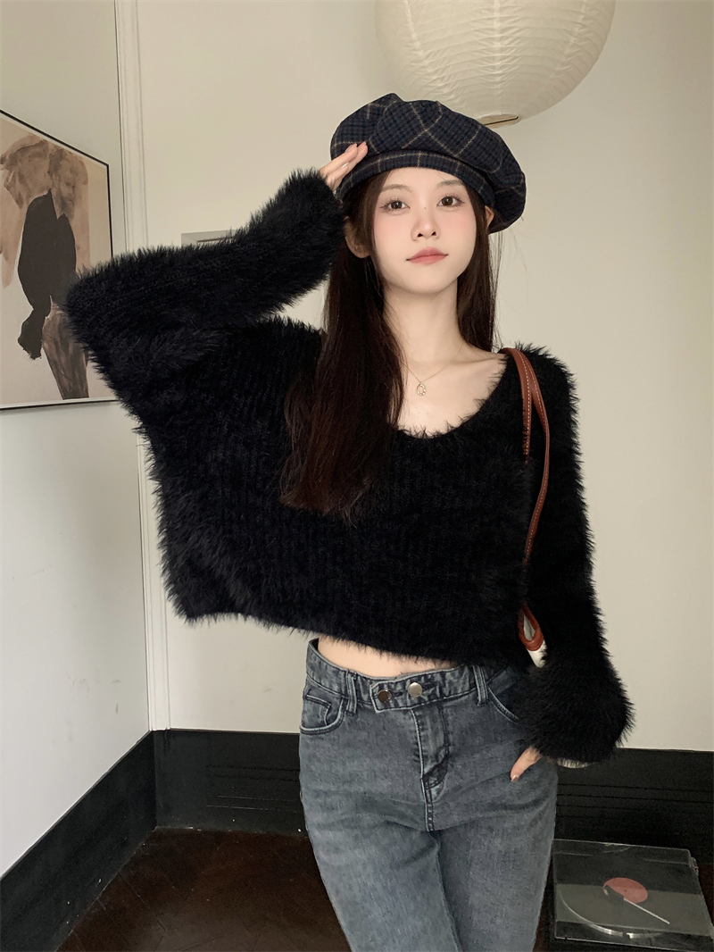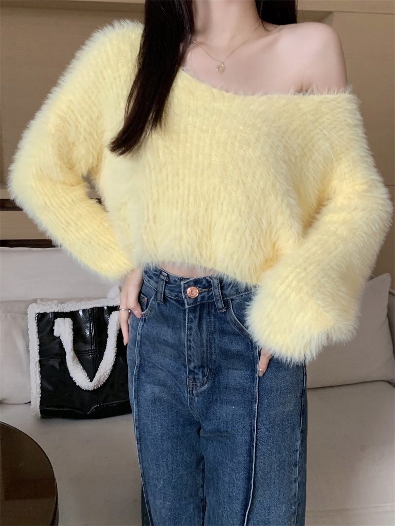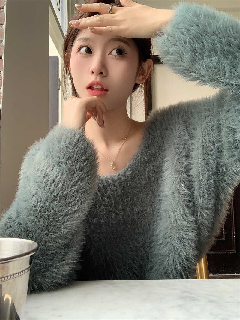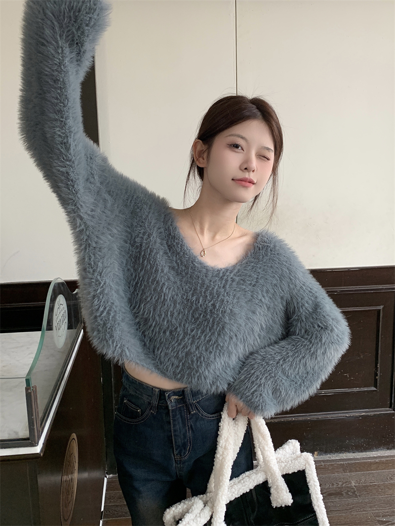 慵懶百搭仿水貂短款毛衣寬松針織衫長袖辣妹純欲風時尚超好看上衣