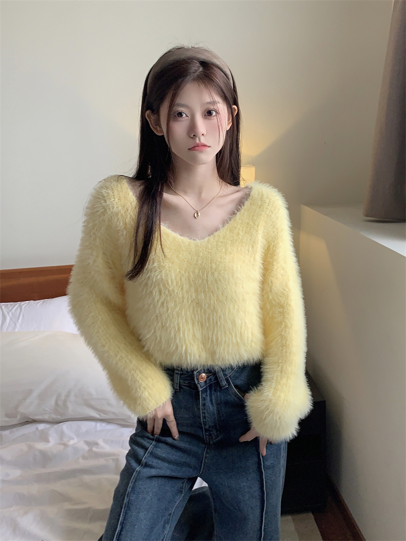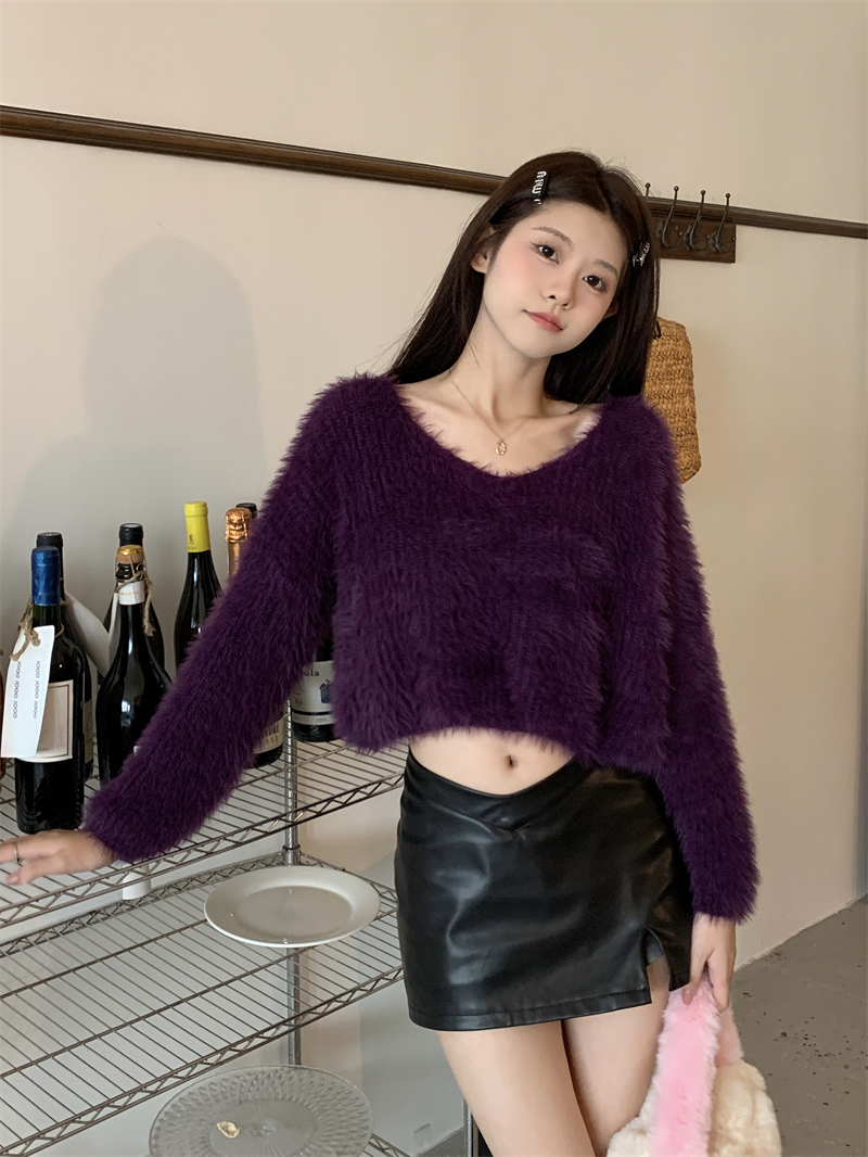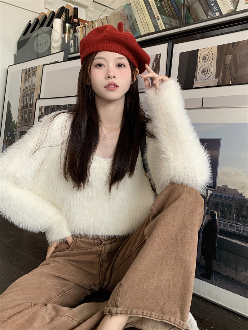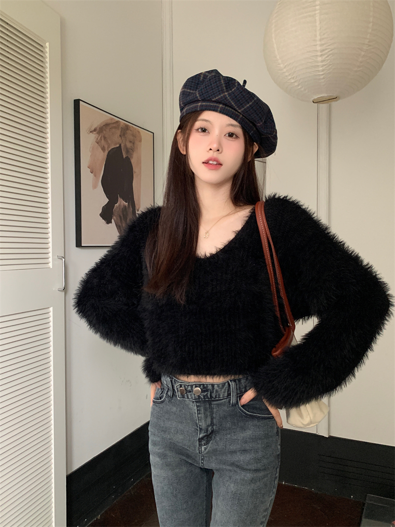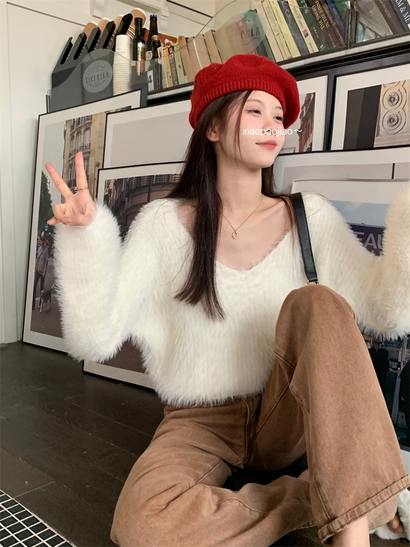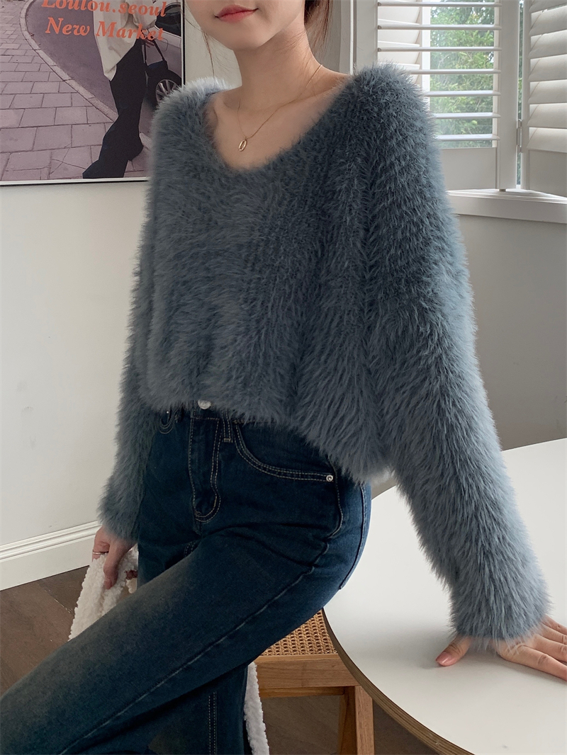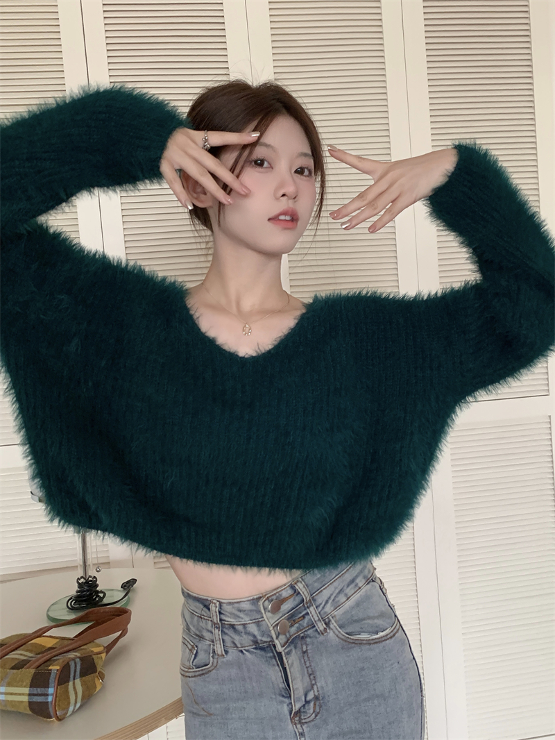 慵懶百搭仿水貂短款毛衣寬松針織衫長袖辣妹純欲風時尚超好看上衣
