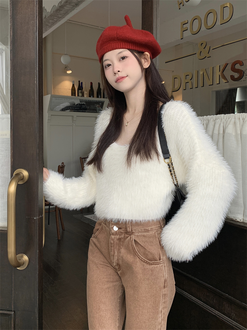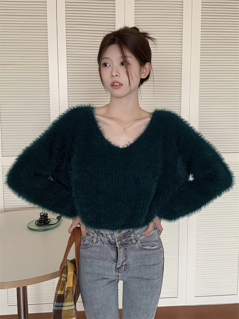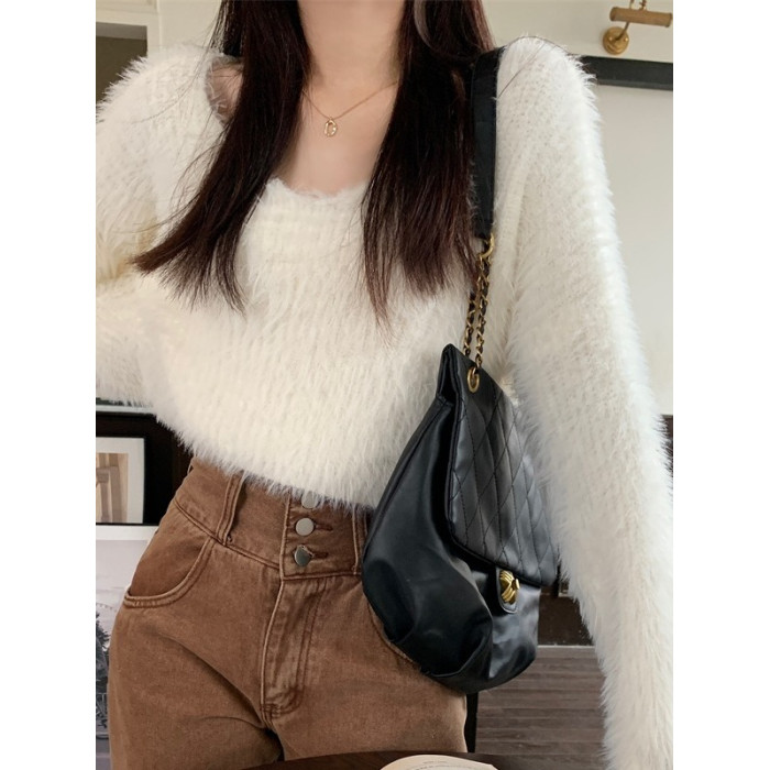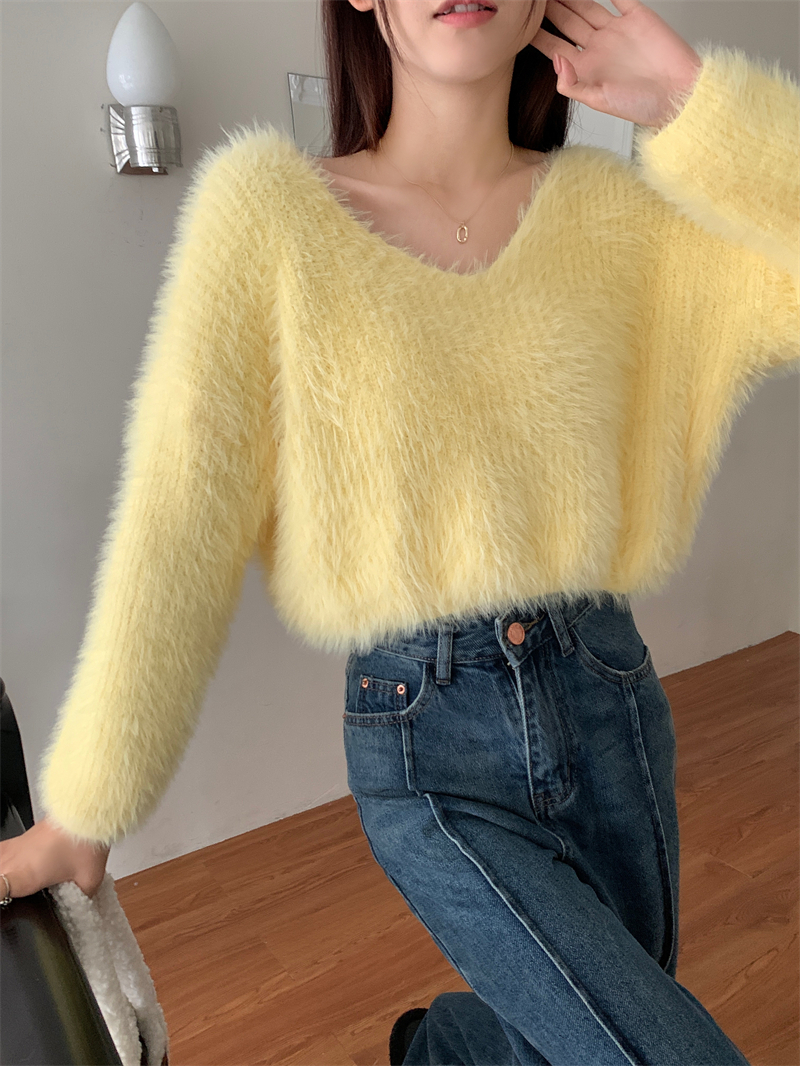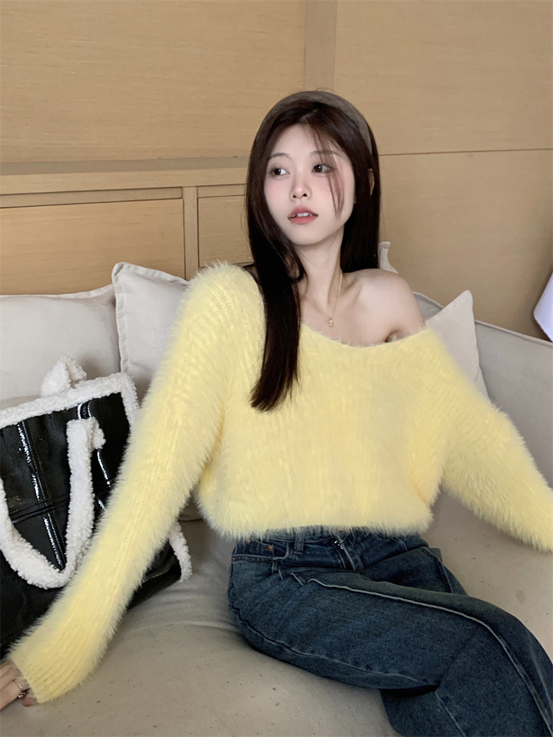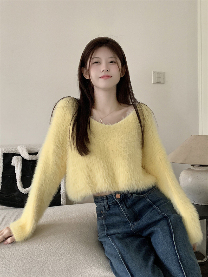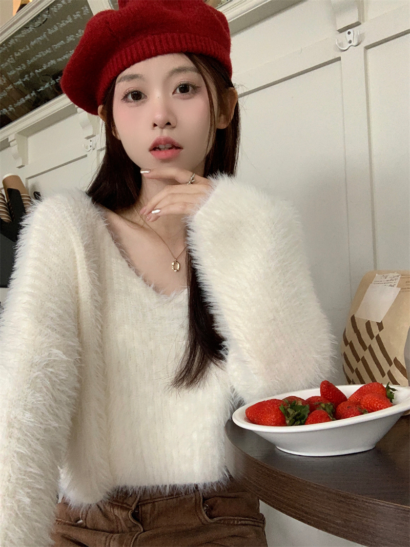 慵懶百搭仿水貂短款毛衣寬松針織衫長袖辣妹純欲風時尚超好看上衣