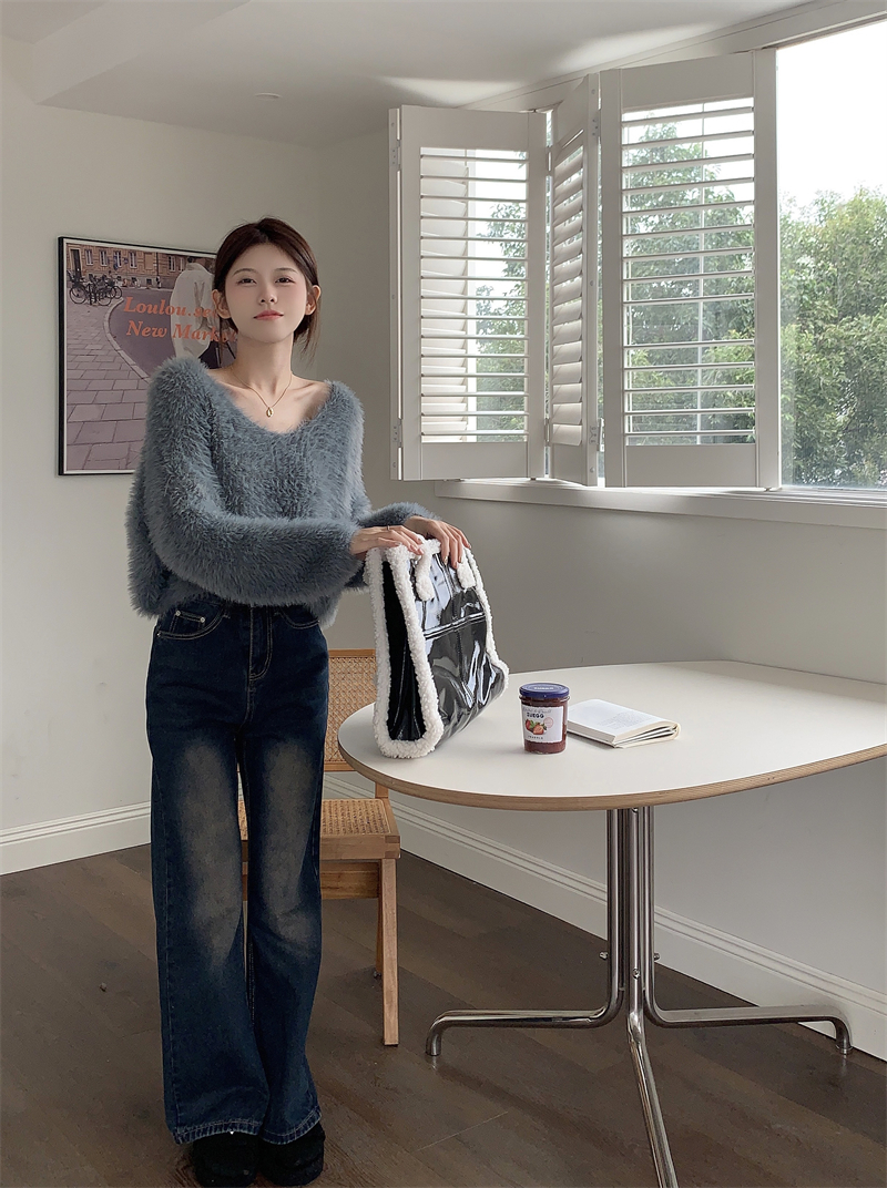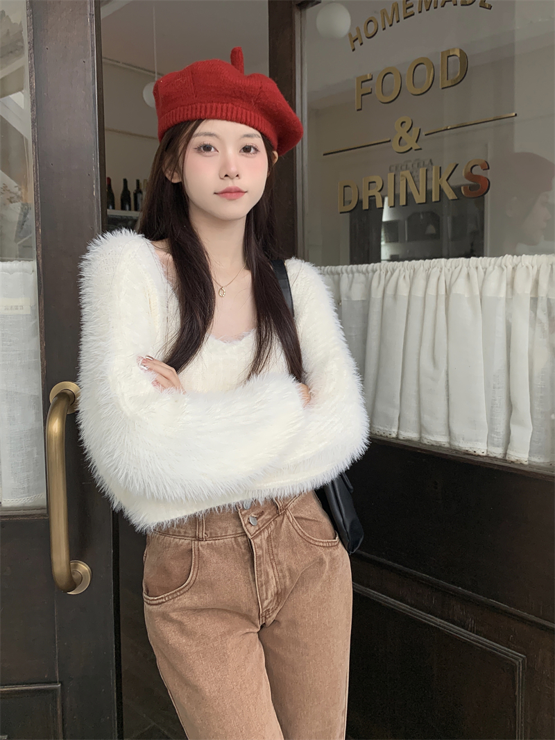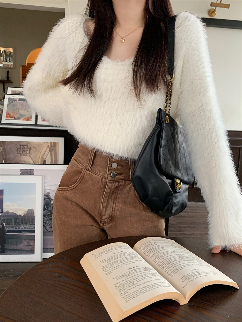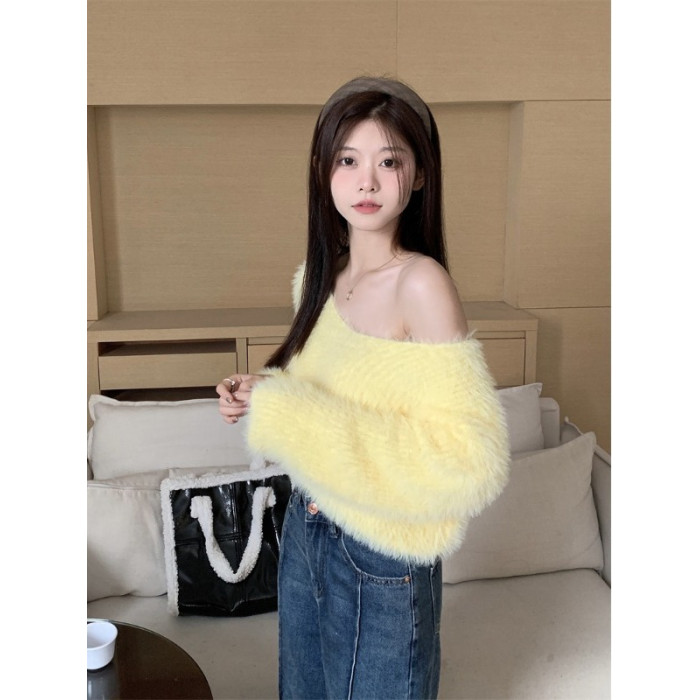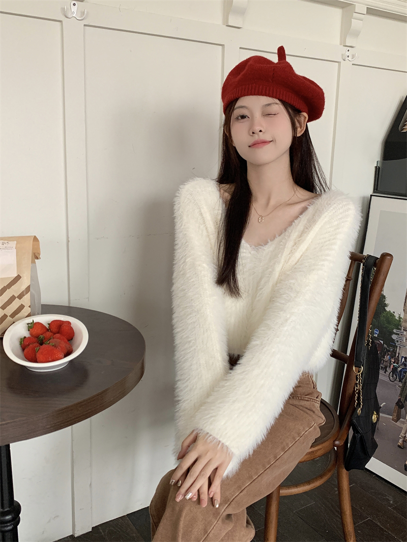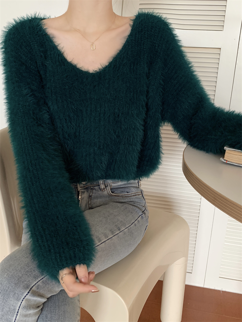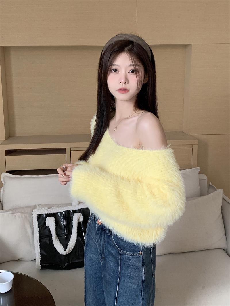 慵懶百搭仿水貂短款毛衣寬松針織衫長袖辣妹純欲風時尚超好看上衣