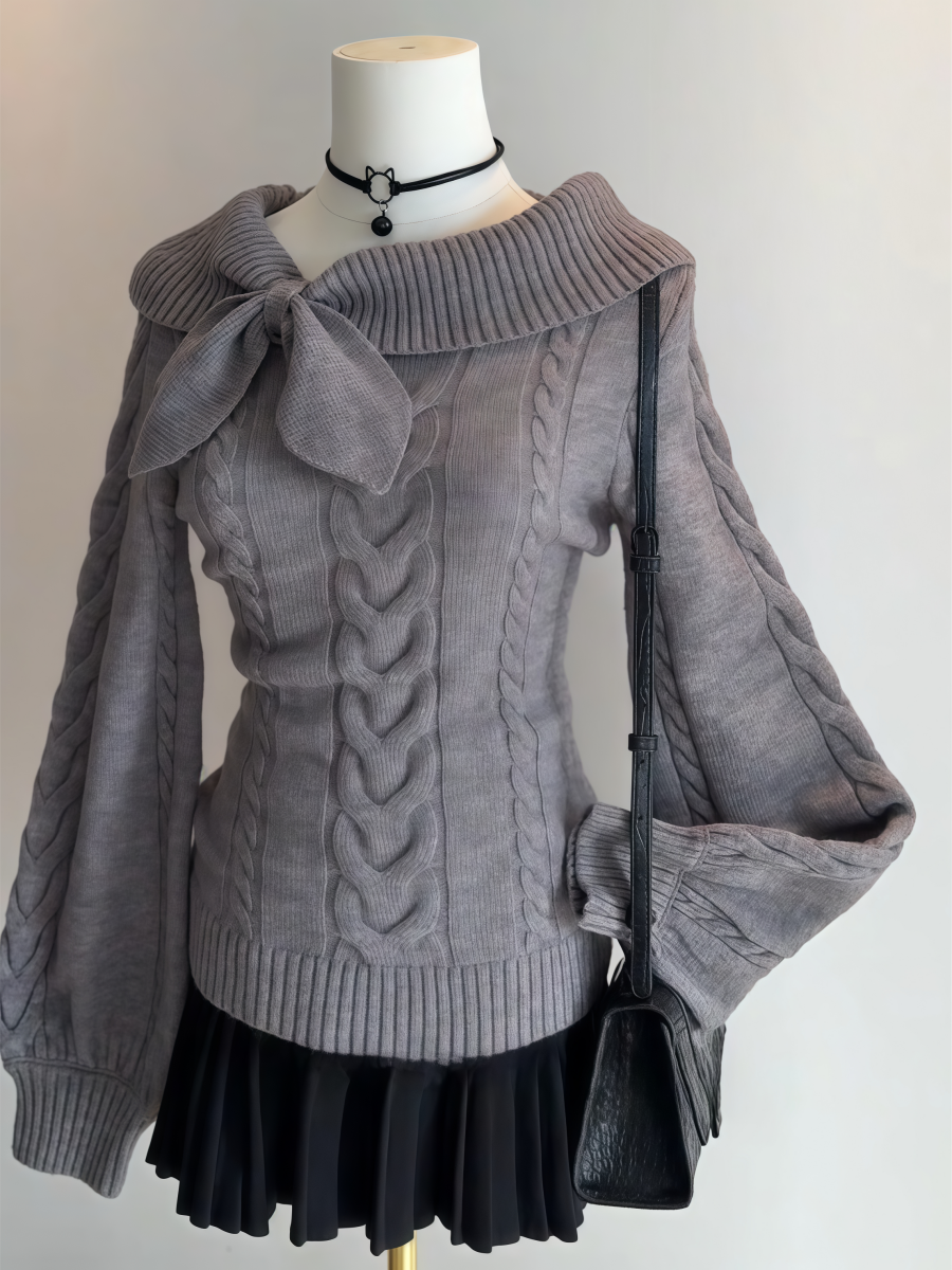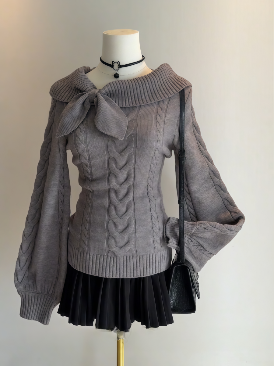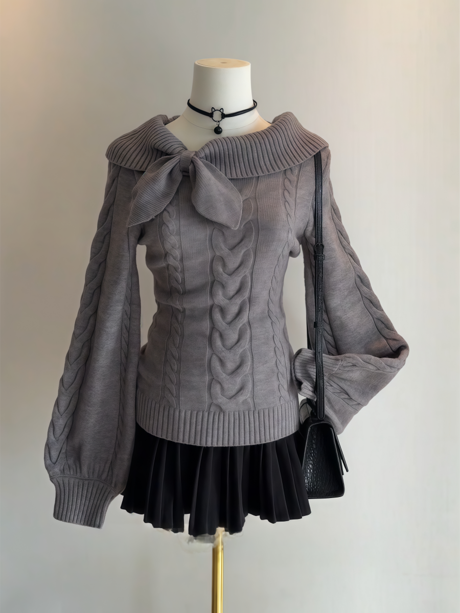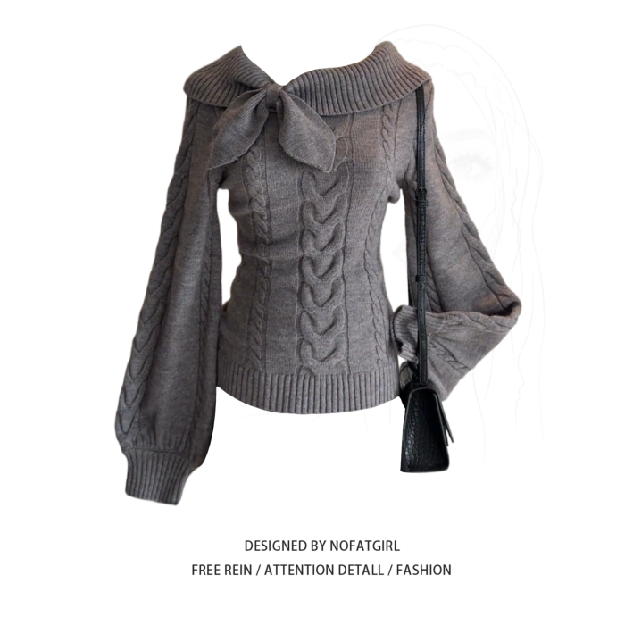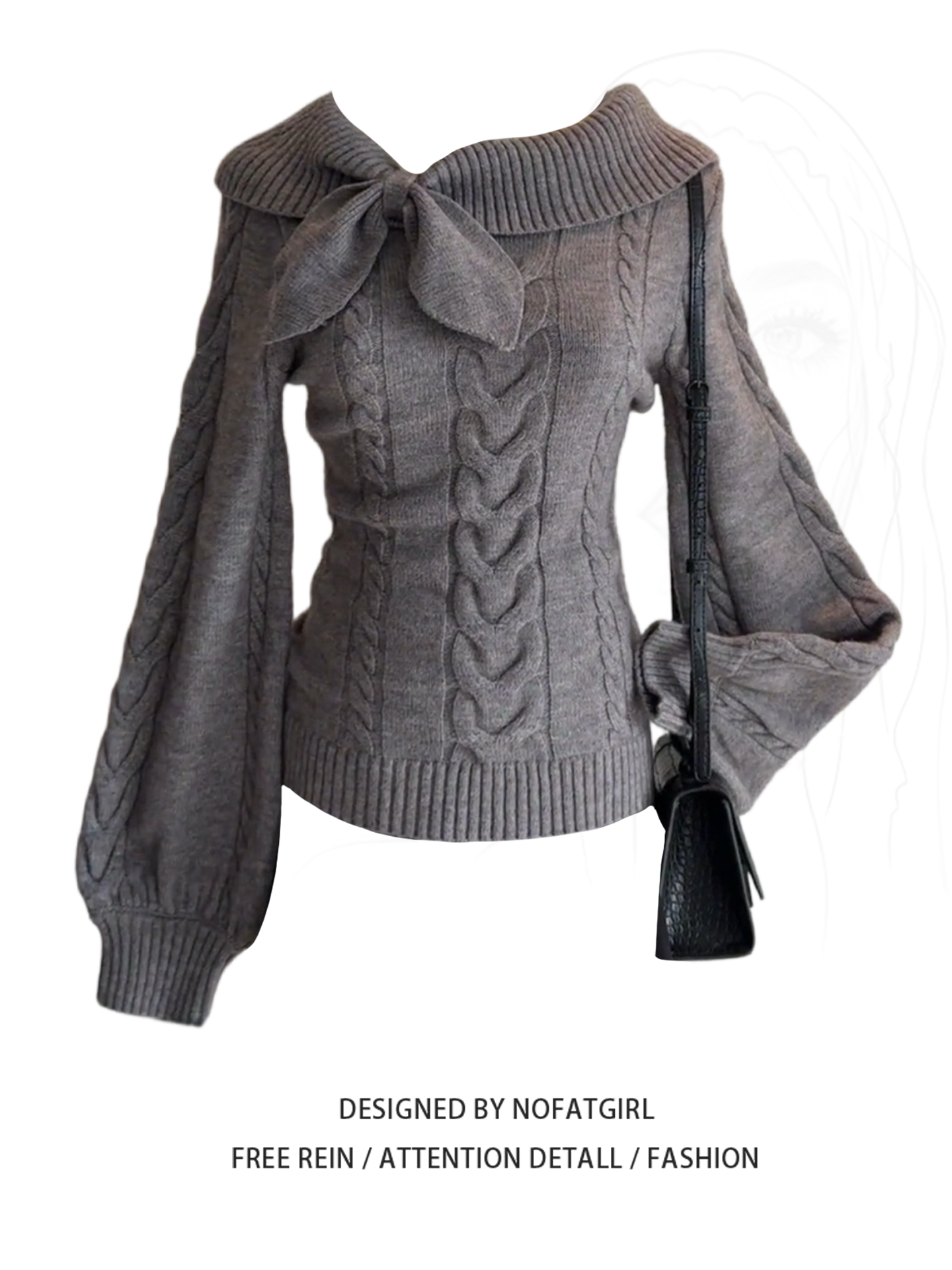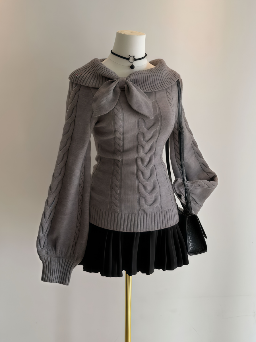 大碼胖MM甜美少女風蝴蝶結領針織衫女灰色燈籠袖收腰顯瘦百搭毛衣