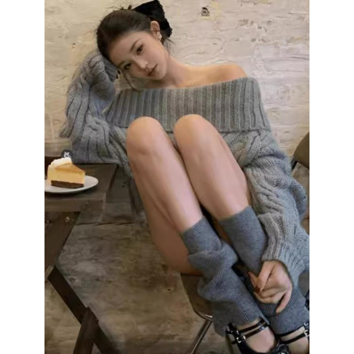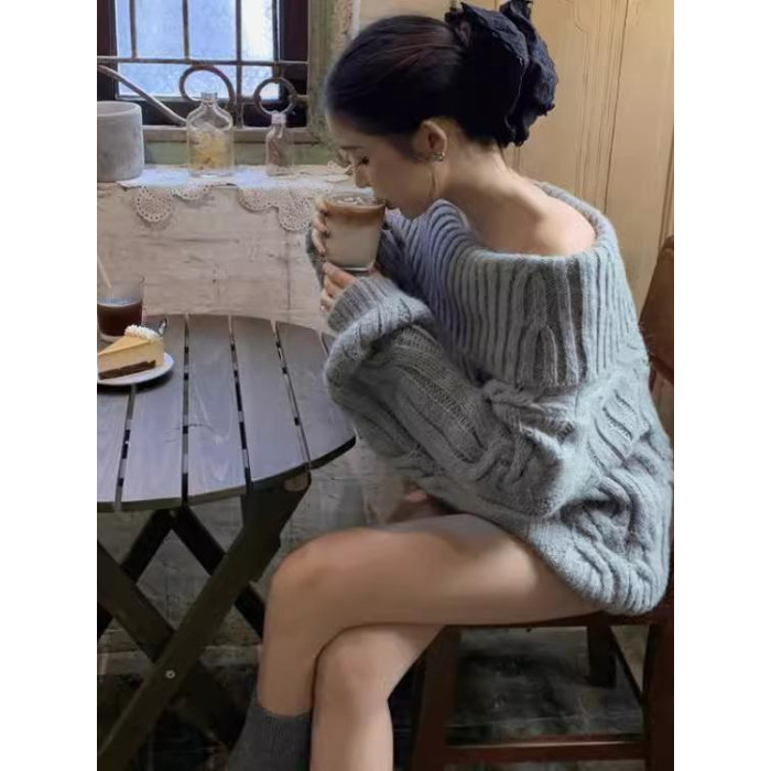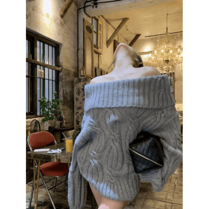 一字肩套頭毛衣女秋季慵懶風氣質小個子寬松休閒顯瘦百搭長袖上衣