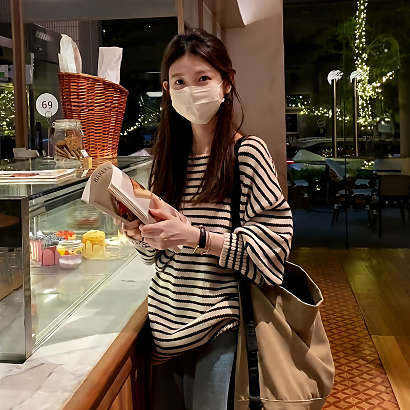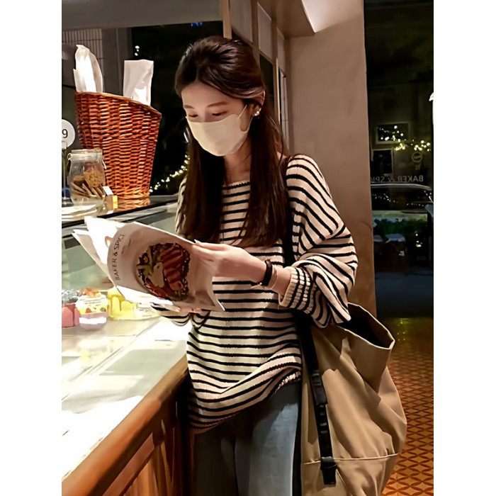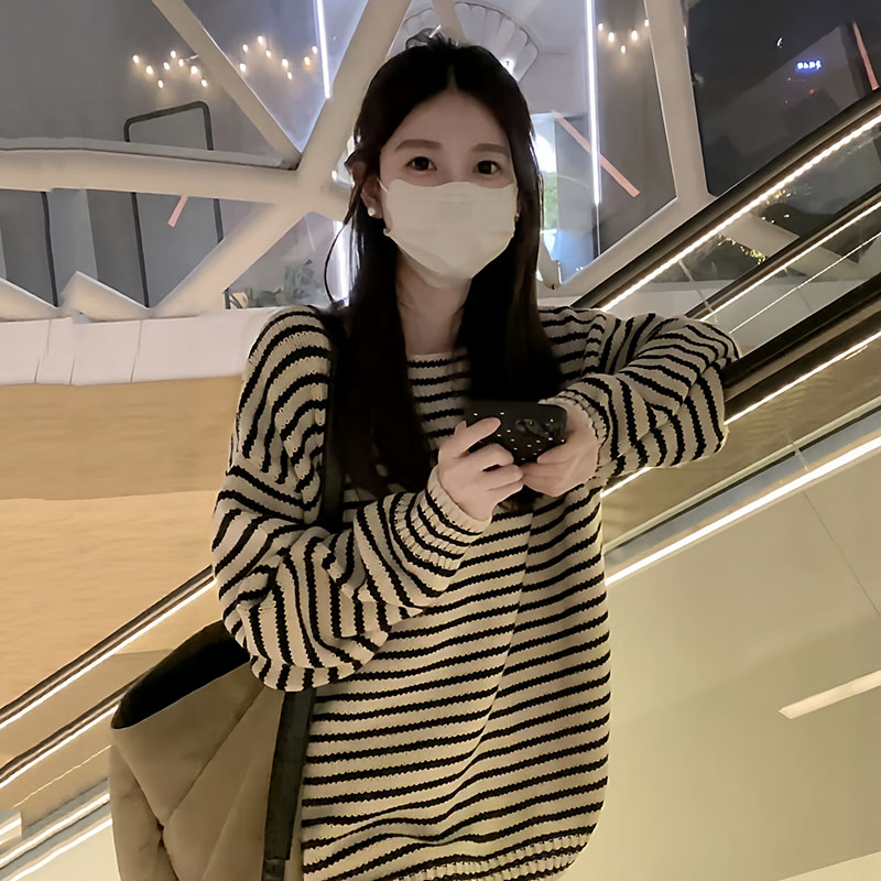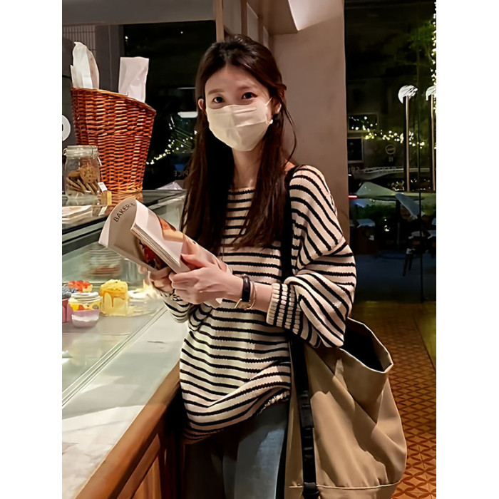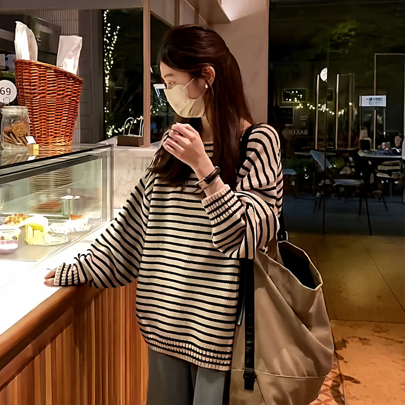 大碼慵懶風軟糯圓領條紋套頭毛衣女秋季新款胖mm寬松顯瘦韓系上衣
