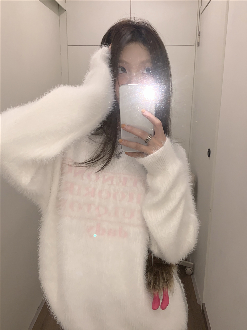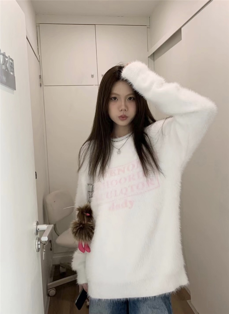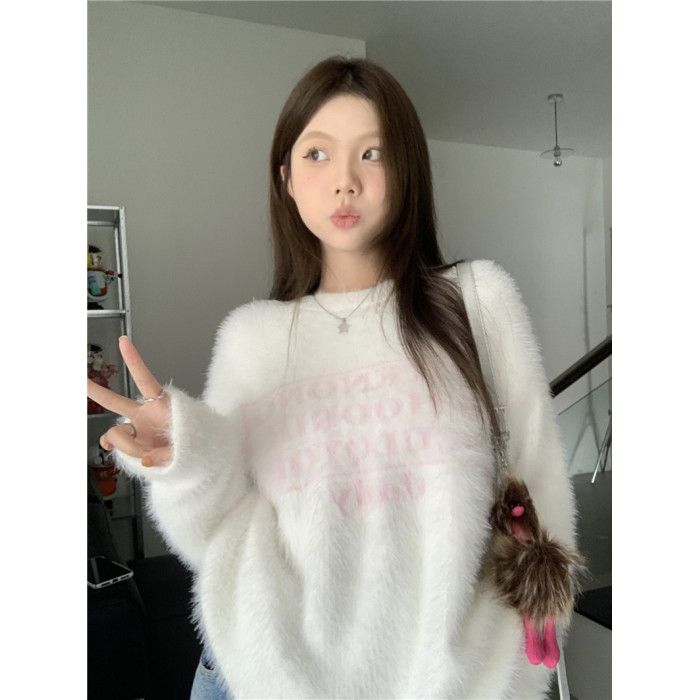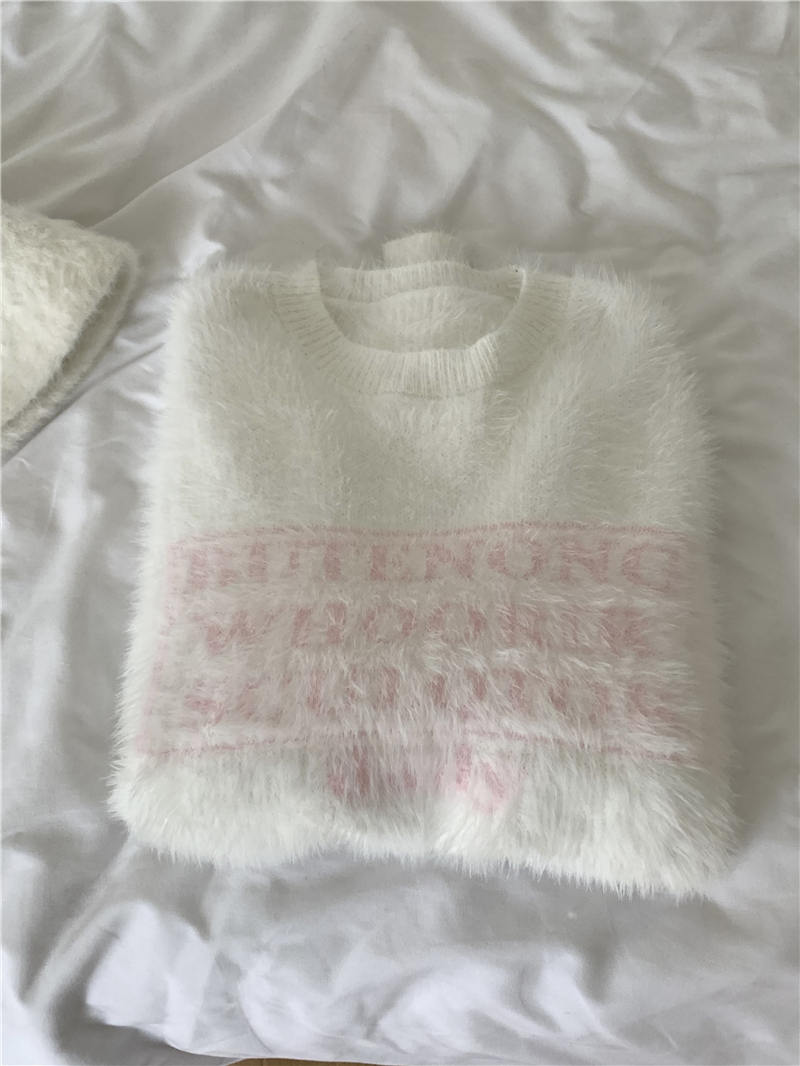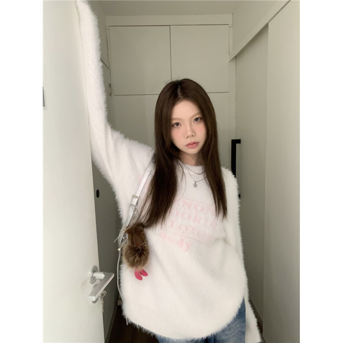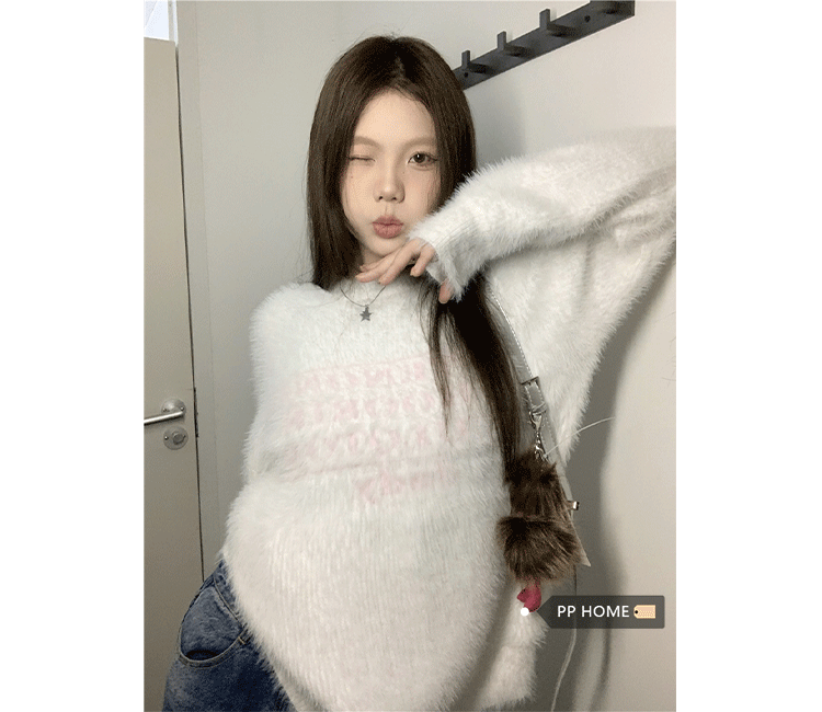 PPHOME軟糯字母提花仿貂毛白色毛衣女秋季溫柔寬松圓領針織衫上衣