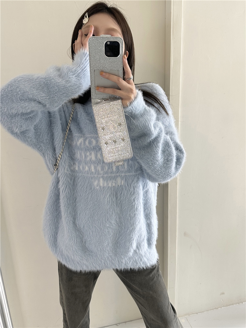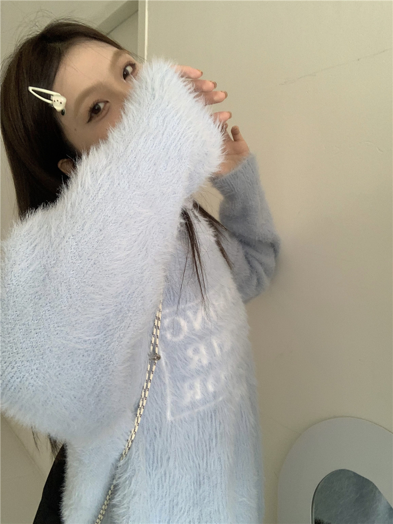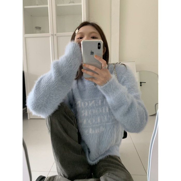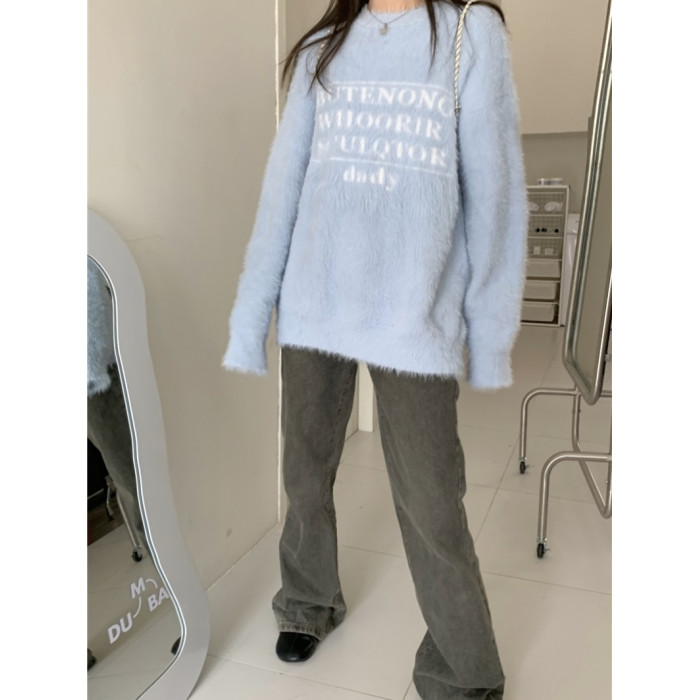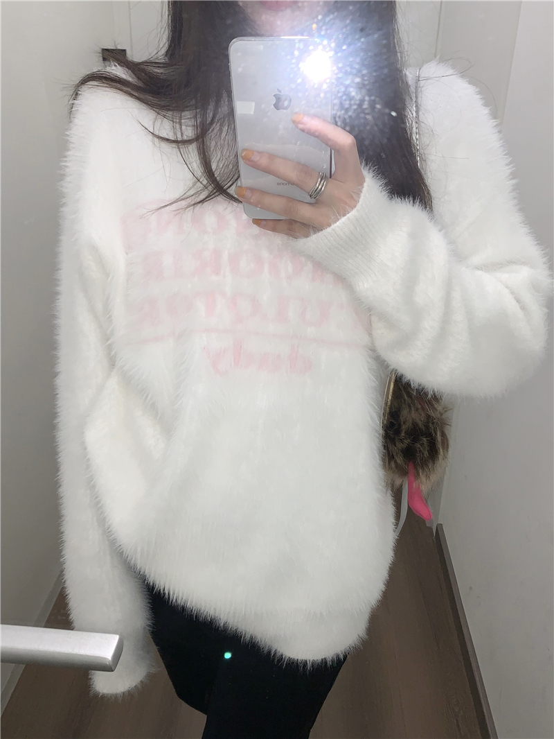 PPHOME軟糯字母提花仿貂毛白色毛衣女秋季溫柔寬松圓領針織衫上衣